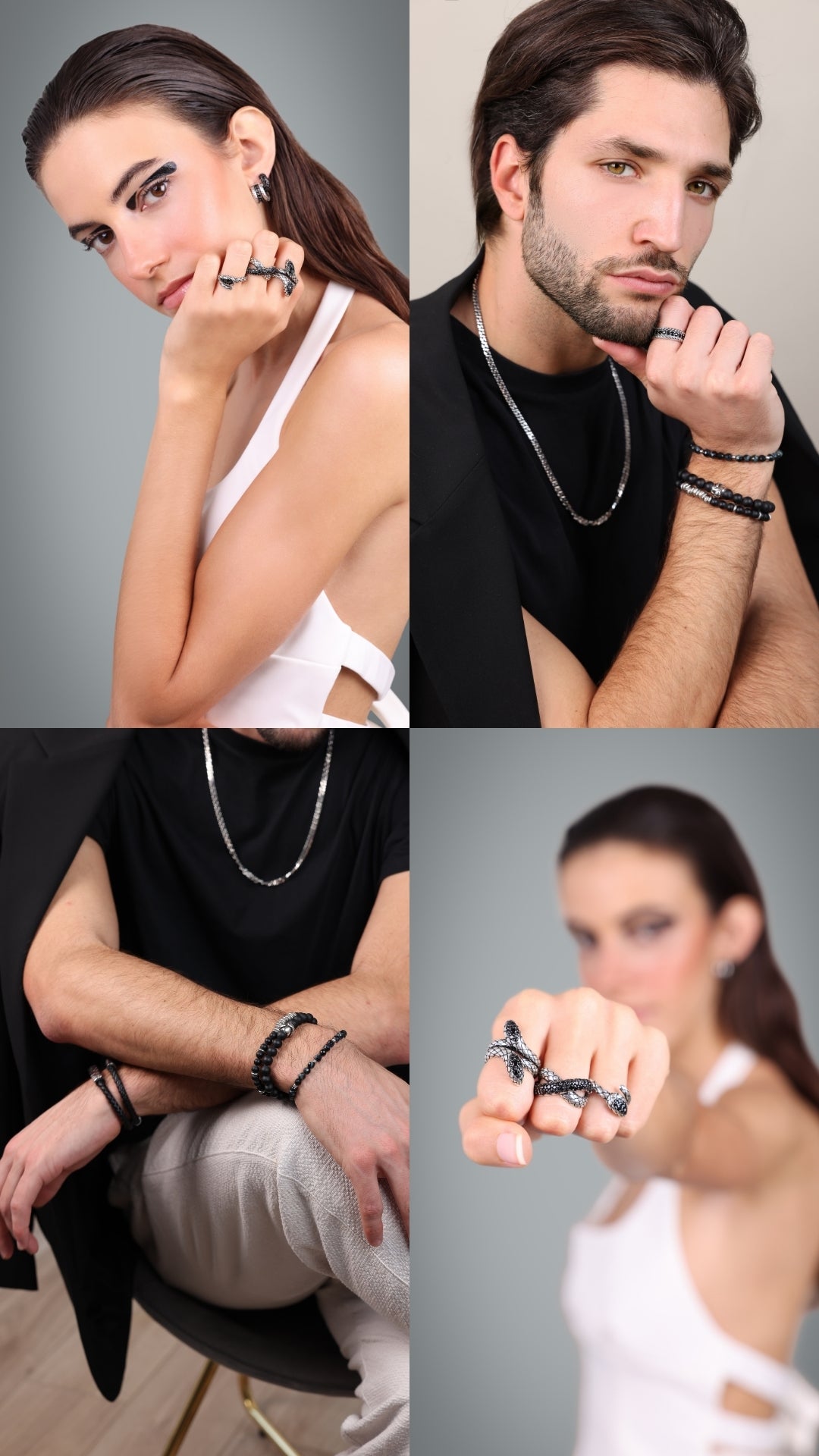 Gioielli Made in Italy realizzati in argento 925, materiale pregiato che viene reso unico grazie alla finitura “Ink Texture”: tecnica esclusiva che permette di creare un effetto definito e impeccabile alla colorazione e un’ultra-definizione della superficie, donando a ogni creazione un’atmosfera misteriosa, lucente e ricca di dettaglio.