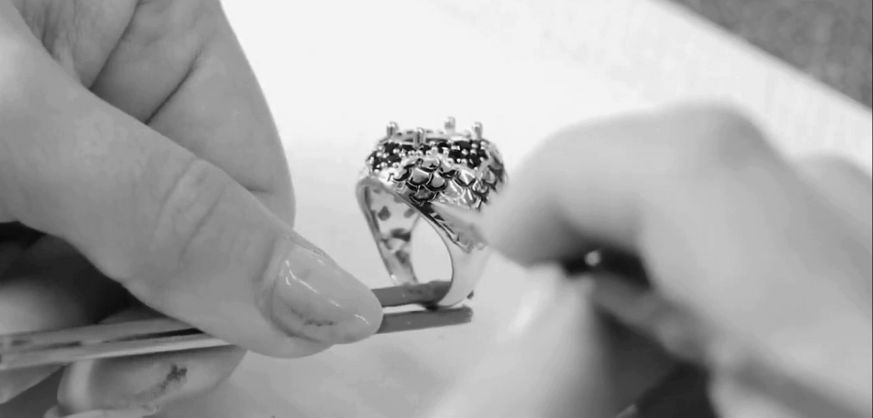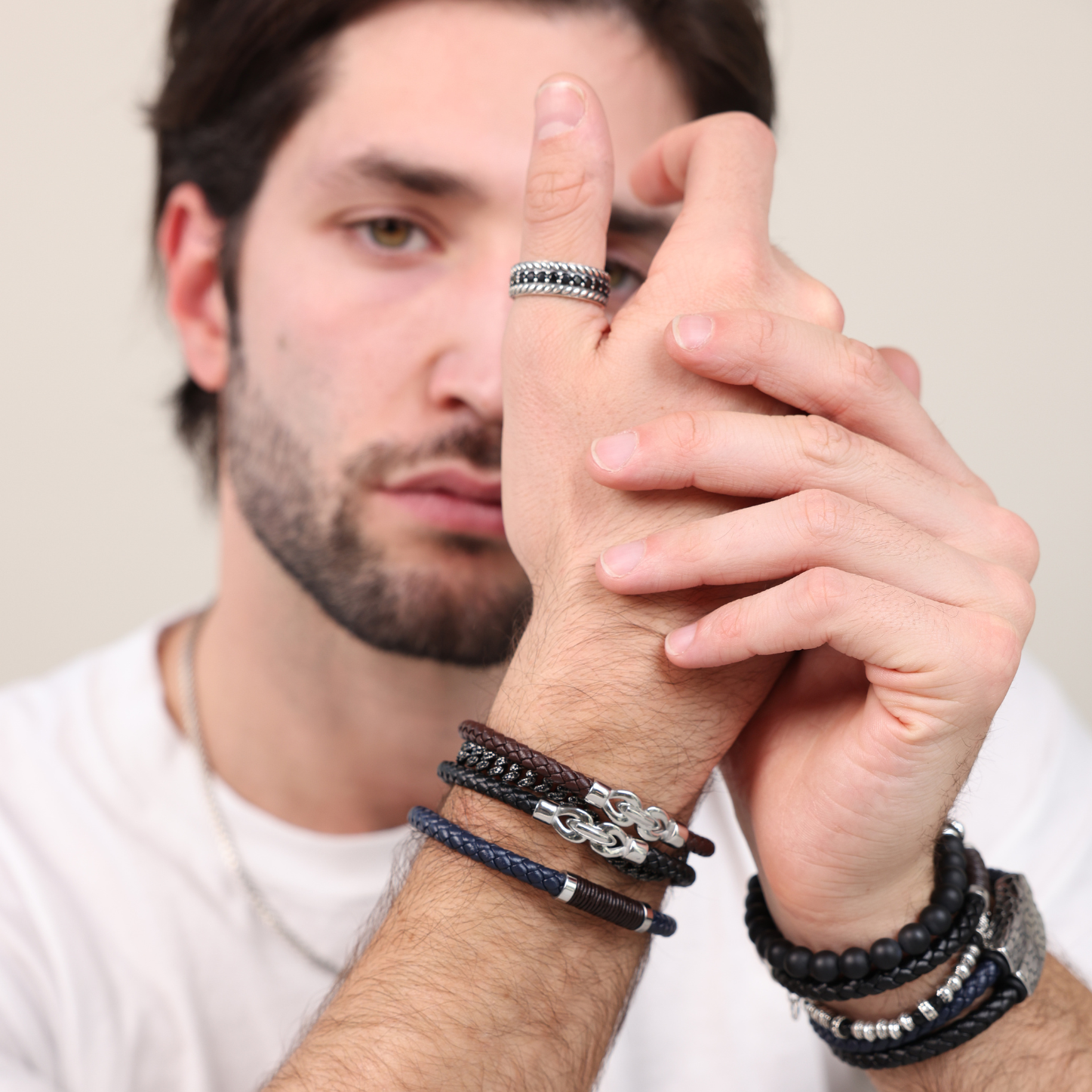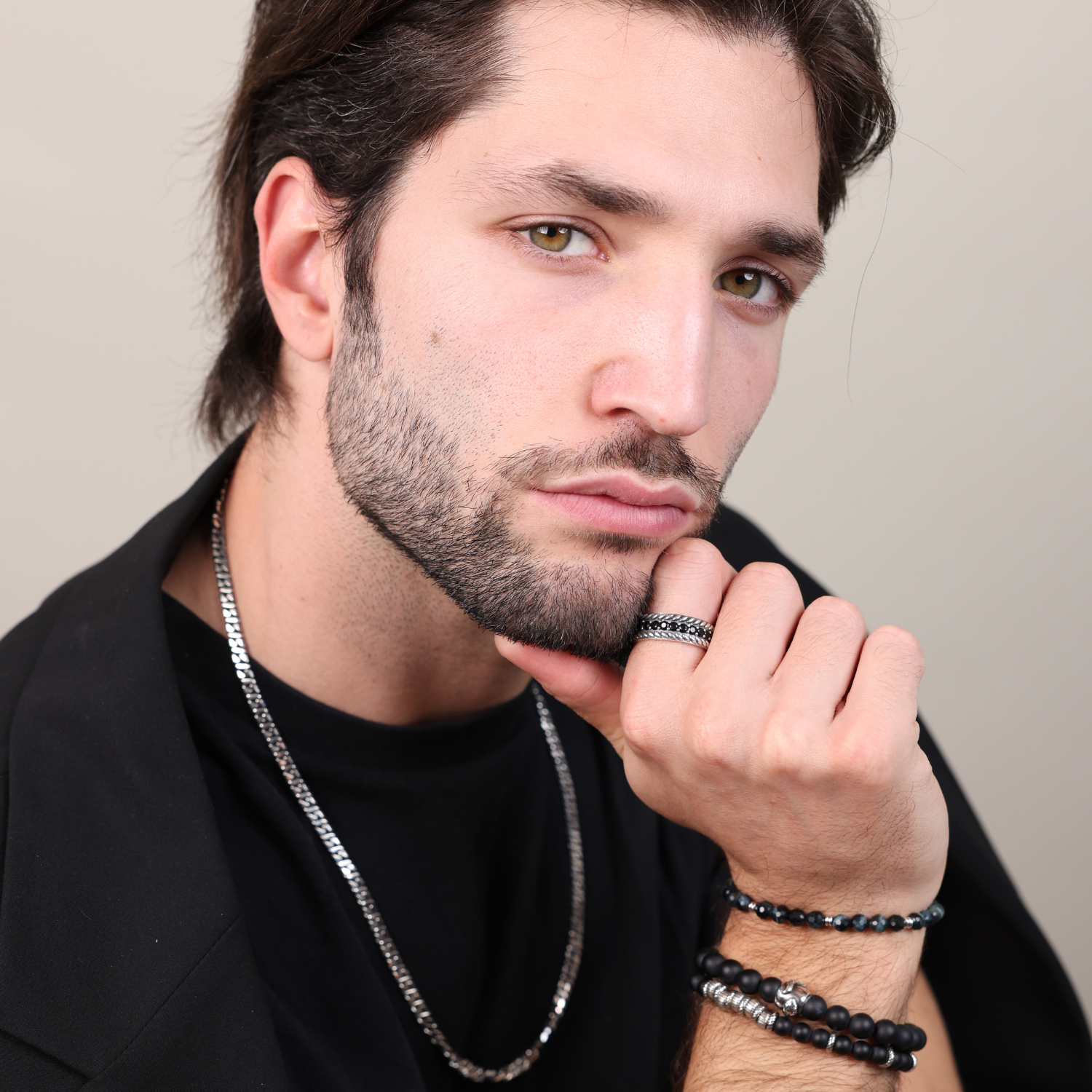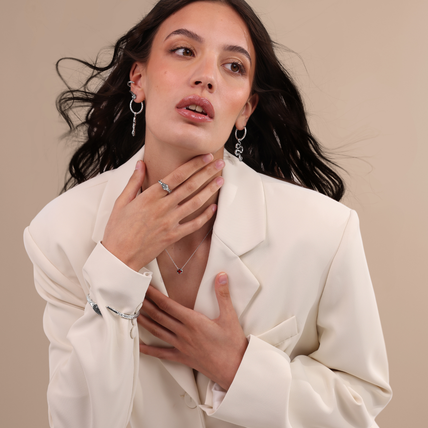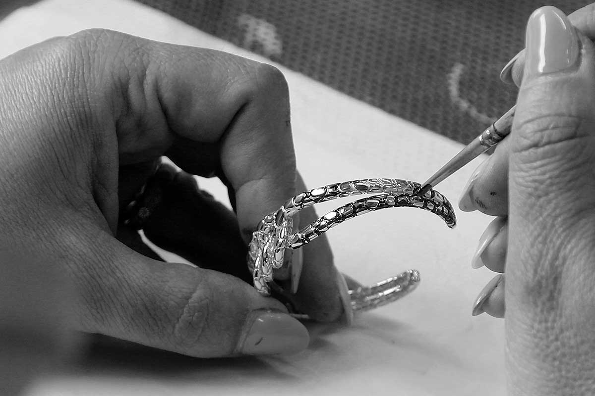 Gioielli Made in Italy realizzati in argento 925, materiale pregiato che viene reso unico grazie alla finitura “Ink Texture”: tecnica esclusiva che permette di creare un effetto definito e impeccabile alla colorazione e un’ultra-definizione della superficie, donando a ogni creazione un’atmosfera misteriosa, lucente e ricca di dettaglio.