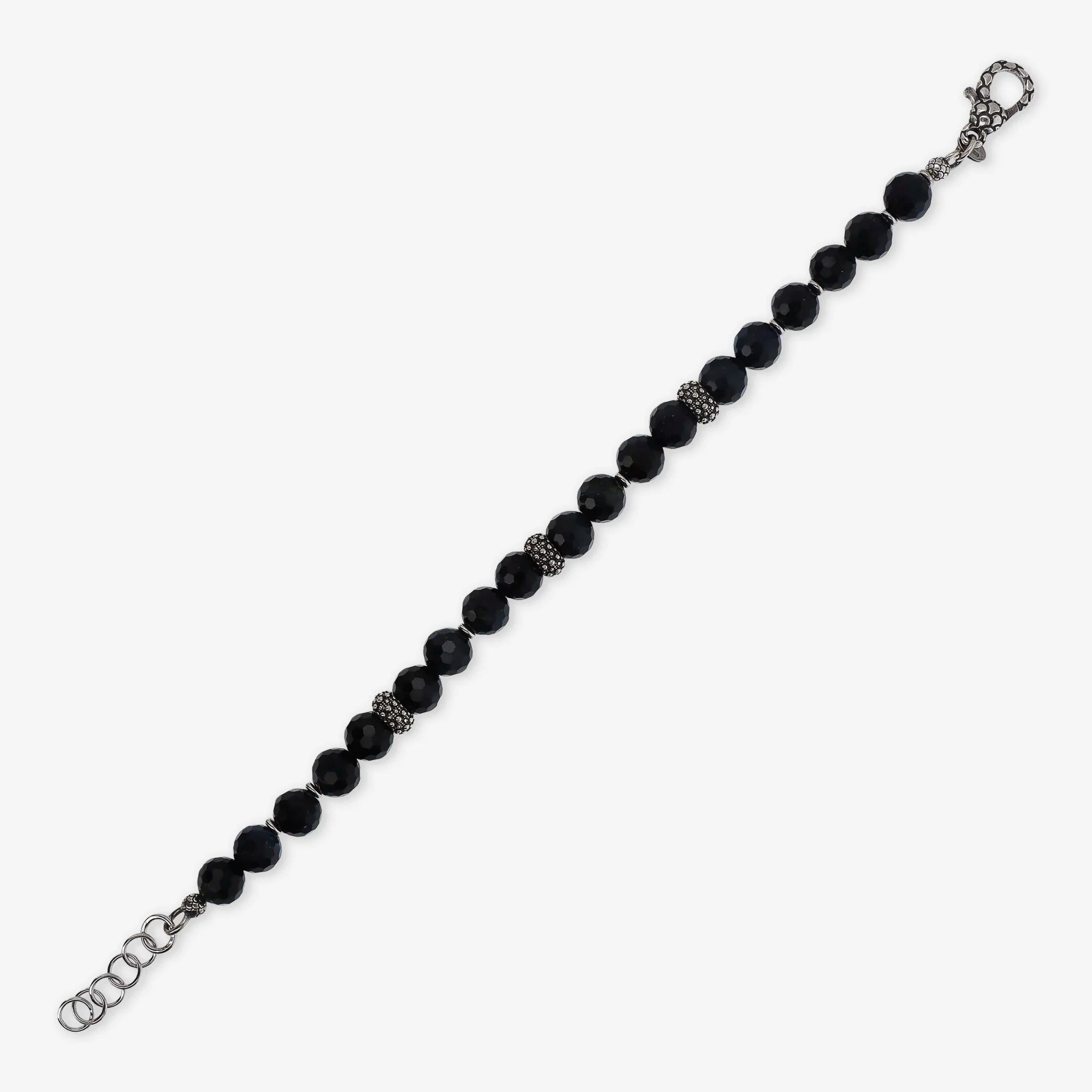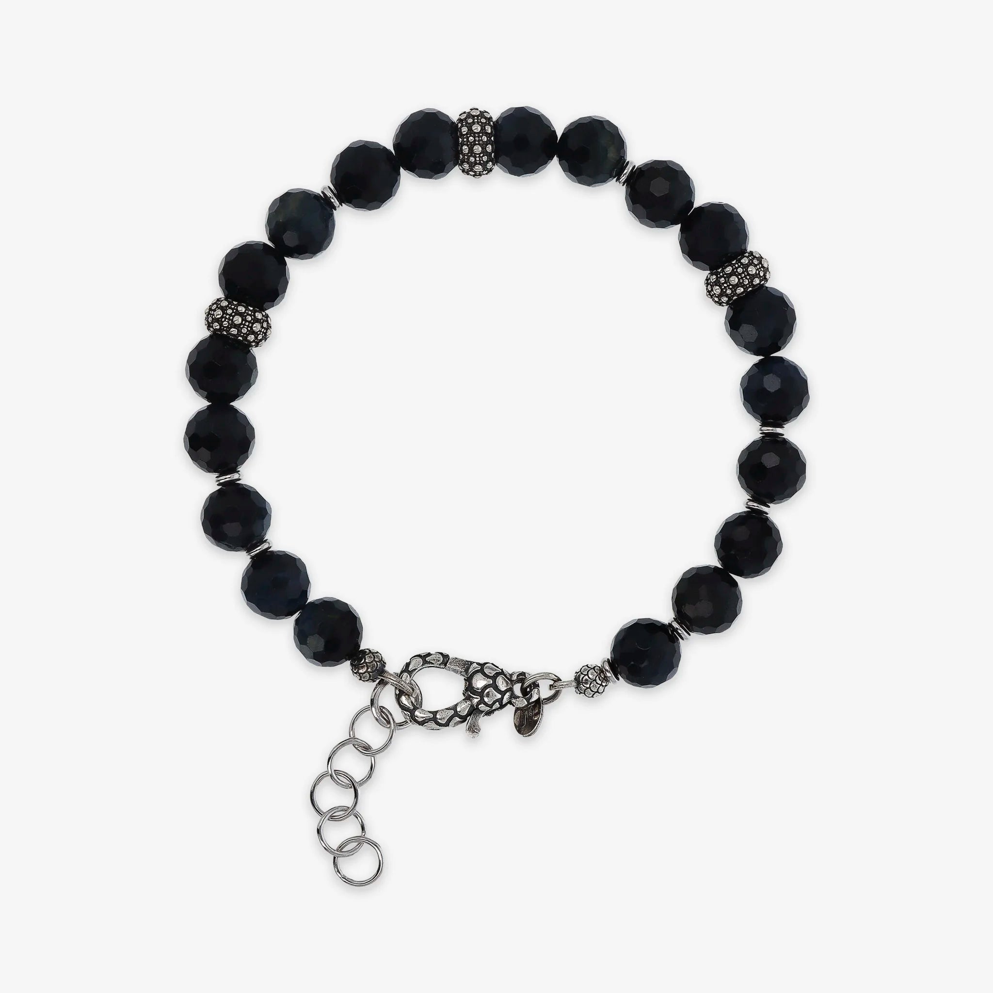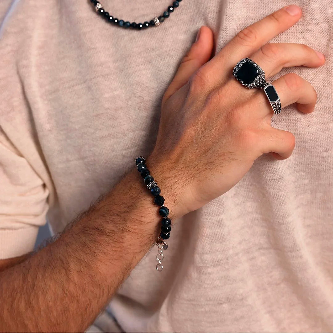 Albert M. Unisex-Armband aus 925er Silber, verziert mit kleinen Kugeln (6 mm) aus facettiertem Naturstein, blaues Tigerauge. Das Armband verfügt über drei strukturierte Seeigel-Unterlegscheiben und einen Karabinerverschluss mit Meerjungfrau-Struktur.