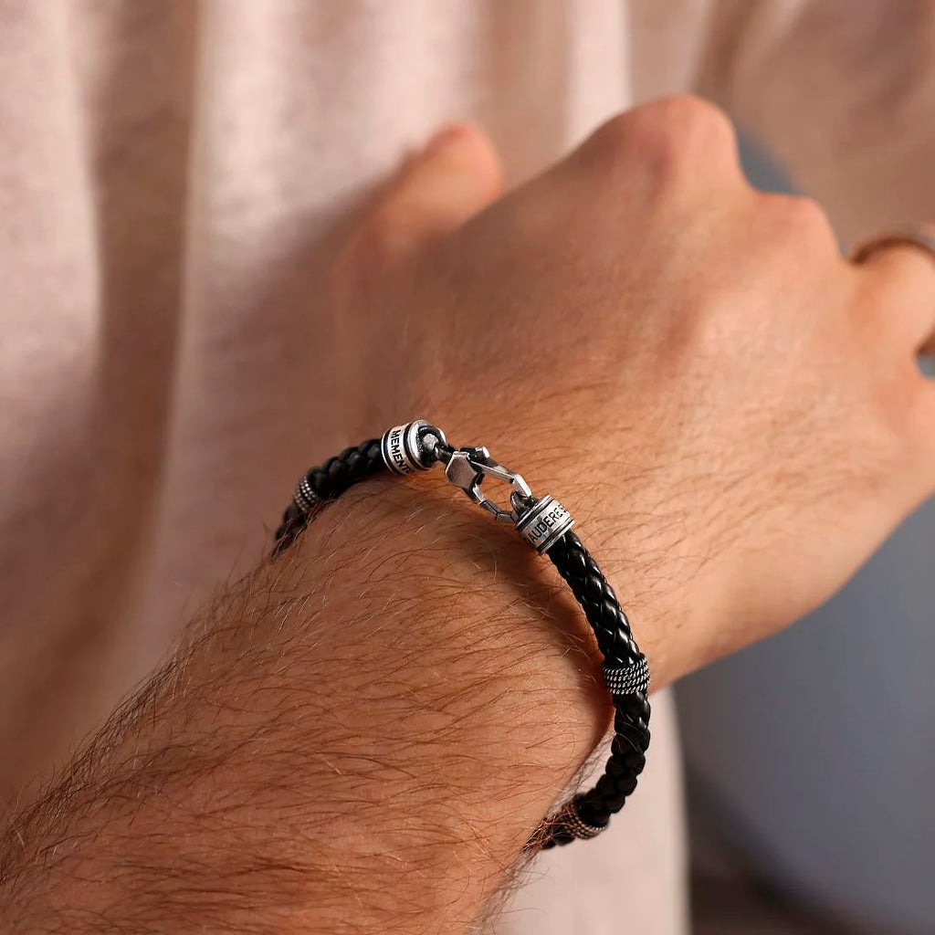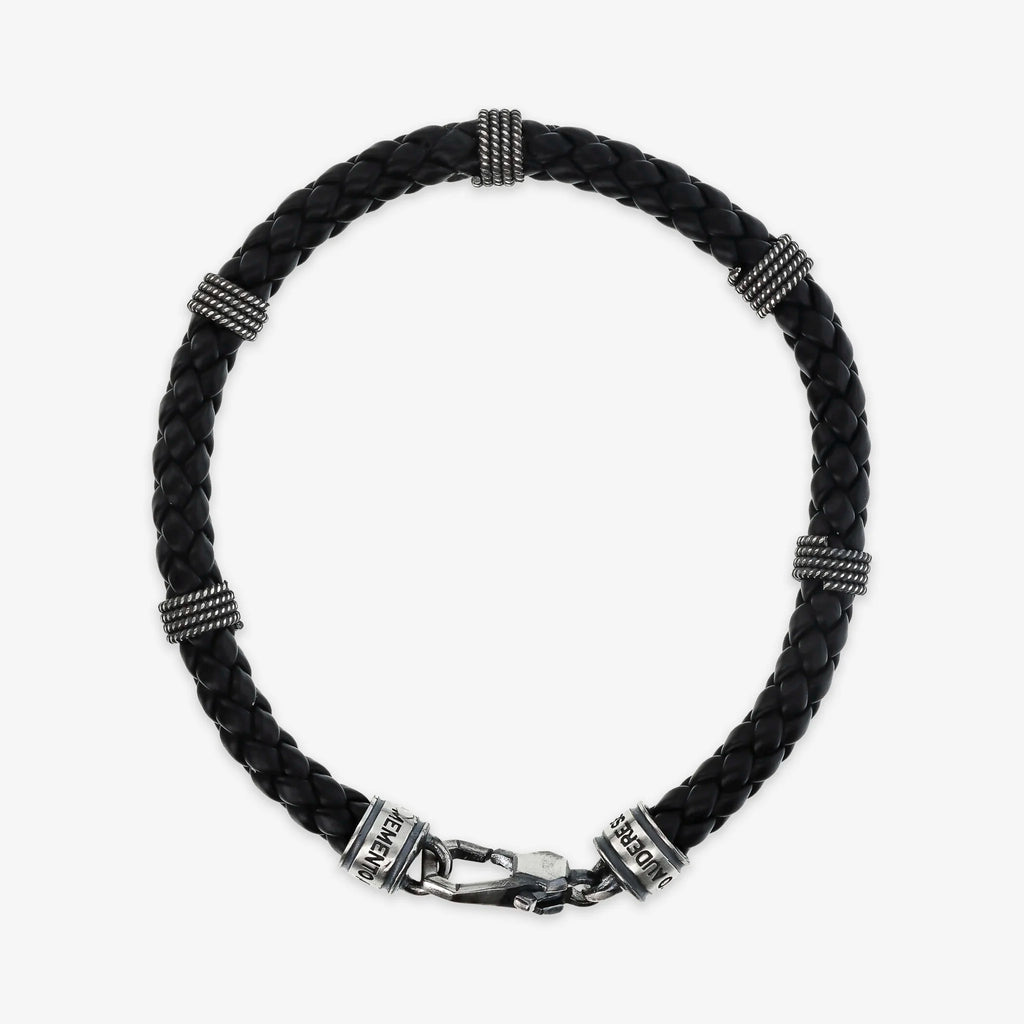Herrenarmband von Albert M. aus schwarzem Öko-Leder (5 mm dick) mit geflochtenem Design und strukturierten Unterlegscheiben aus 925er Silber. Länge 20,5 cm. Quadratischer Karabinerverschluss.