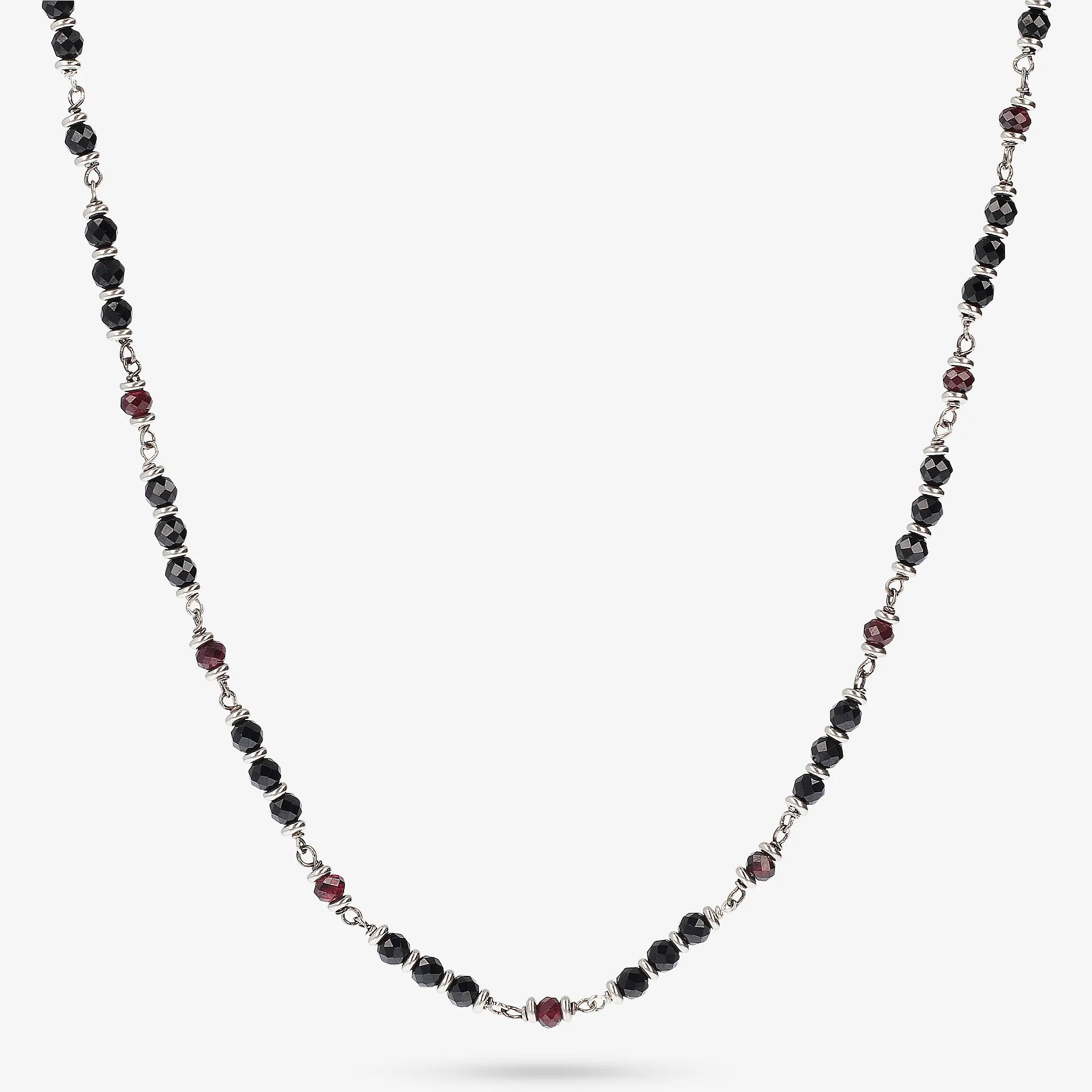 Albert M. Unisex-Halskette aus 925er Silber, verziert mit kleinen facettierten Steinen (schwarzer Spinell und roter Granat), abwechselnd mit Silberelementen wie gehämmerten Kugeln und glatten Scheiben.