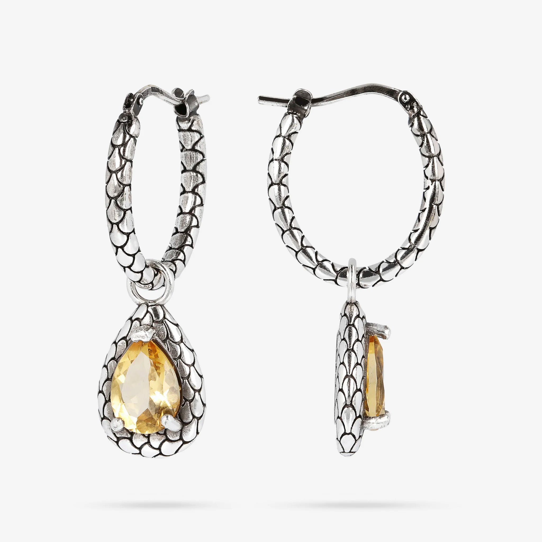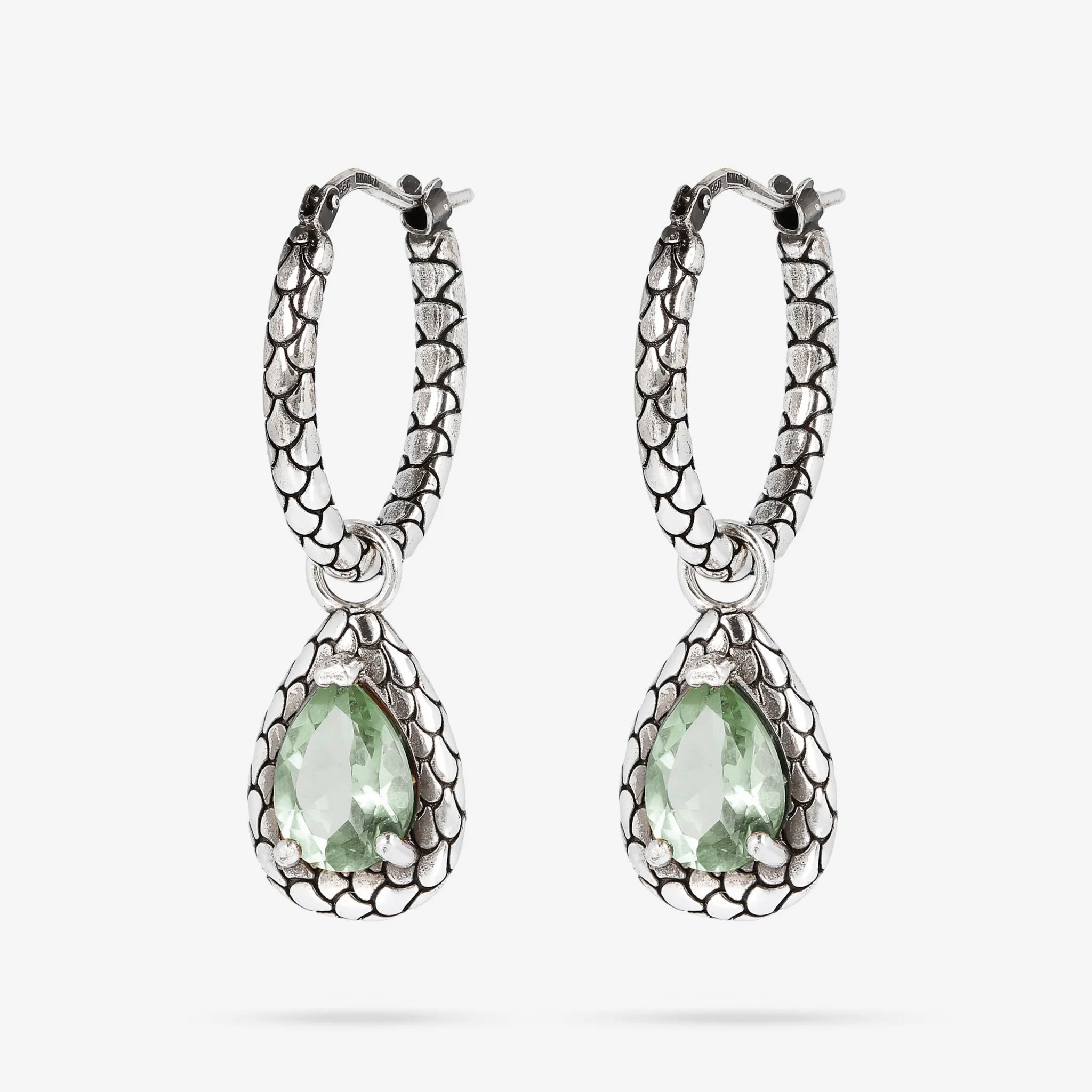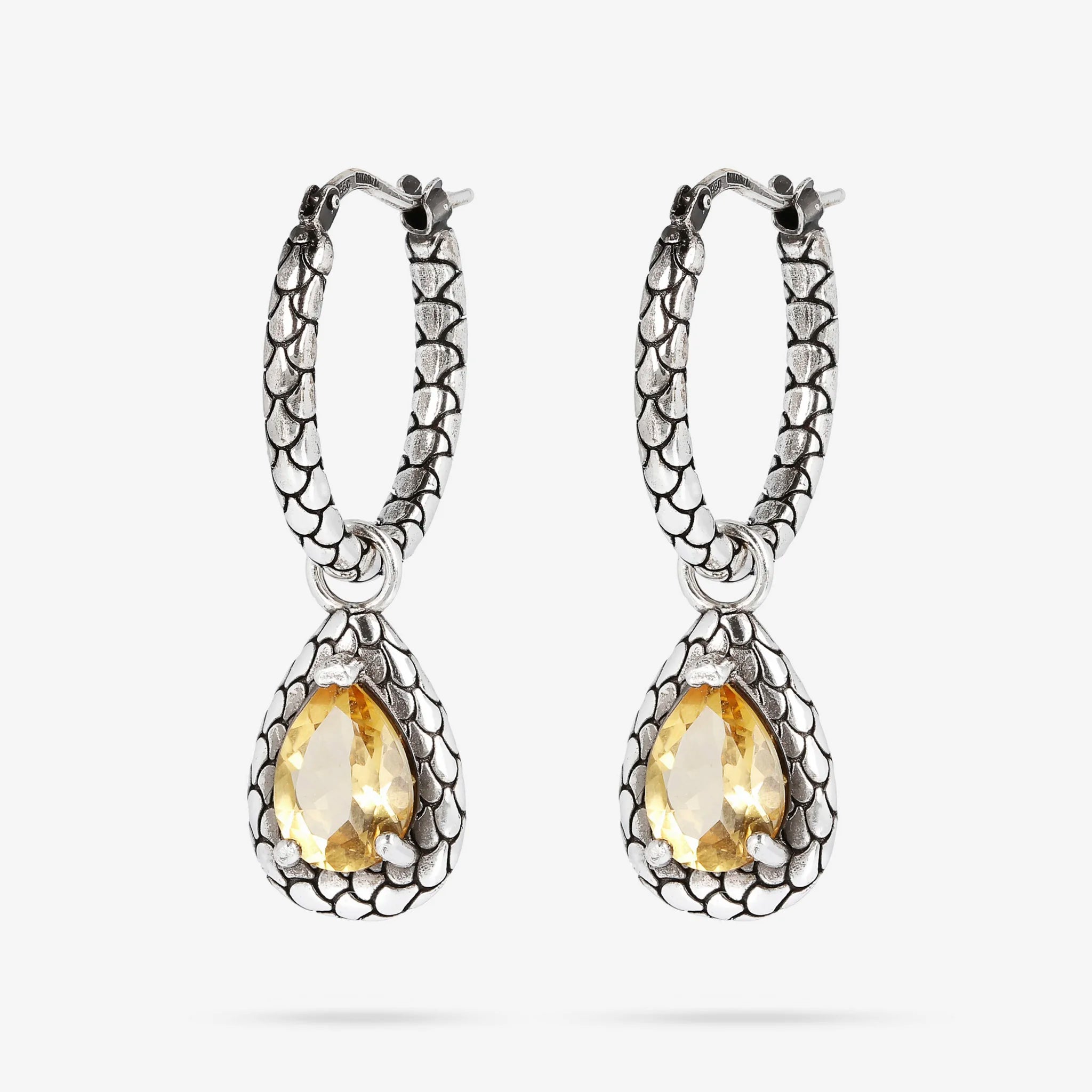 Albert M. Creolen aus 925er Silber mit tropfenförmigen Anhängern und Meerjungfrauen-Textur, auf denen zwei Natursteine (gelber Citrin oder grüner Amethyst) positioniert sind; Länge von 3,7 cm. Die besondere Textur verleiht dieser Kreation eine sinnliche und geheimnisvolle Note.