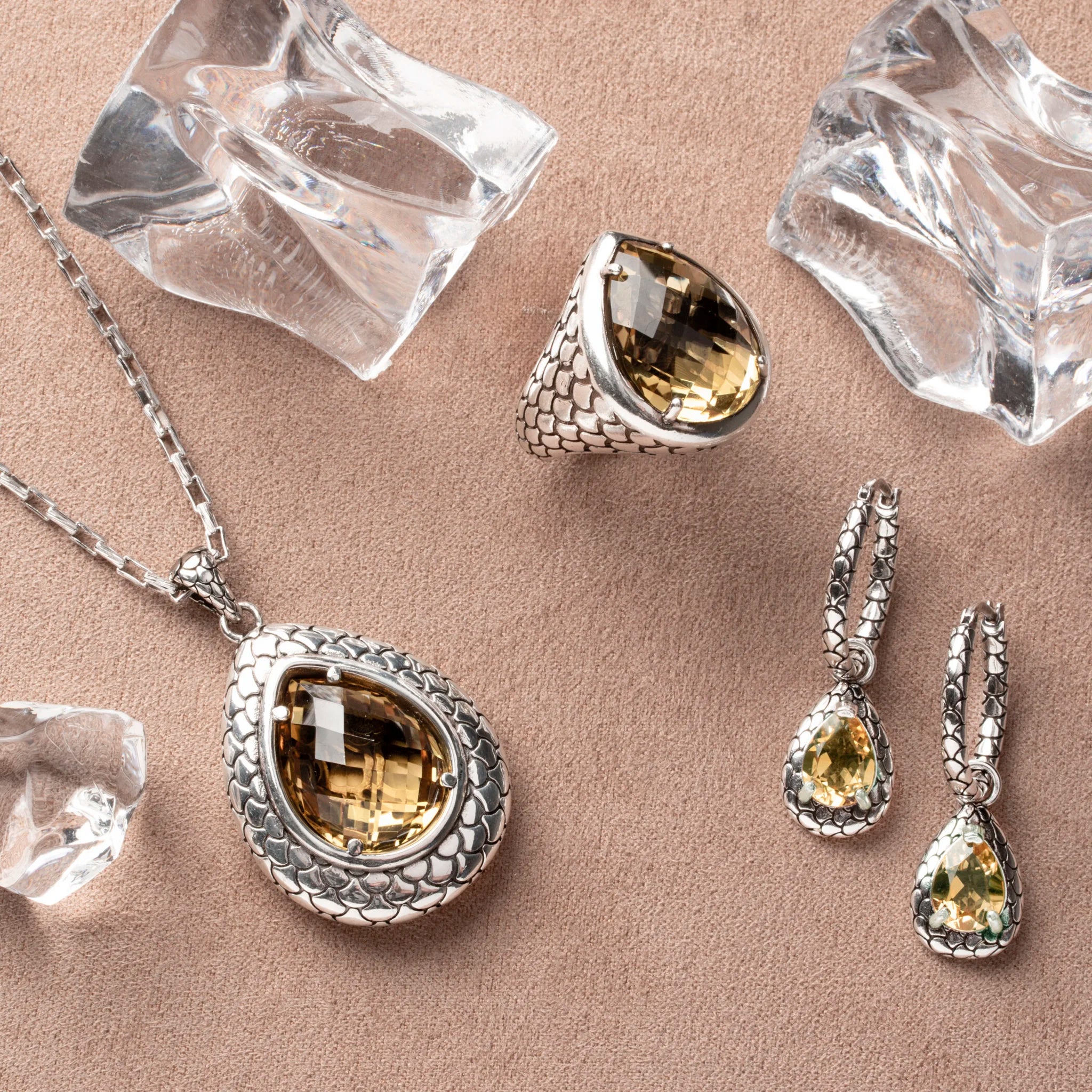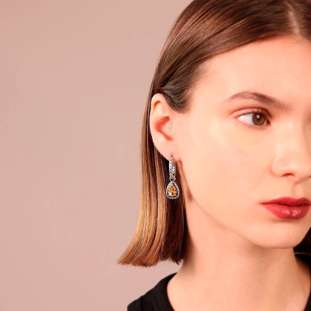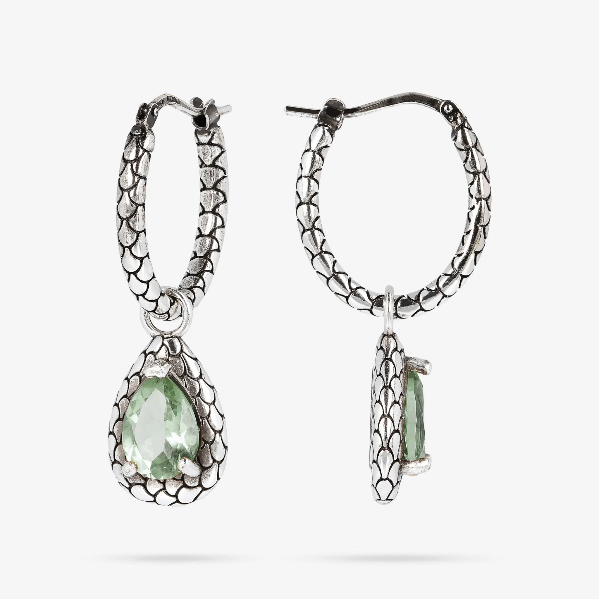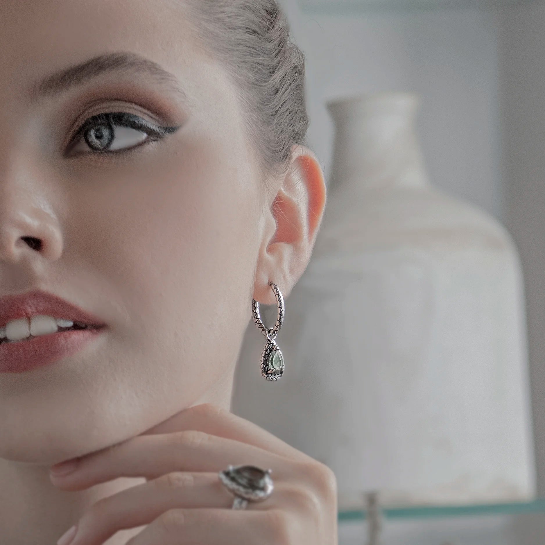 Albert M. Creolen aus 925er Silber mit tropfenförmigen Anhängern und Meerjungfrauen-Textur, auf denen zwei Natursteine (gelber Citrin oder grüner Amethyst) positioniert sind; Länge von 3,7 cm. Die besondere Textur verleiht dieser Kreation eine sinnliche und geheimnisvolle Note.
