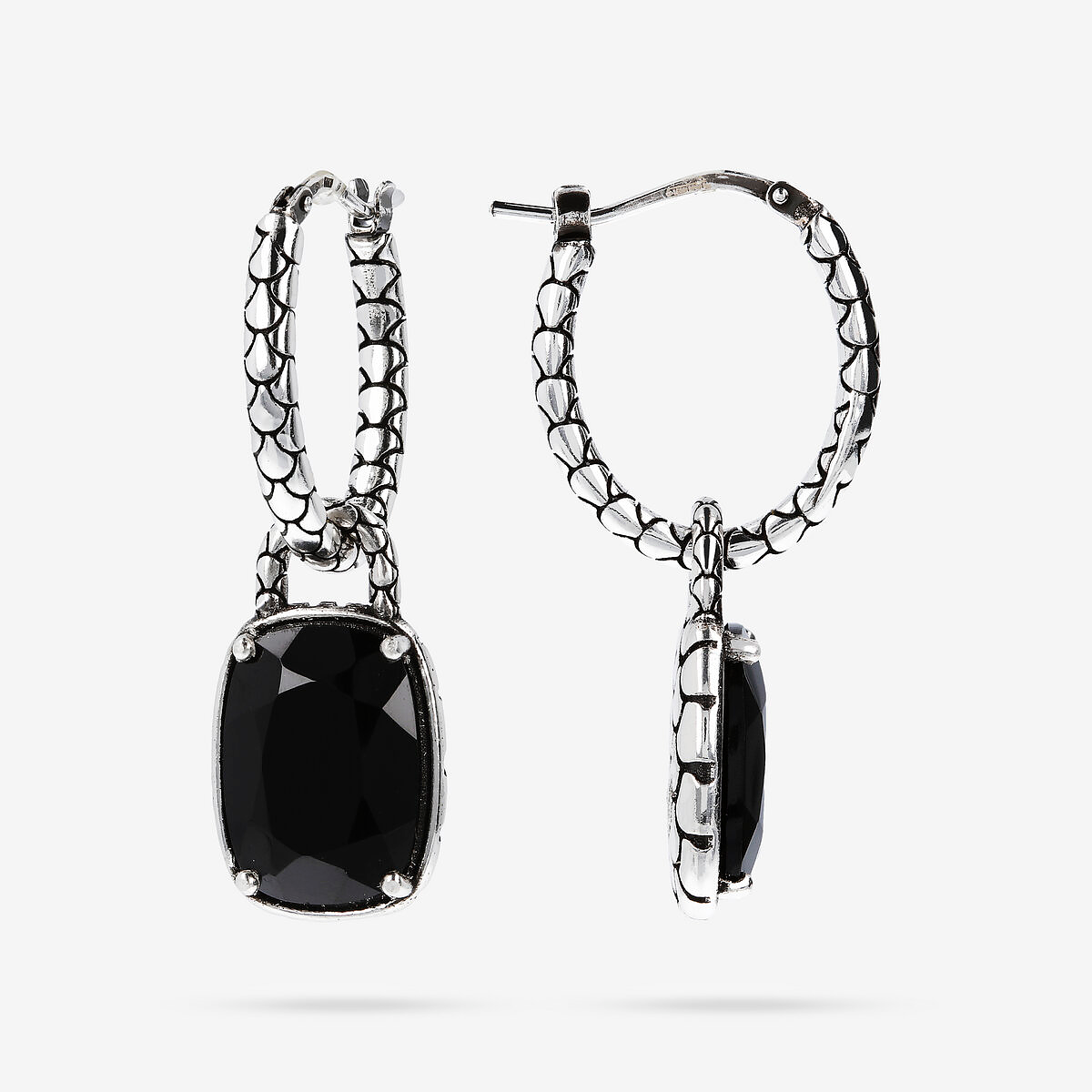 Creolen von Albert M. aus 925er Silber mit Meerjungfrauenstruktur und abnehmbarem Anhänger aus schwarzem Spinell-Naturstein mit rechteckiger Form (10 x 14 mm); Länge von 3,6 cm. Die besondere Textur verleiht dieser Kreation eine sinnliche und geheimnisvolle Note.