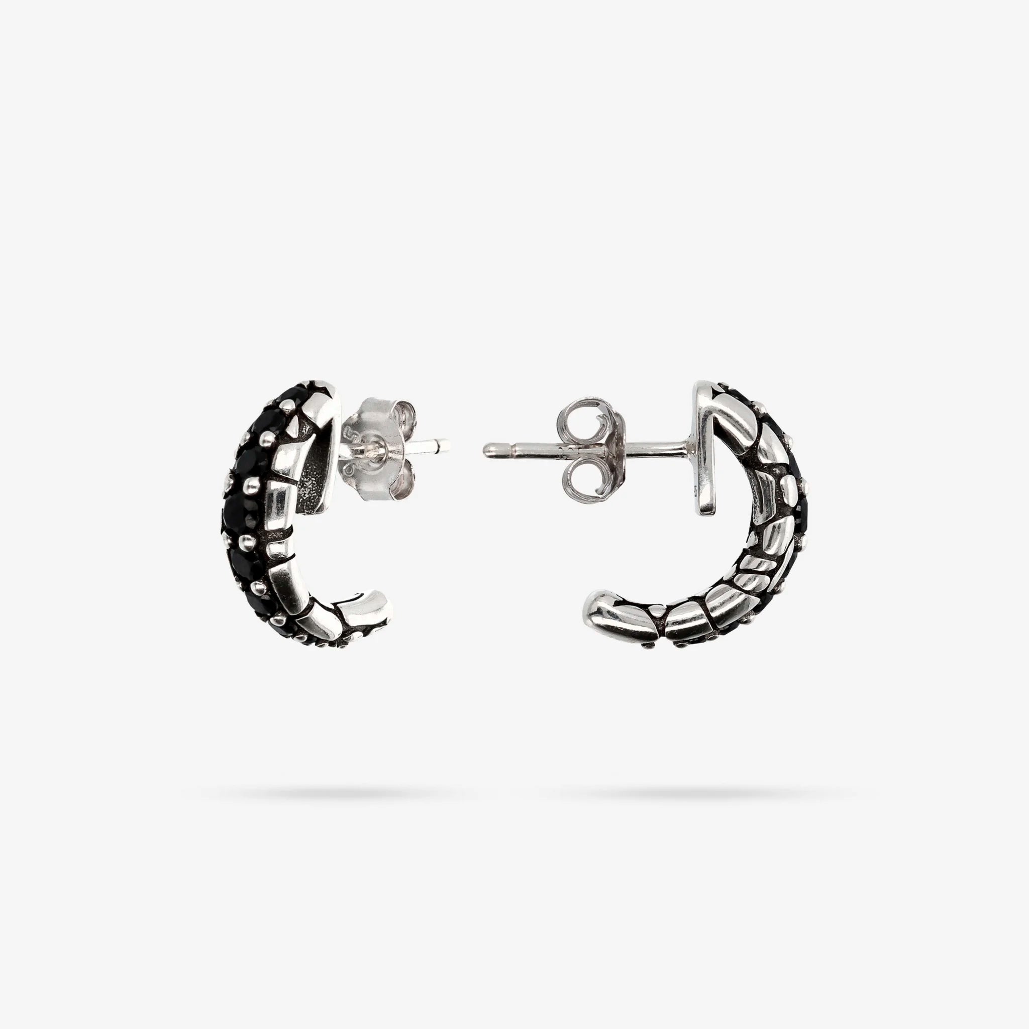 Damen-Ohrringe von Albert M. aus 925er Silber mit halbkreisförmigem Design und strukturierter Oberfläche, verziert mit schwarzen Spinellen. Pin- und Butterfly-Verschluss.