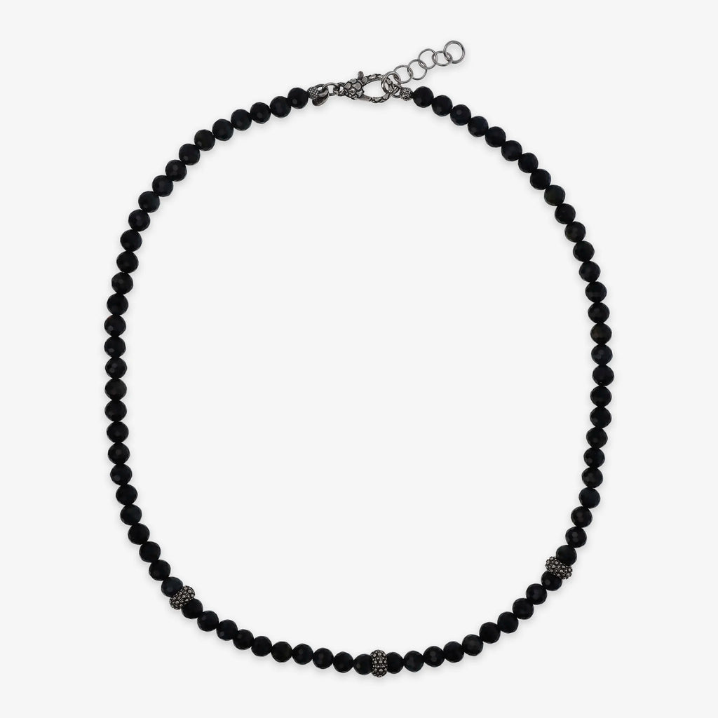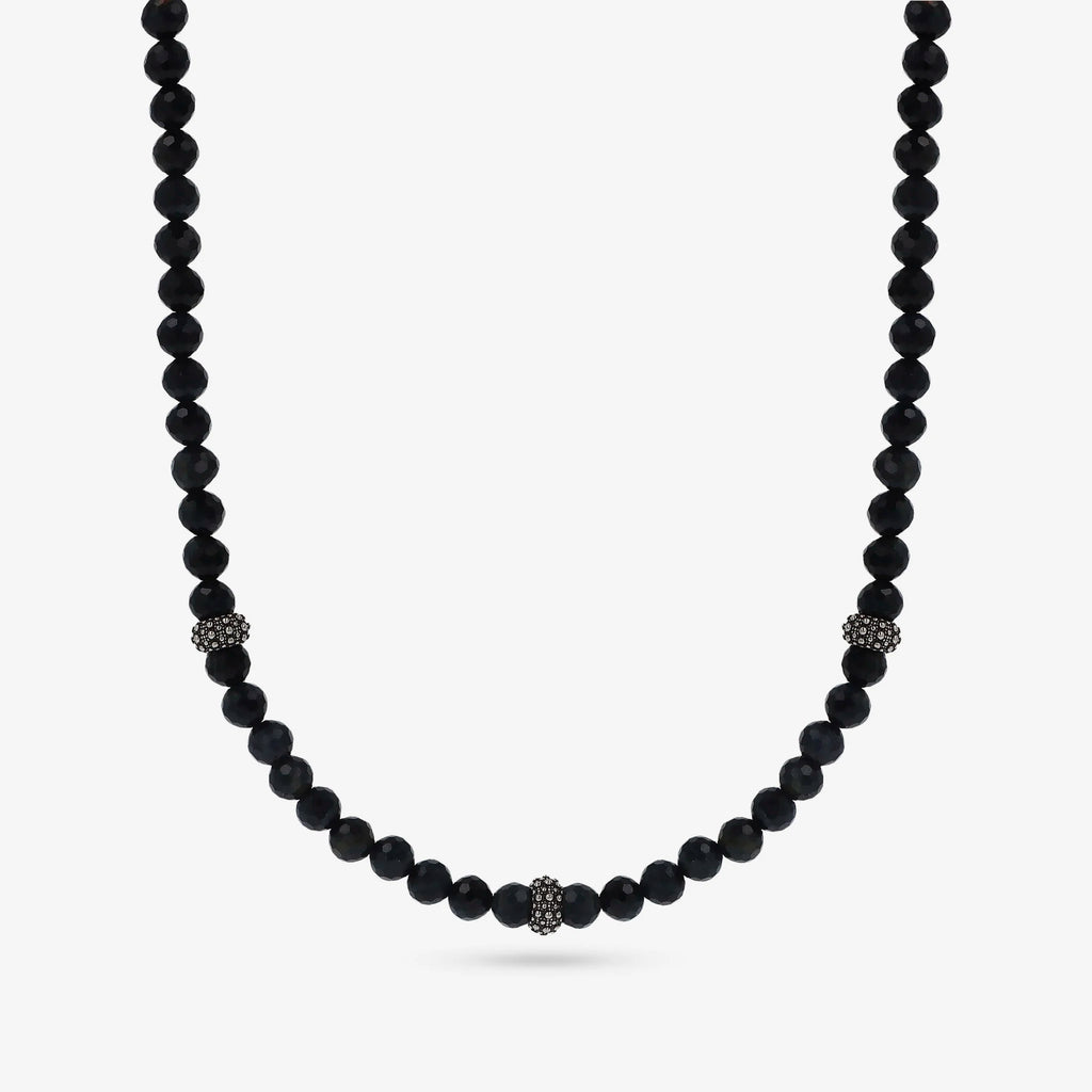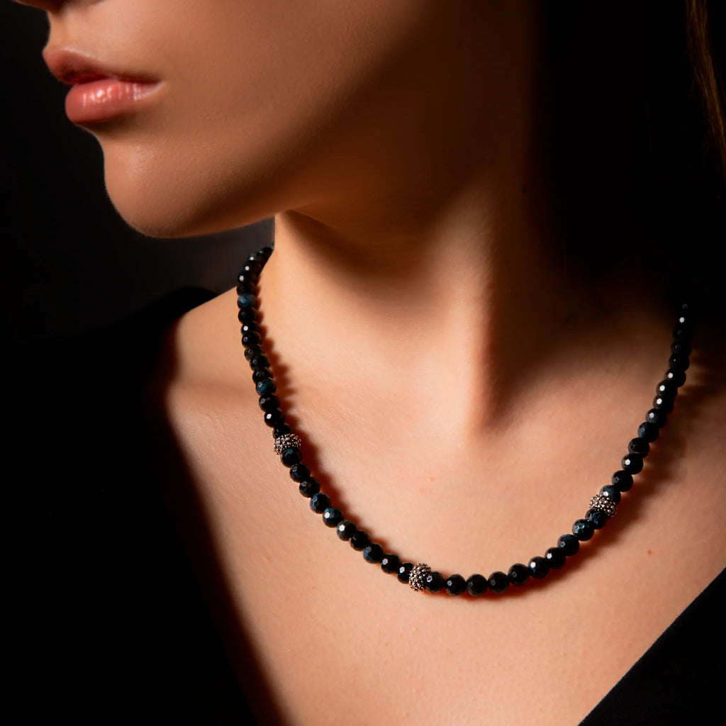 Albert M. unisex necklace made of 925 Silver embellished with small spheres (6 mm) in faceted natural stone, blue tiger's eye. The necklace features three sea urchin textured rondels and a mermaid textured lobster clasp closure.
