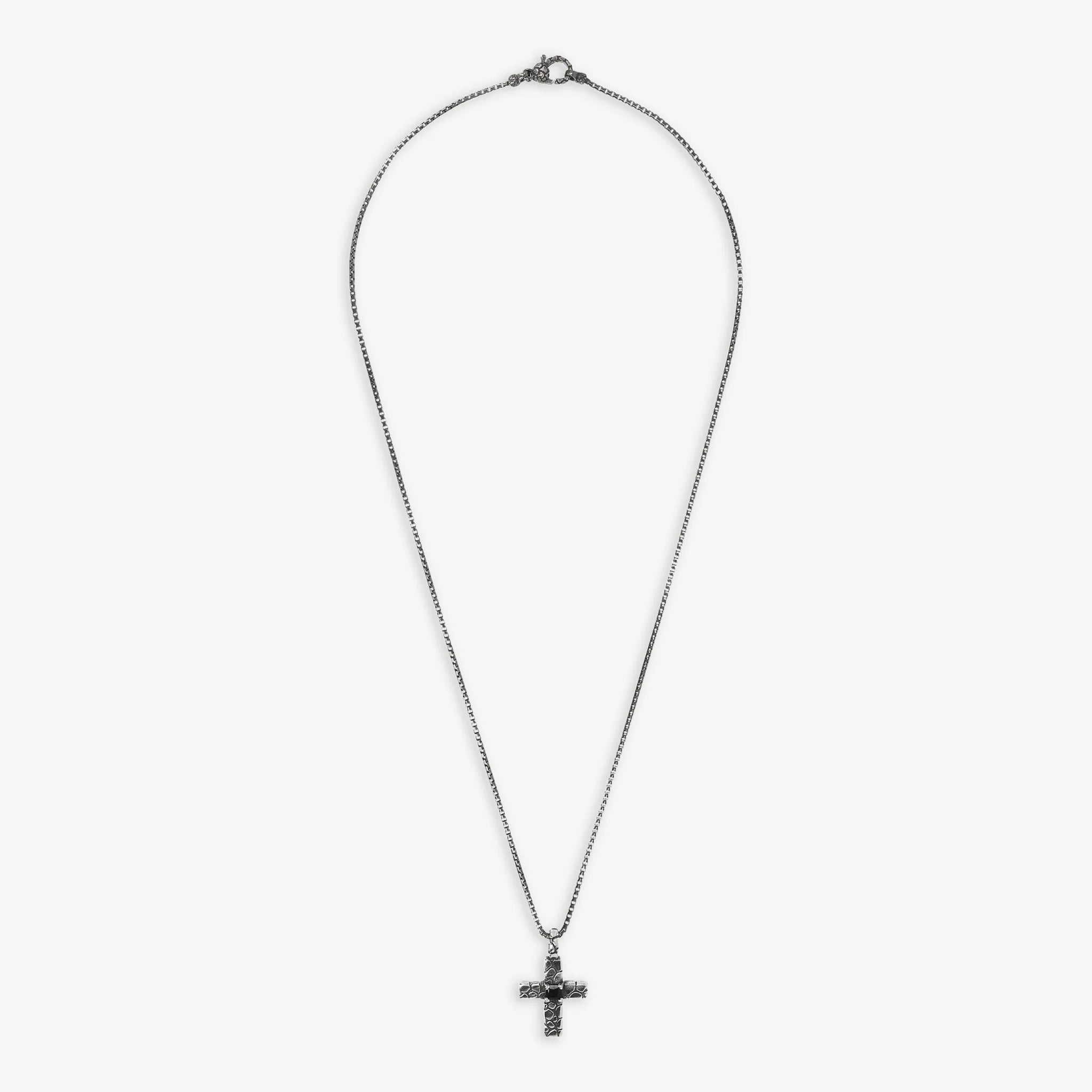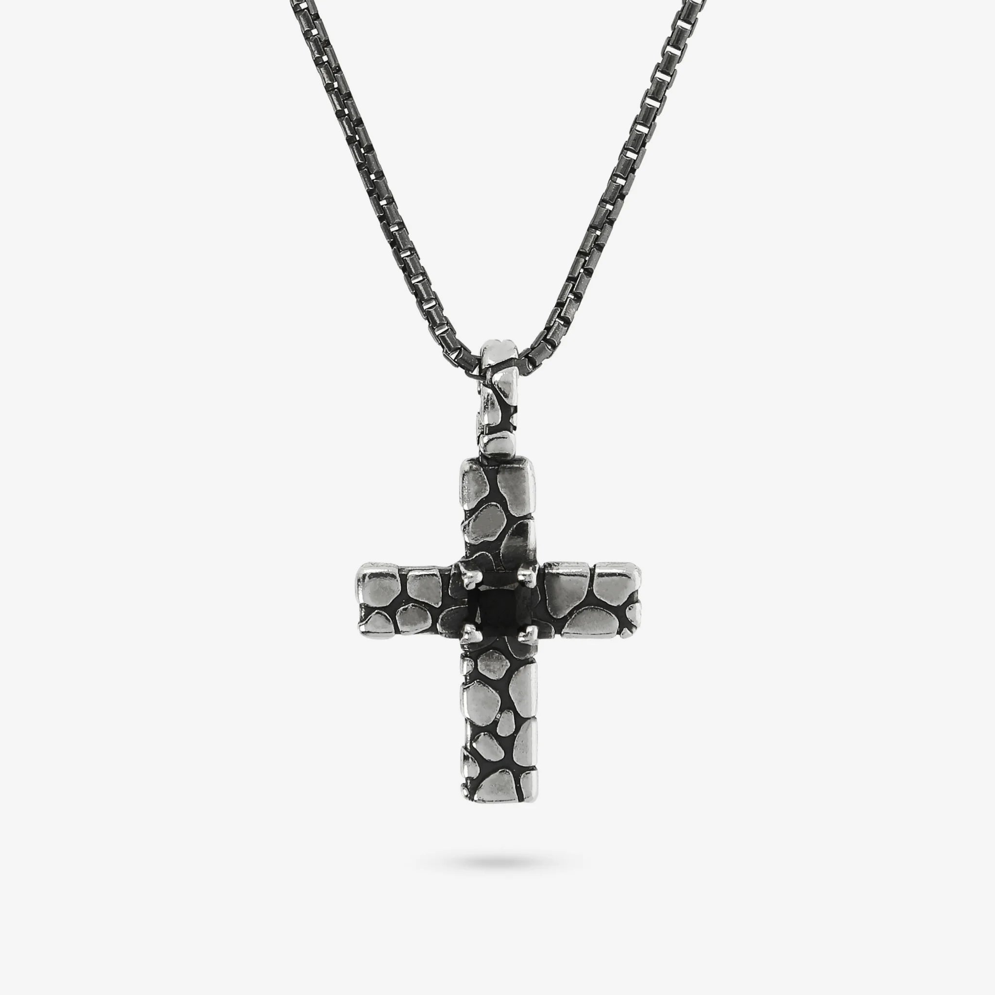 Albert M. men necklace made on a 925 silver base with Venetian chain and cross-shaped pendant with snake texture. At the center of the cross is a natural stone with a square cut black spinel; snap hook closure with snake texture.