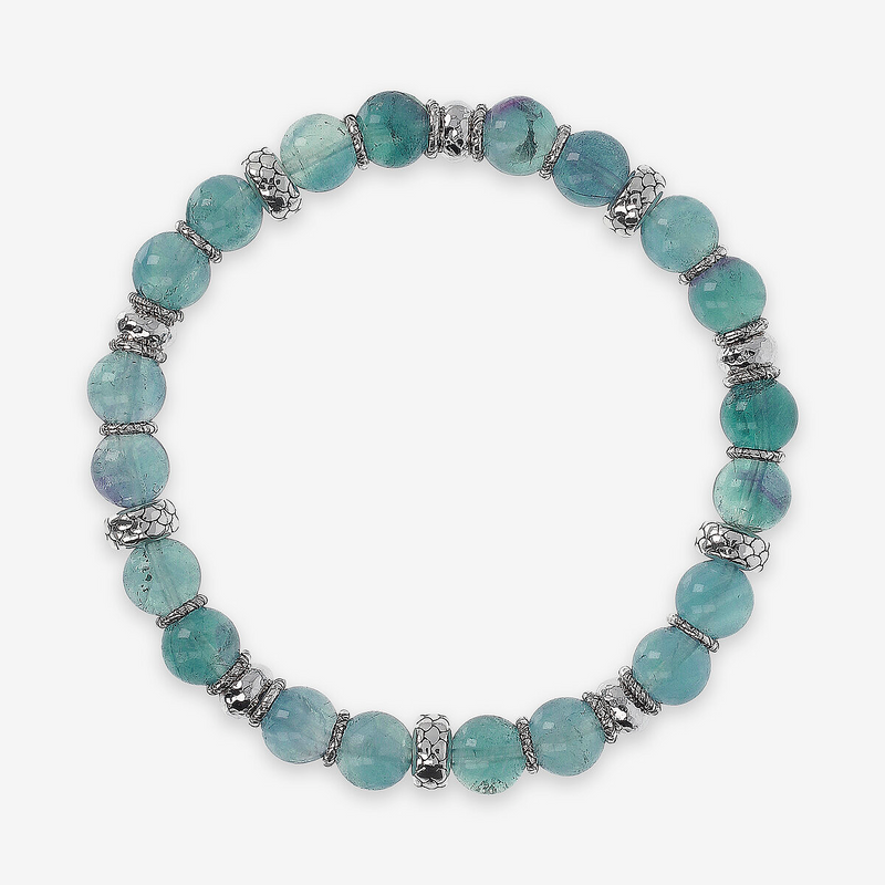 Albert M. unisex elastic bracelet with natural stones (green fluorite) alternating with links with mermaid texture and worked washers in 925 silver.