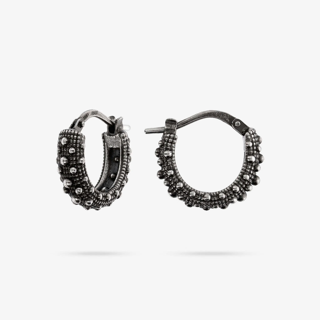 Albert M. hoop earrings made of 925 silver, with a sea urchin texture characterized by a rich 'dot' workmanship with small silver spheres covering the surface; bayonet closure.