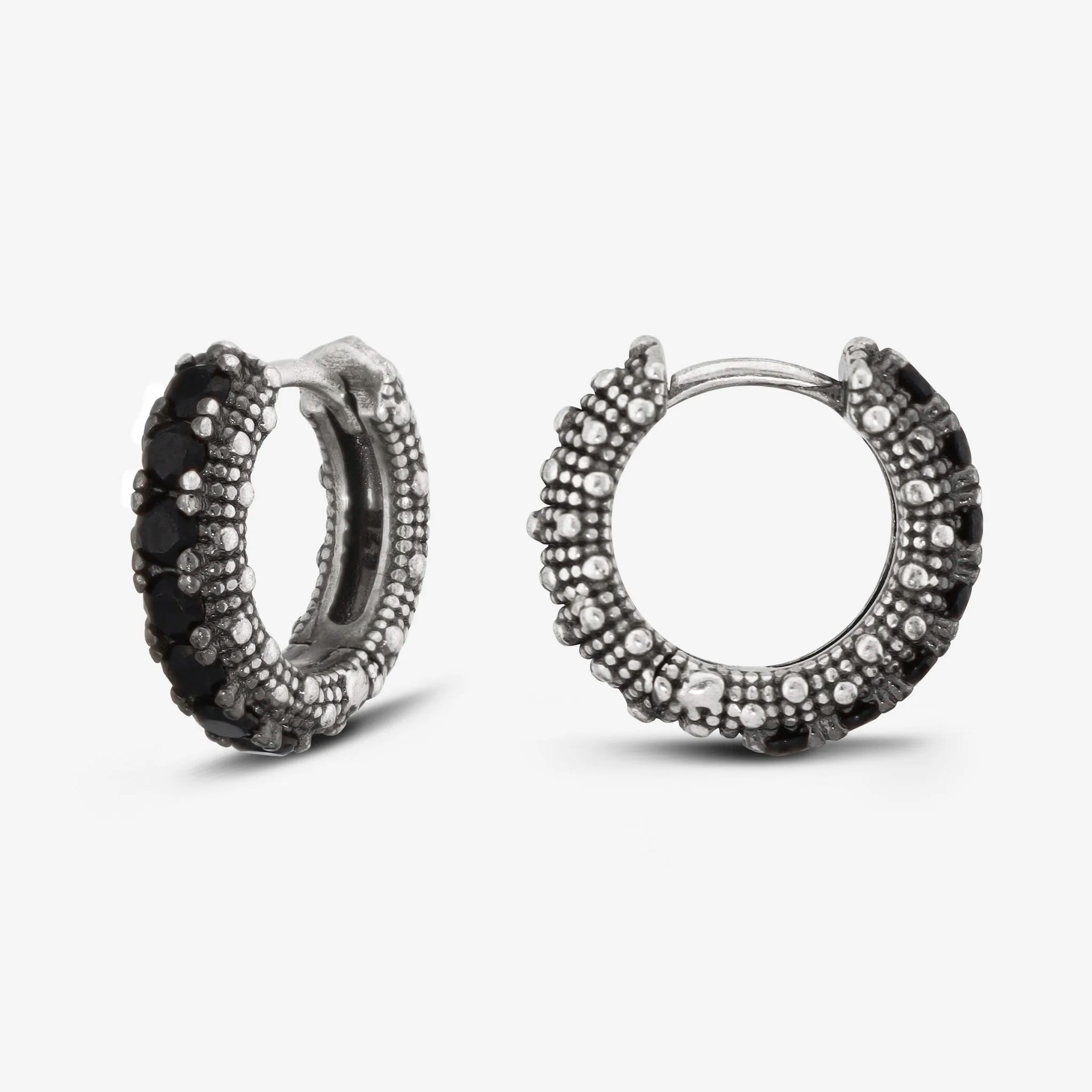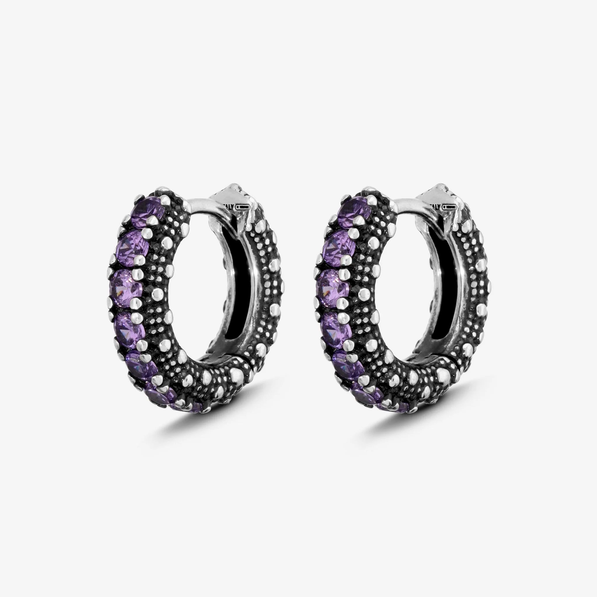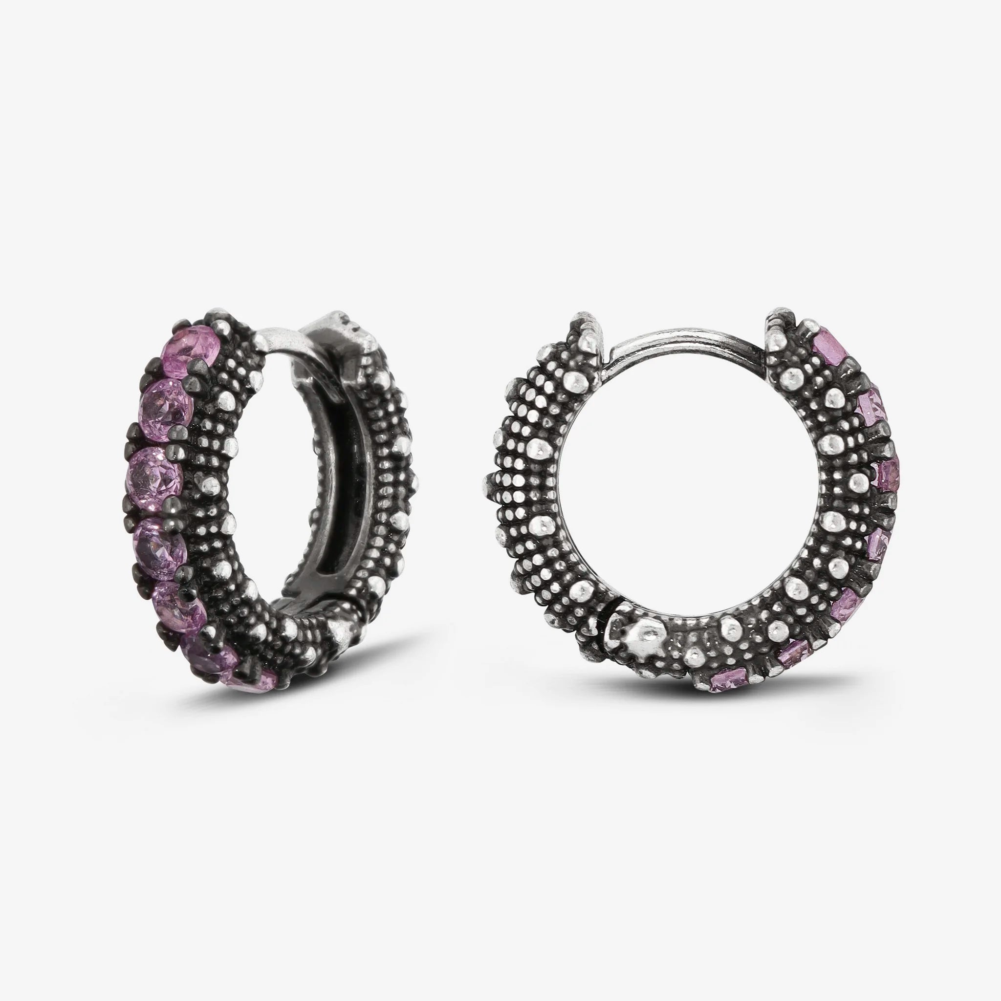 Small Albert M. hoop earrings made of 925 Silver with sea urchin texture surface embellished with stones. Closure with snap pin.