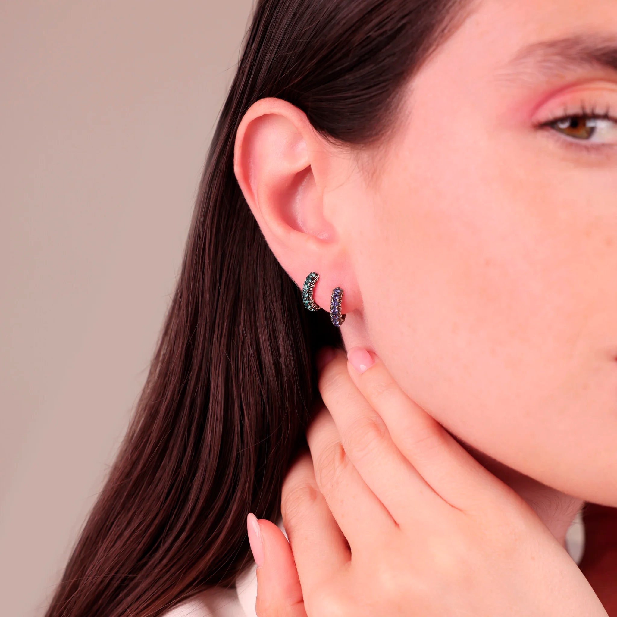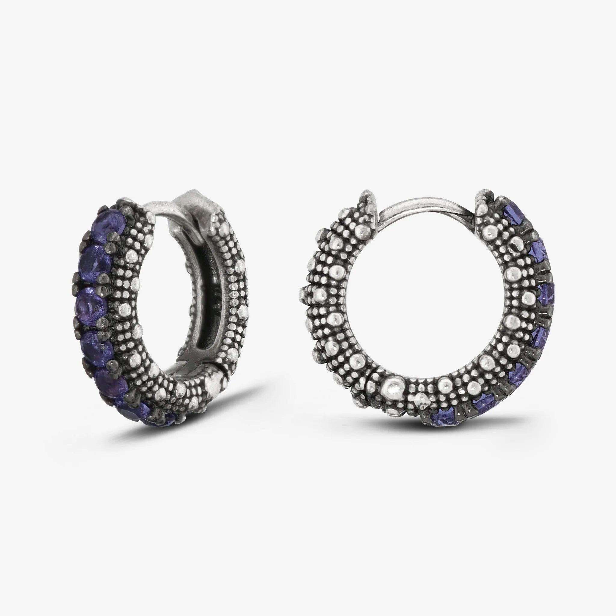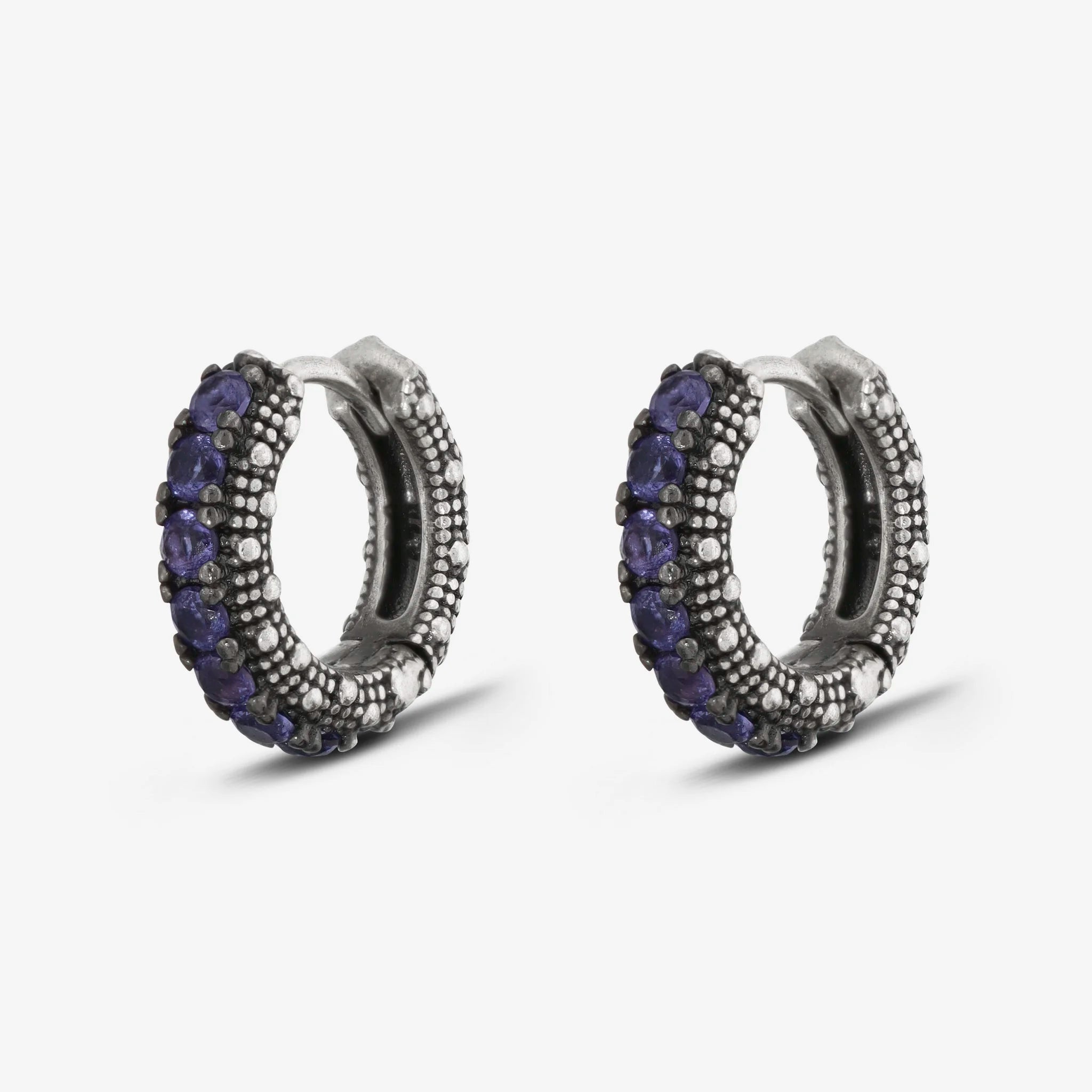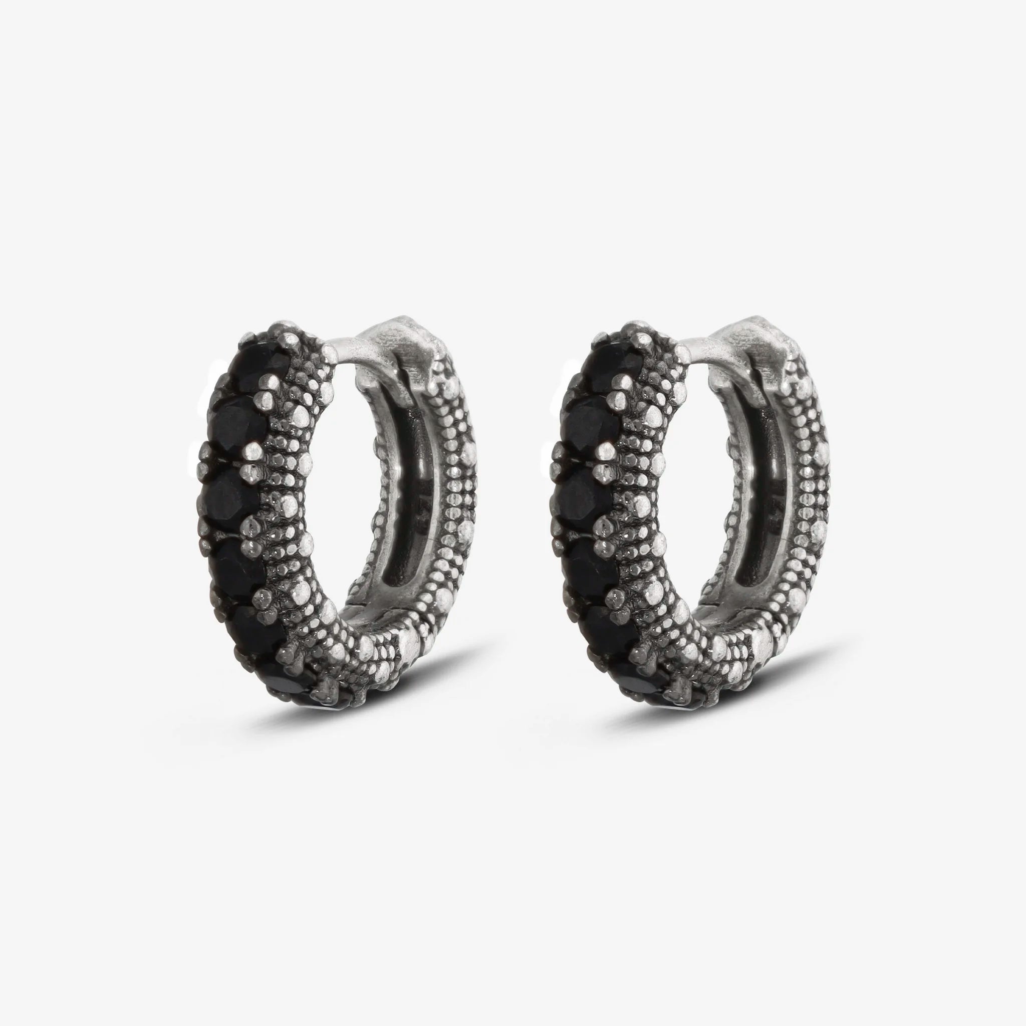 Small Albert M. hoop earrings made of 925 Silver with sea urchin texture surface embellished with stones. Closure with snap pin.