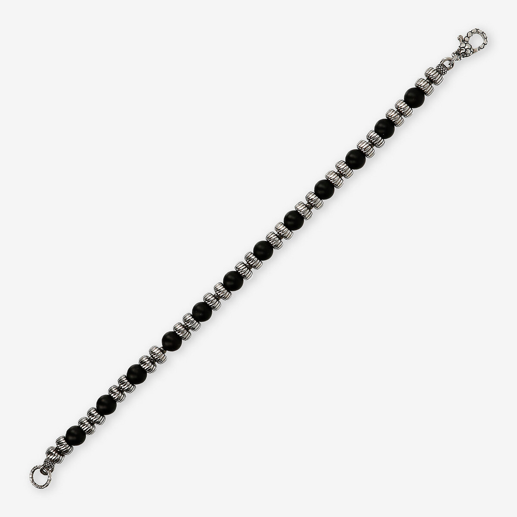 Albert M. men bracelet made on a 925 silver base embellished with an alternation of washers with a striped texture and spheres in black onyx natural stone; snap hook closure with snake texture. Original creation that can be easily worn with any outfit.