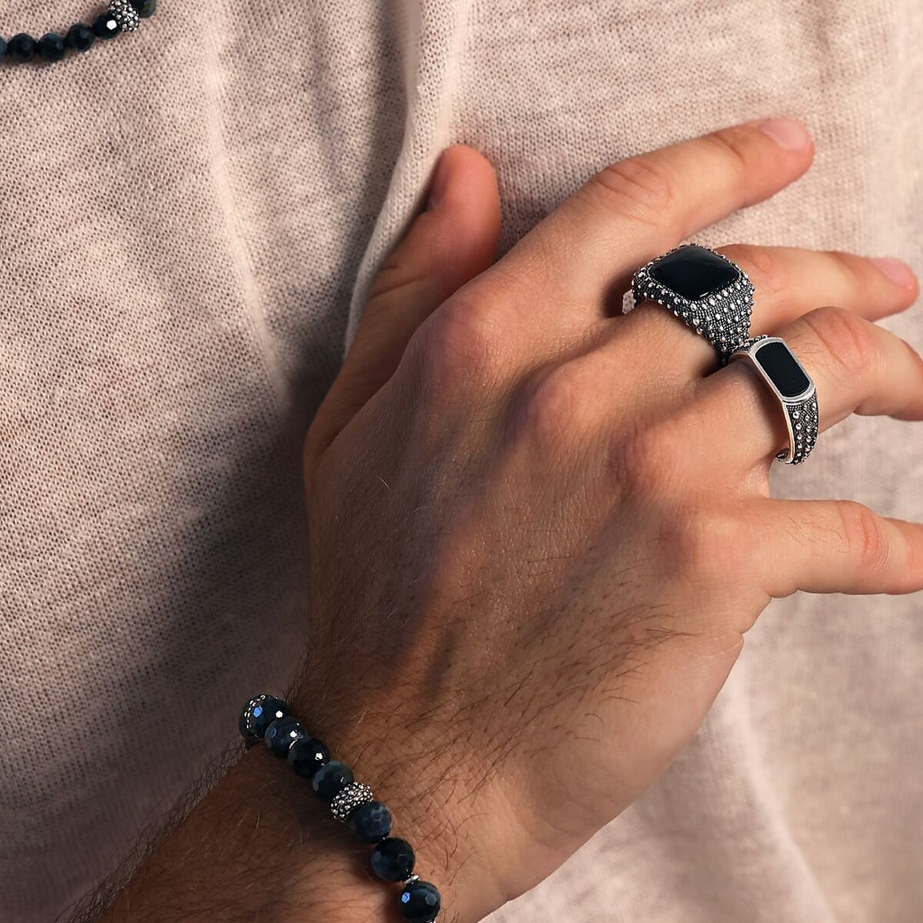 Albert M. men's band ring made of 925 Silver with rectangular natural stone (15x7 mm) and sea urchin texture, characterized by a rich 'dot' workmanship with small shiny spheres covering the surface.