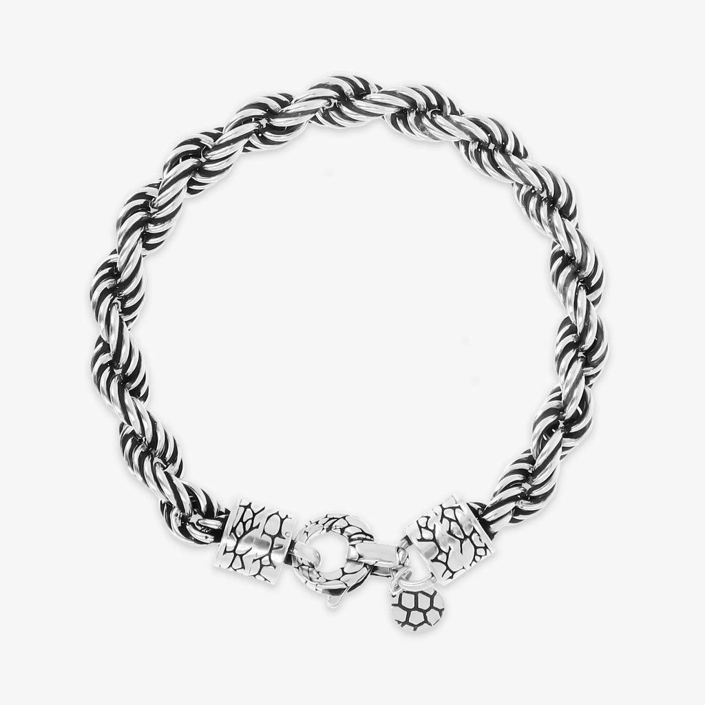 Albert M. men's bracelet made on a 925 silver base with rope chain and decorative elements with a snake texture that recalls the snap hook on the closure. Creation that can be easily worn with any outfit.