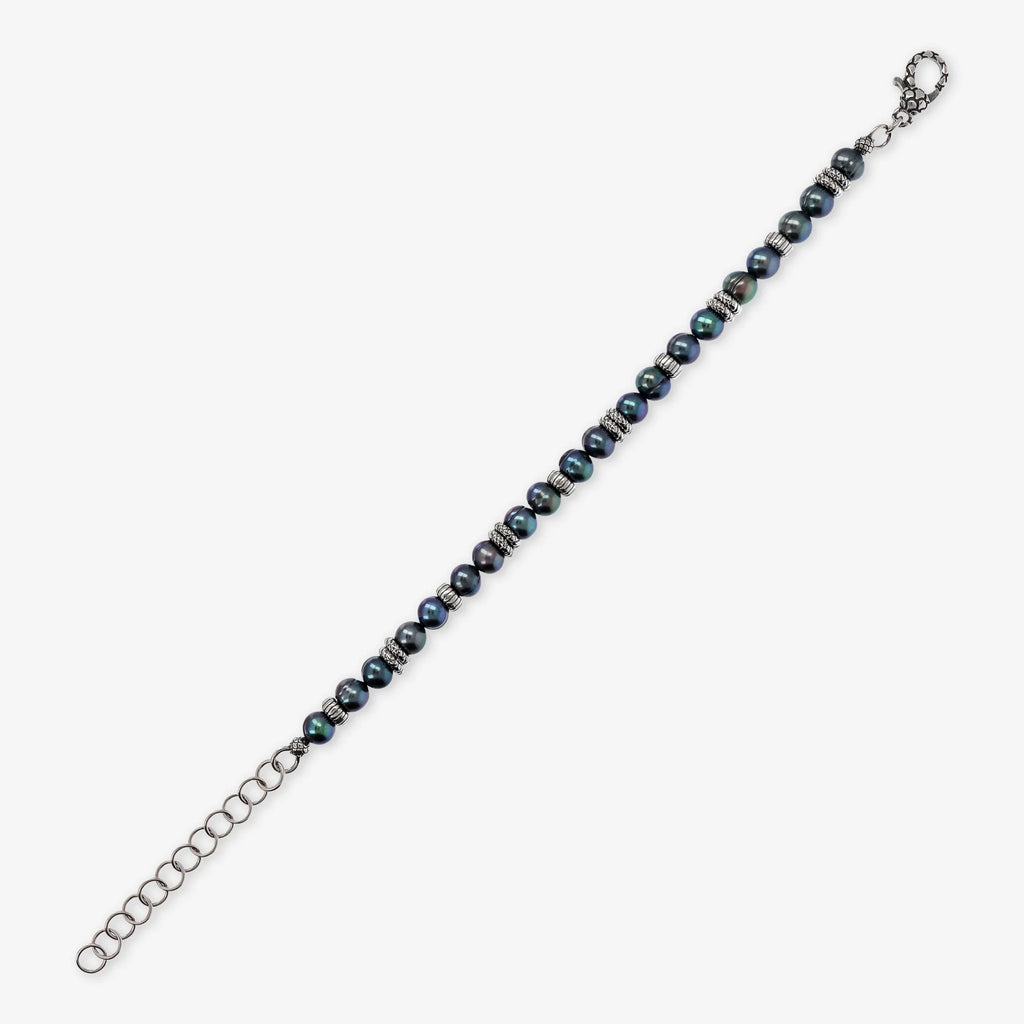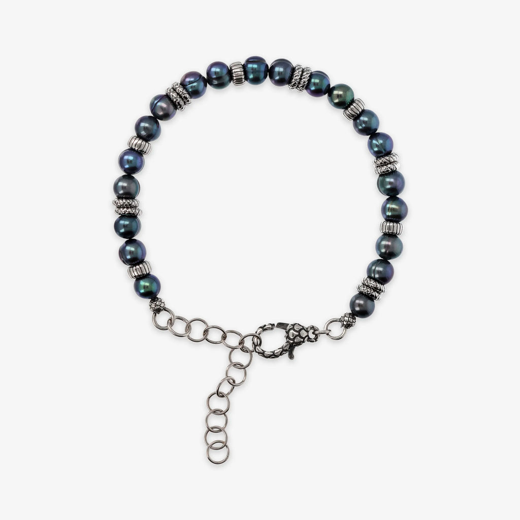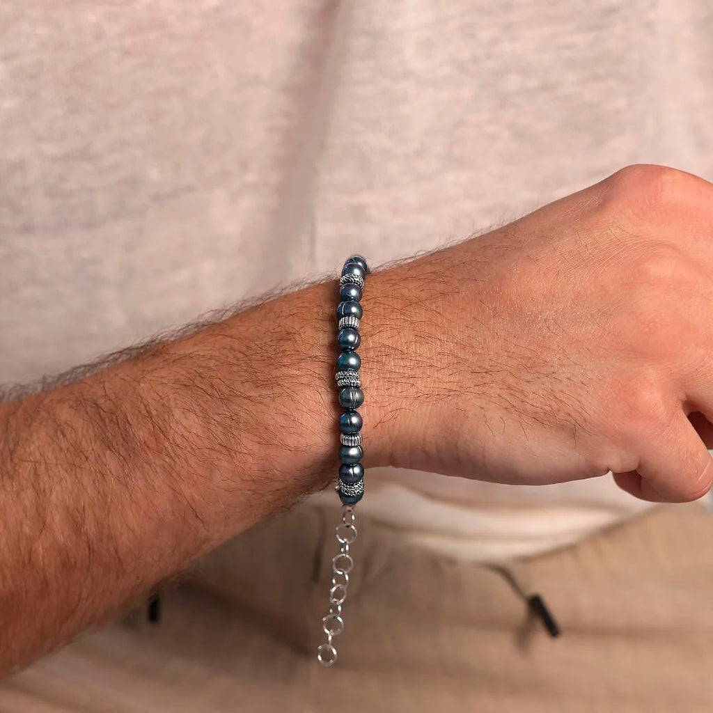 Albert M. men's bracelet made of 925 silver embellished with washers with a striped surface alternating with grey circled freshwater pearls with a rounded shape with a diameter of approximately 6/7 mm. Lobster clasp closure with mermaid texture.