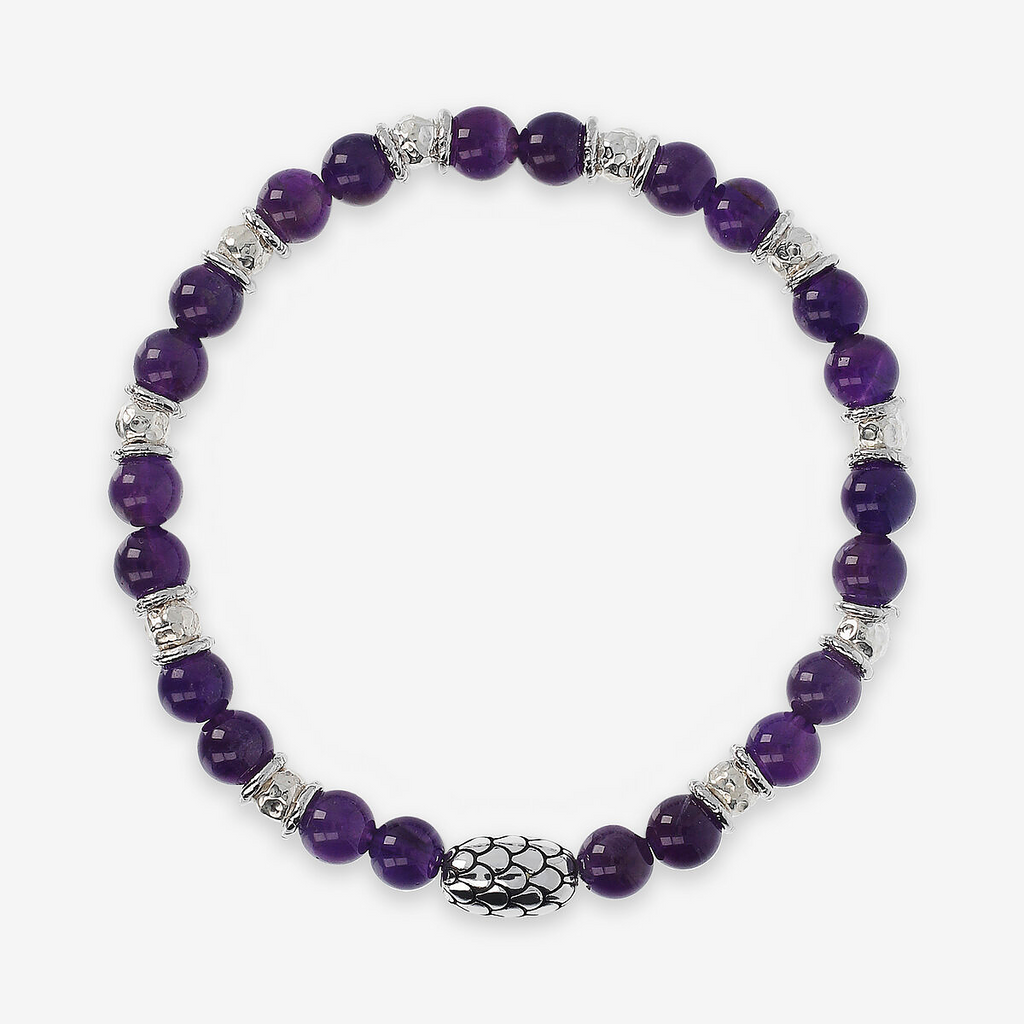 Albert M. unisex elastic bracelet embellished with smooth washers alternating with hammered spheres and faceted natural stones (purple amethyst). The bracelet features an oval element in 925 silver with a mermaid texture. Creation that can be easily worn with any outfit.