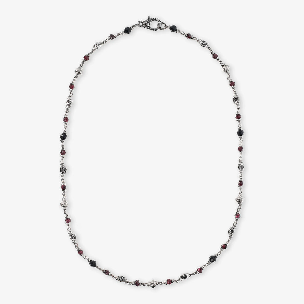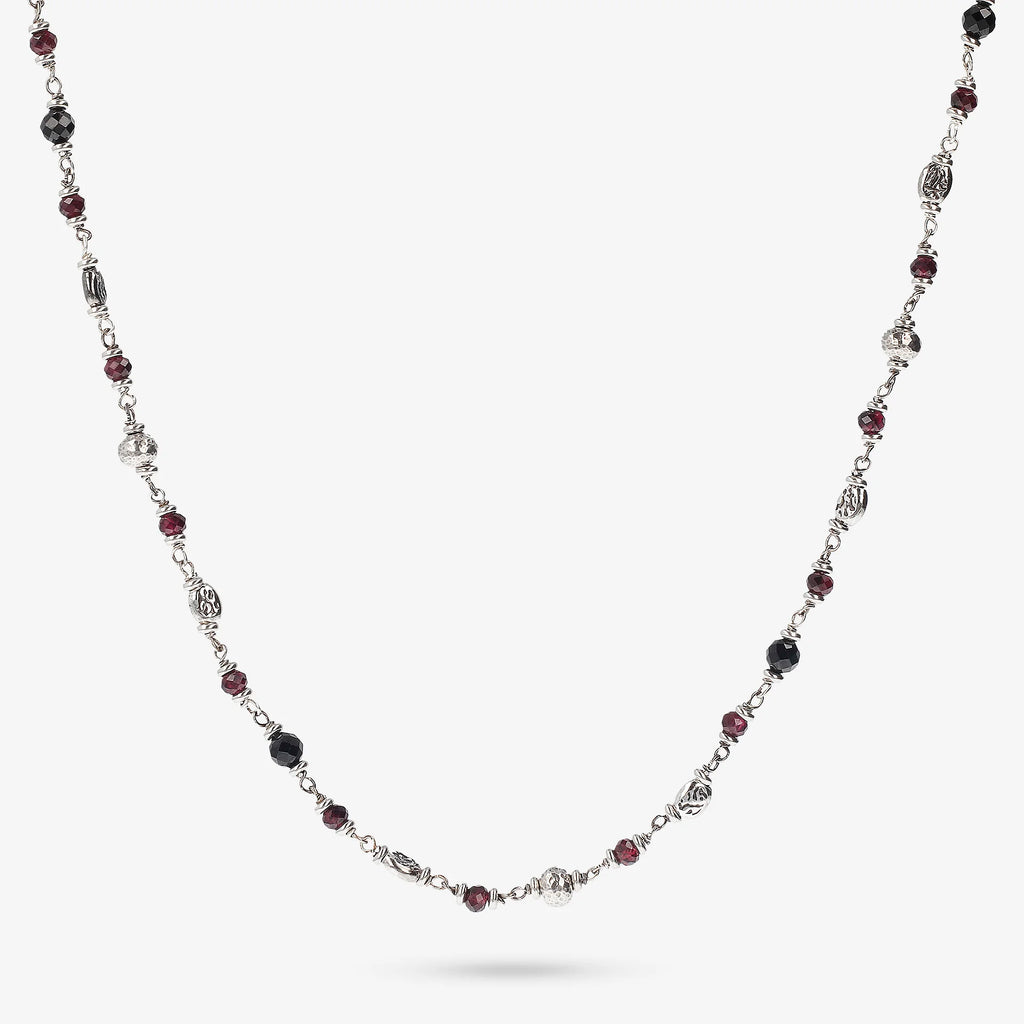 Albert M. unisex necklace made on a 925 silver base embellished with small faceted stones (black spinel and red garnet) alternating with silver elements such as hammered spheres, roundels with a rose depicted and smooth washers; lobster clasp.
