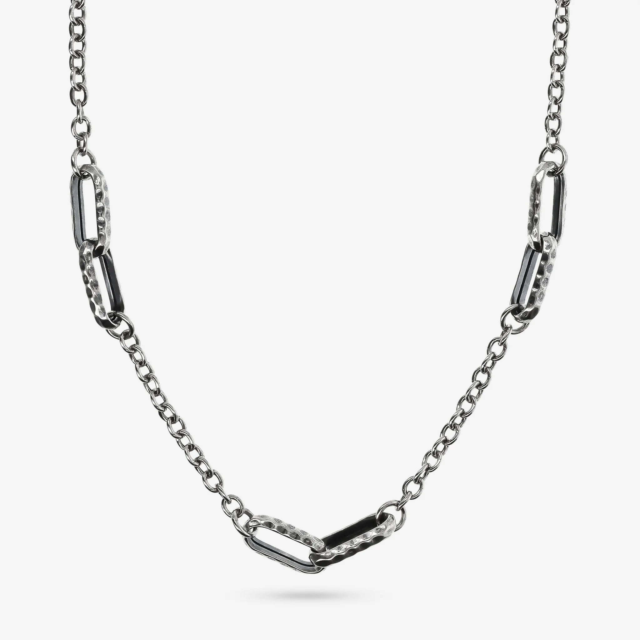 Albert M. men's choker necklace made of 925 silver with rolo chain alternating with oval links with a worked surface. Length 45+5 cm extension. Mermaid texture lobster clasp closure.