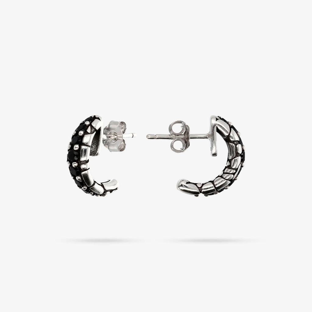 Albert M. women's lobe earrings made of 925 silver with a semicircle design with a textured surface, embellished with black spinels. Pin and butterfly closure.