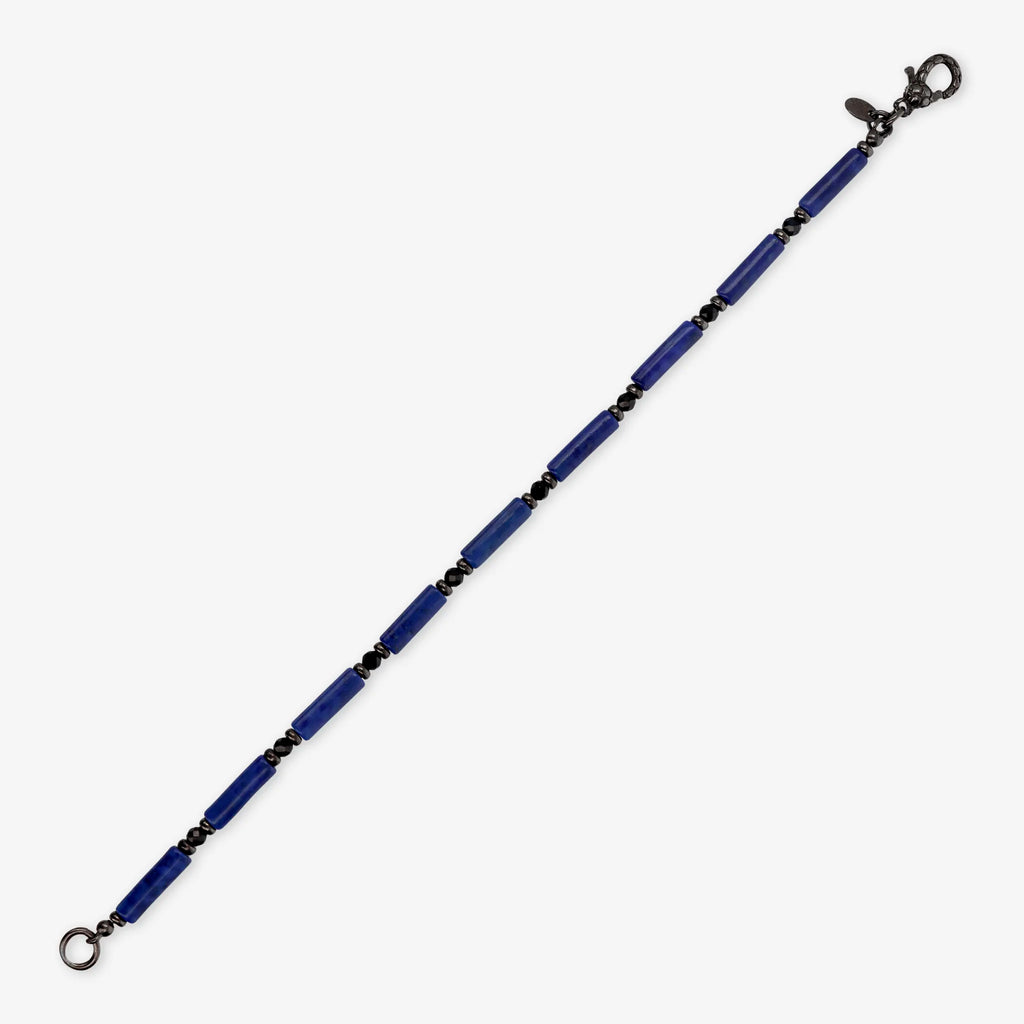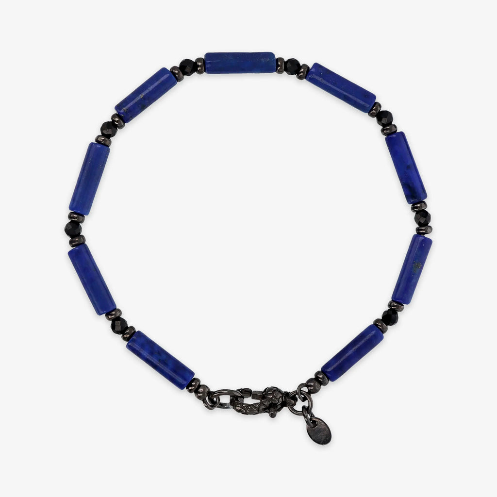 Albert M. men's bracelet made of 925 silver embellished with natural laspis lazuli stones, cylindrical cut, alternating with small black spinel spheres. Textured lobster clasp closure.