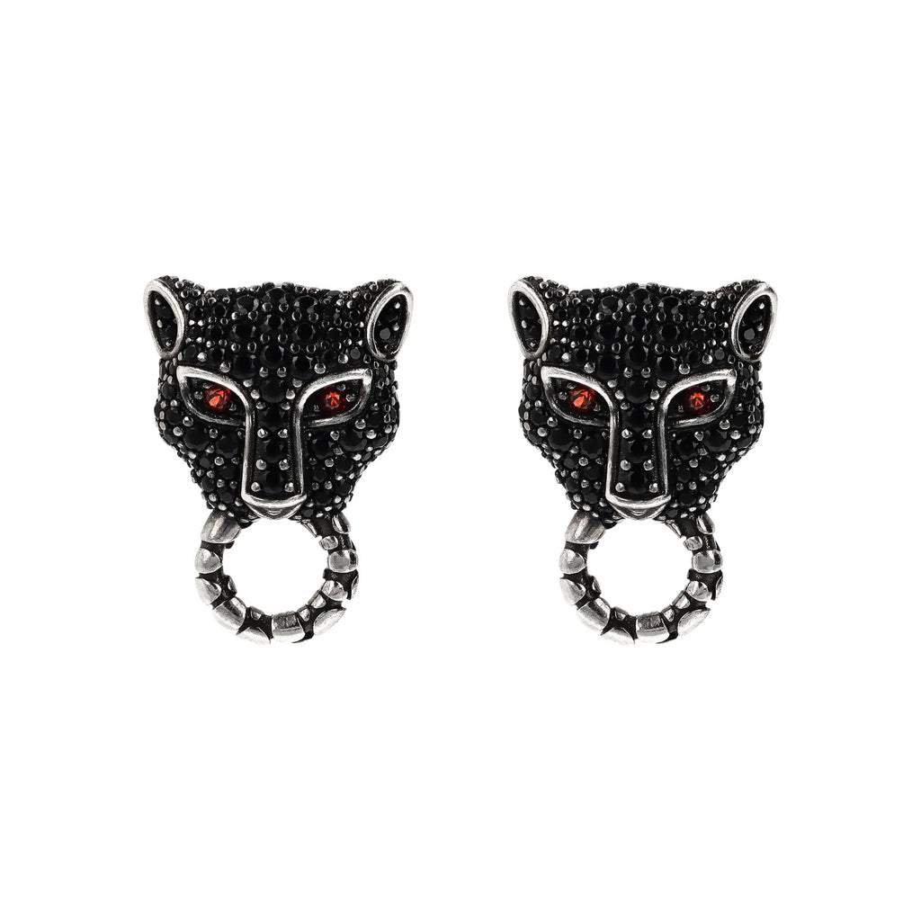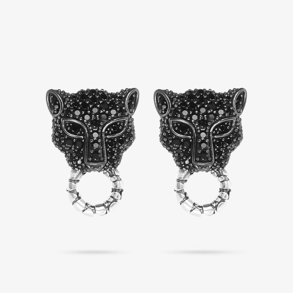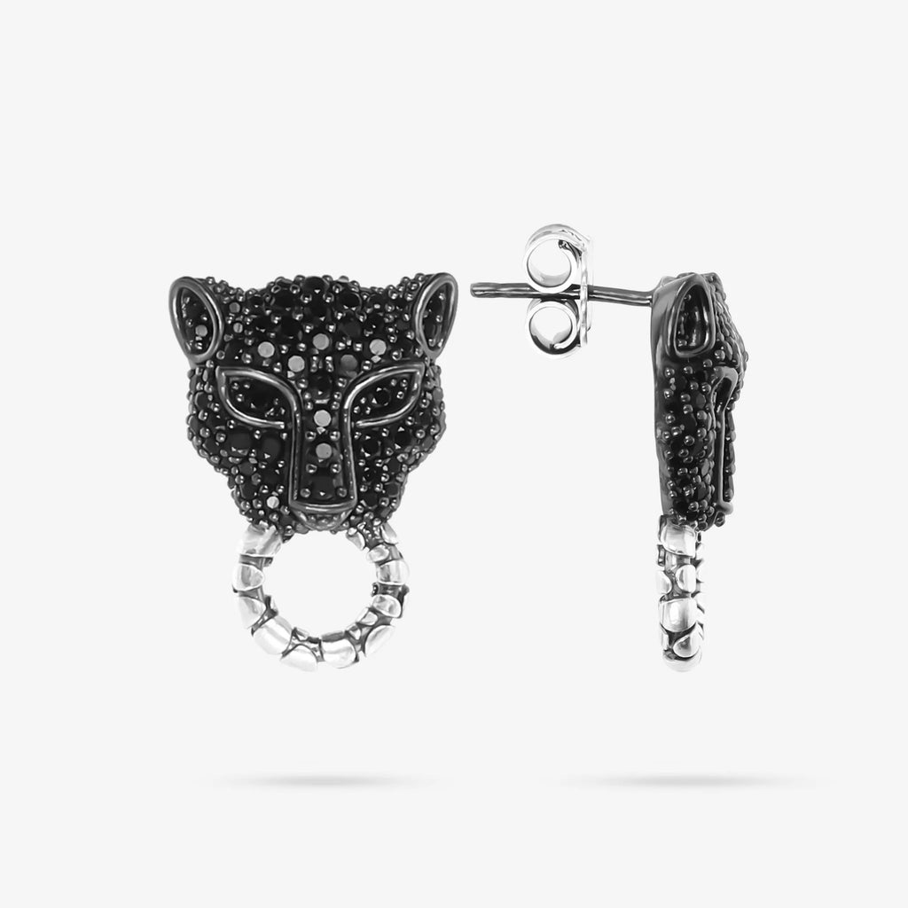 Boucles d'oreilles pendantes Albert M. réalisées sur une base en argent 925 avec un anneau tacheté et une panthère recouverte d'un pavé de pierres naturelles de spinelle noir ; fermeture clou et papillon.