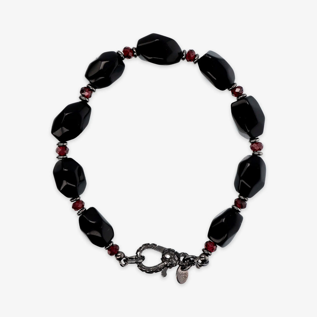 Bracelet pour homme en argent 925 agrémenté de pierres naturelles facettées, onyx noir et grenat rouge, de forme allongée et sphérique ; fermoir mousqueton texturé.
