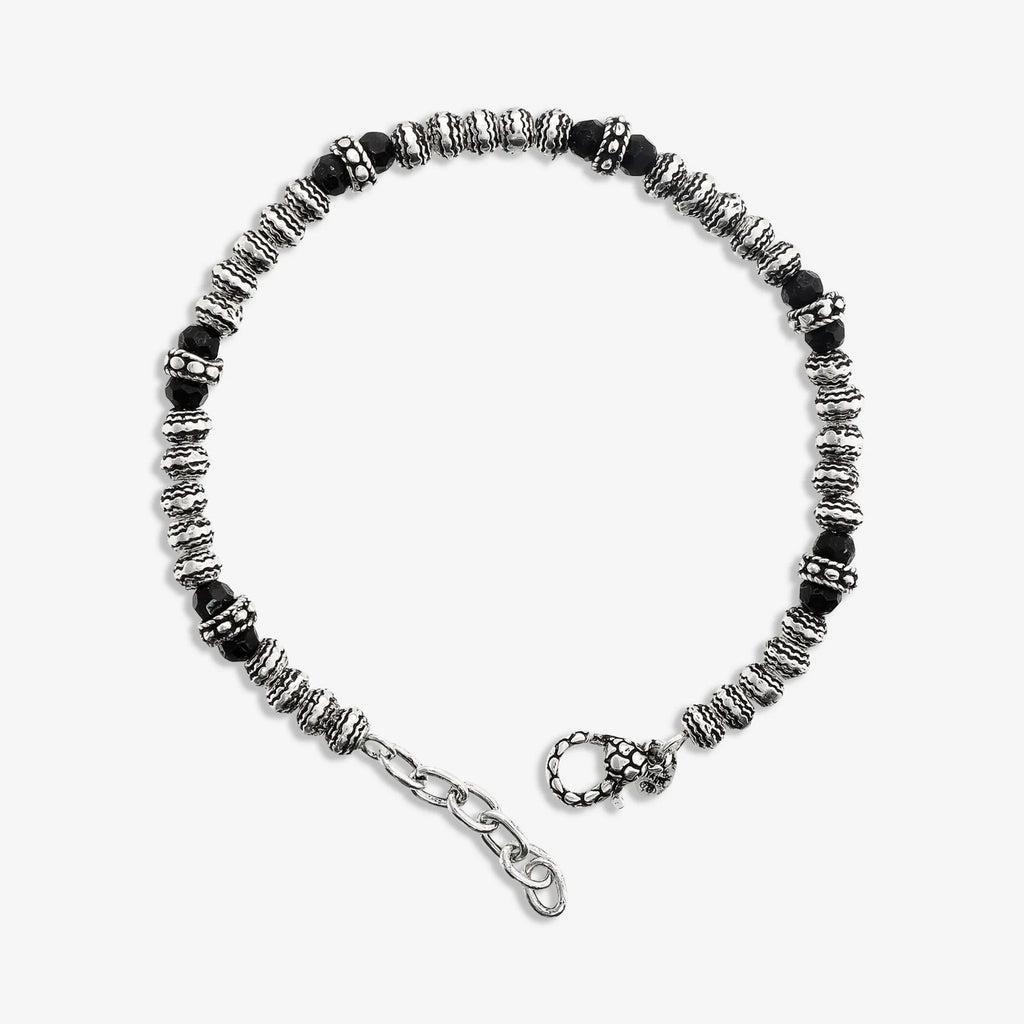 Bracelet en argent 925 avec pierres naturelles d'onyx noir facettées alternées avec des rondelles travaillées. Fermoir mousqueton avec extension.