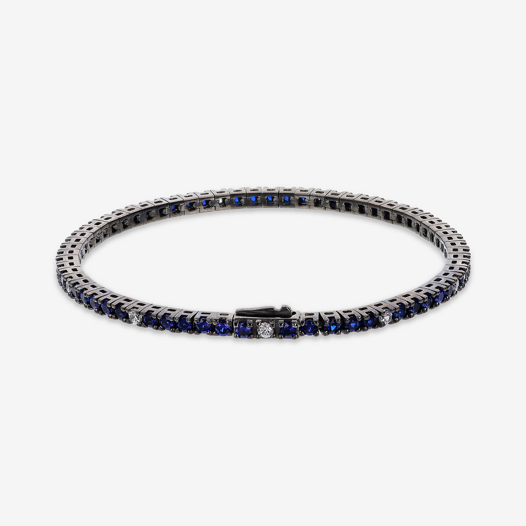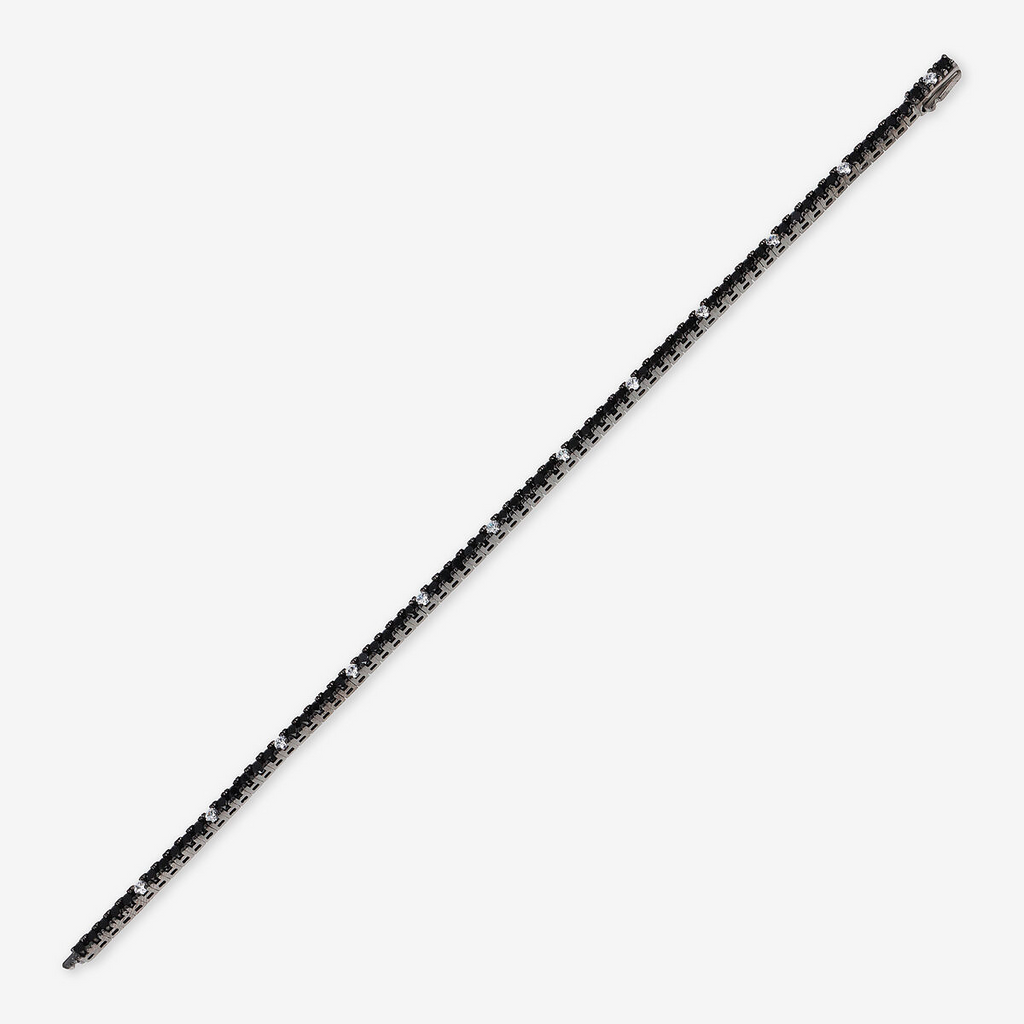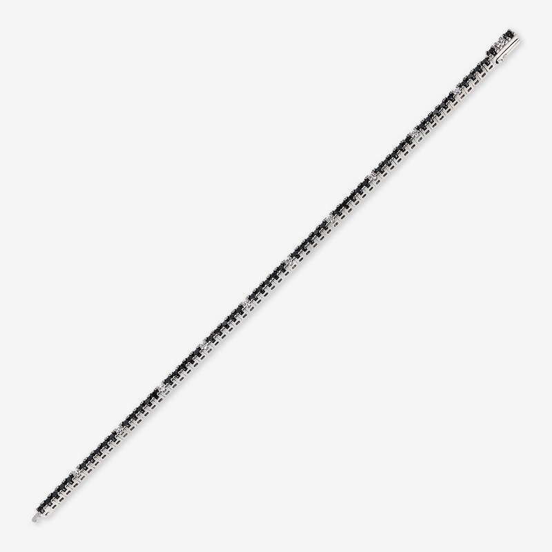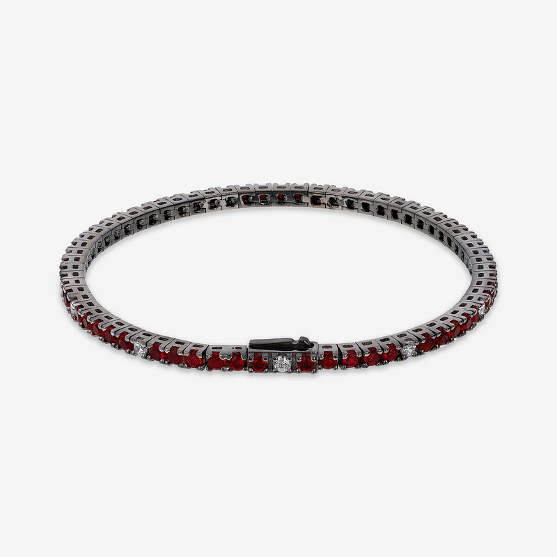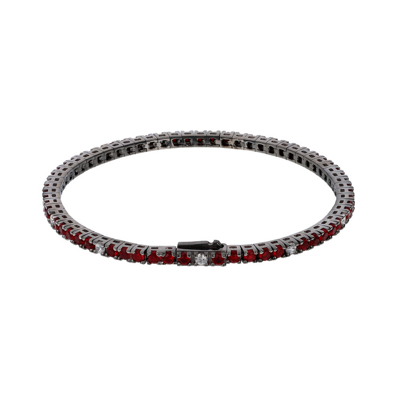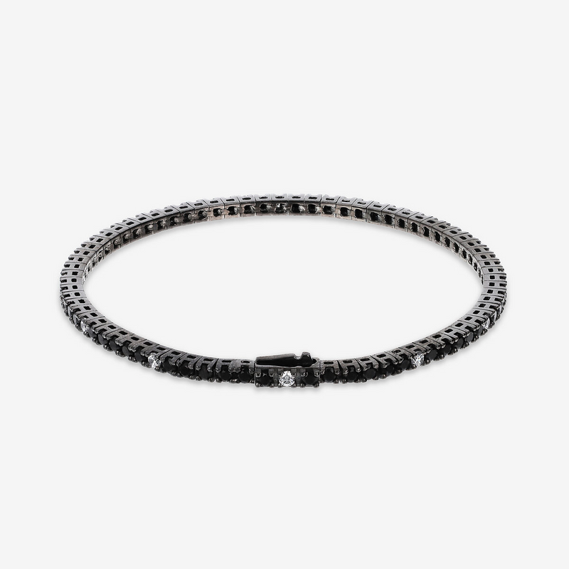 Bracelet tennis pour homme bicolore Albert M. réalisé sur une base en argent 925 agrémentée de zircons cubiques de forme ronde. La particularité de ce bracelet est que même le fermoir boîte est recouvert de zircone cubique, une qualité lumineuse. Disponible en deux tailles : petite (19 cm) et grande (21 cm) et avec placage Ruthénium ou Rhodium.