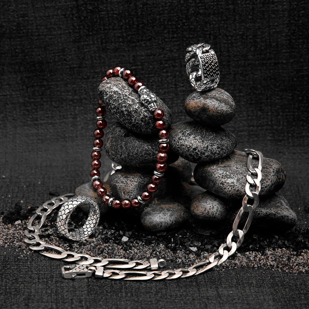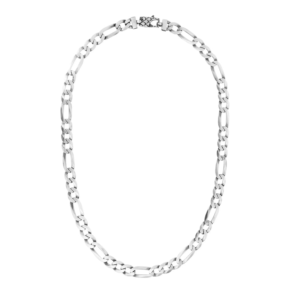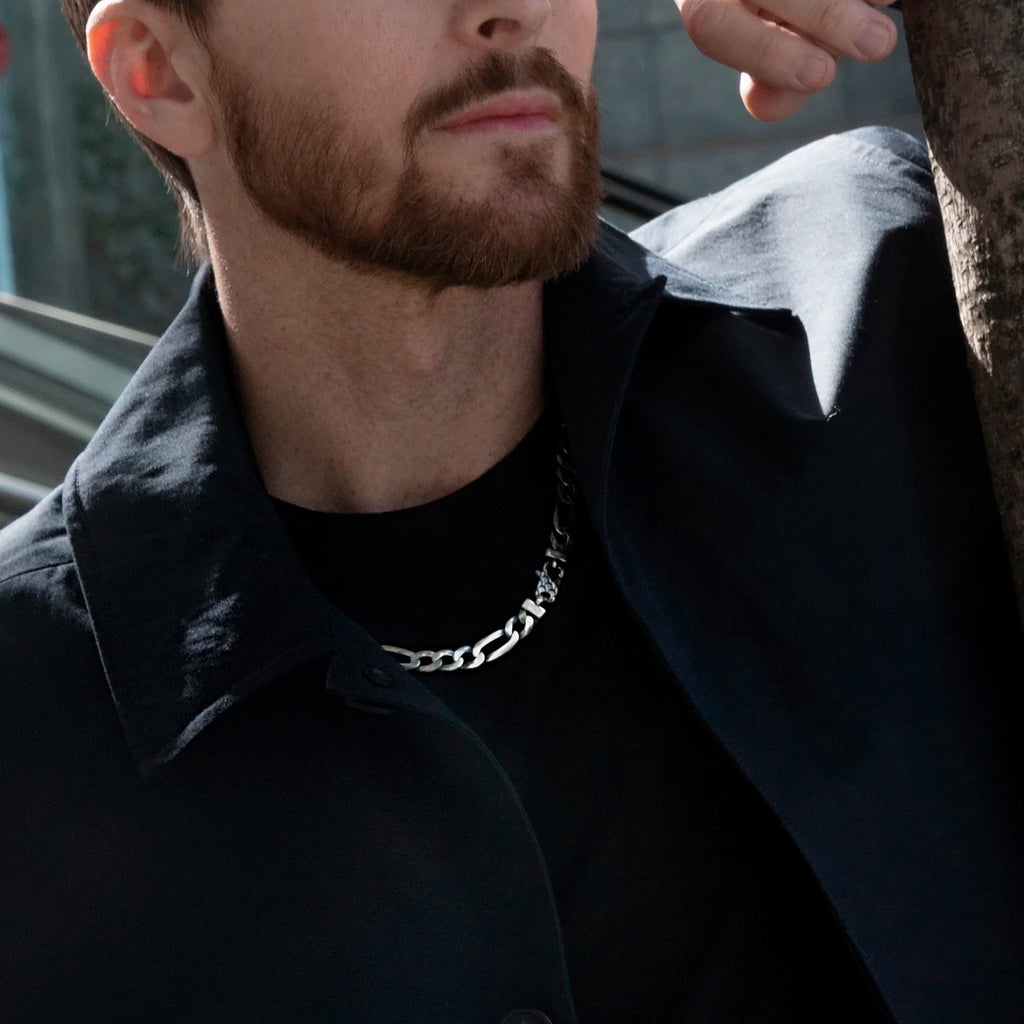 Collier homme Albert M. réalisé sur une base en argent 925 composé d'une chaîne figaro; fermoir mousqueton rectangulaire avec texture sirène. Création qui se porte facilement avec n'importe quelle tenue.