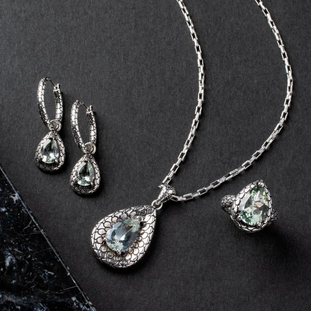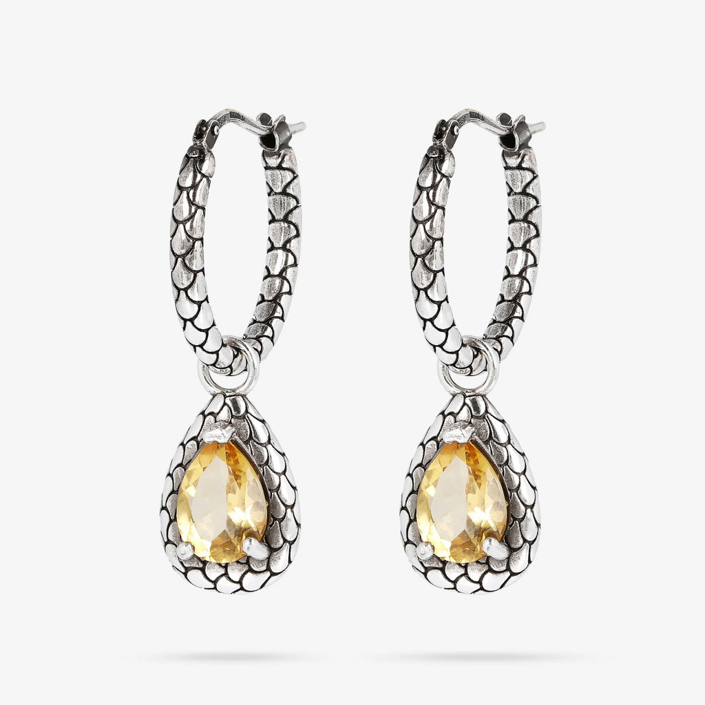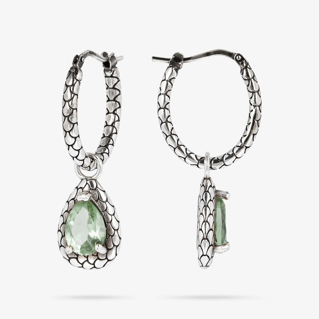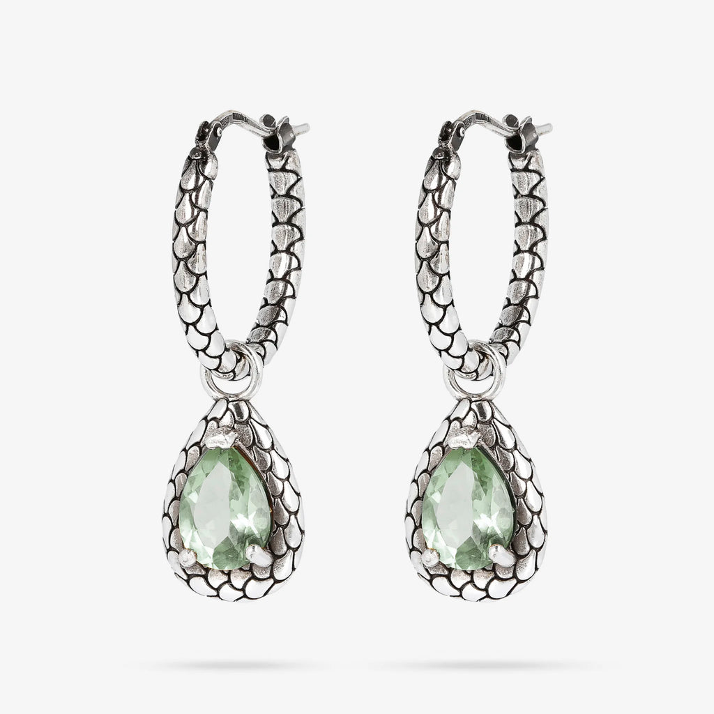Boucles d'oreilles créoles Albert M. réalisées sur une base en argent 925 avec pendentifs en forme de goutte et texture sirène sur laquelle sont positionnées deux pierres naturelles (citrine jaune ou améthyste verte); fermeture à baïonnette; longueur de 3,7 cm. La texture particulière donne une note sensuelle et mystérieuse à cette création.