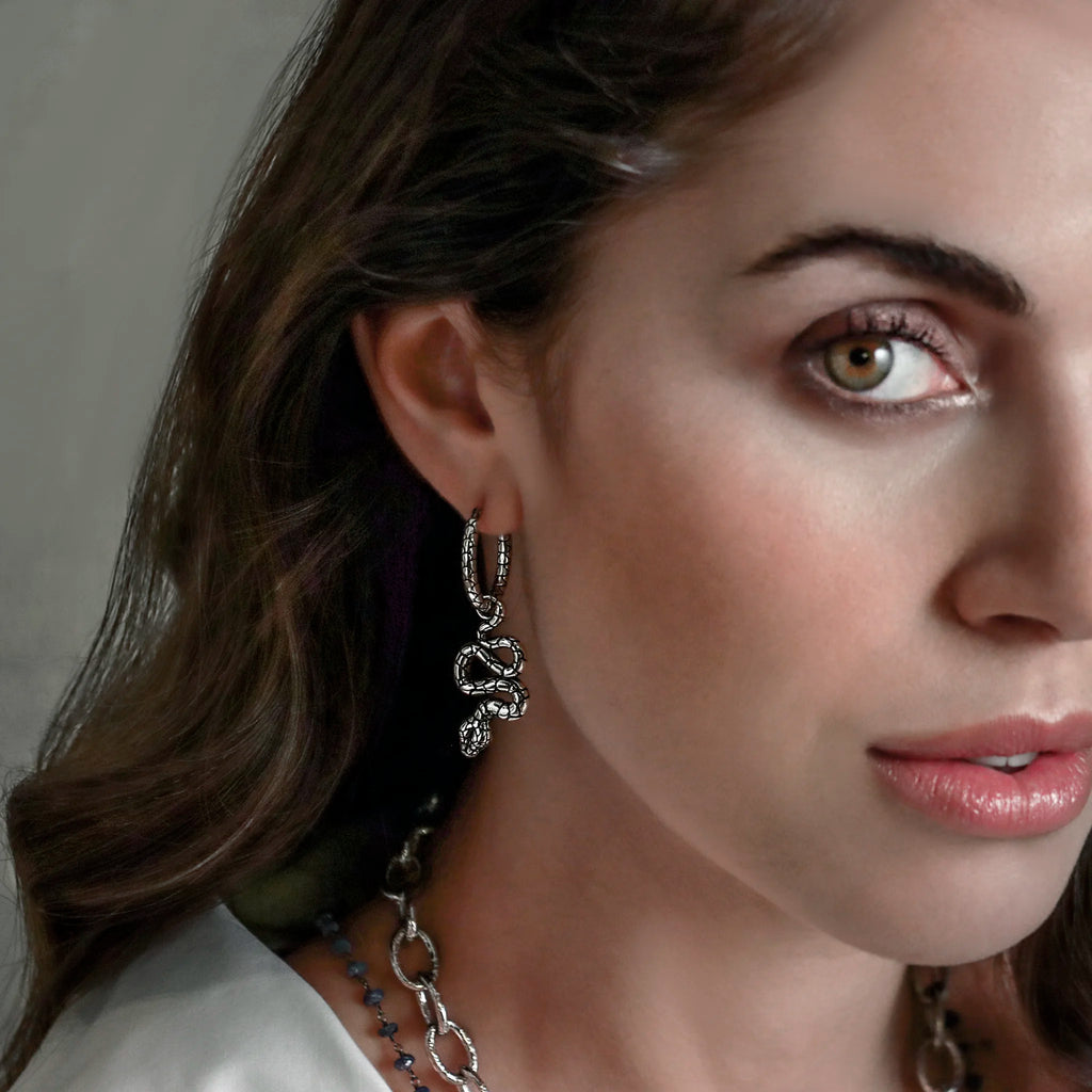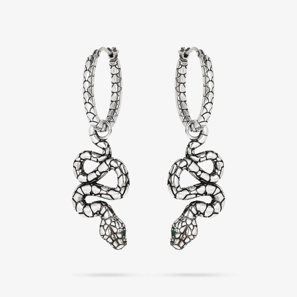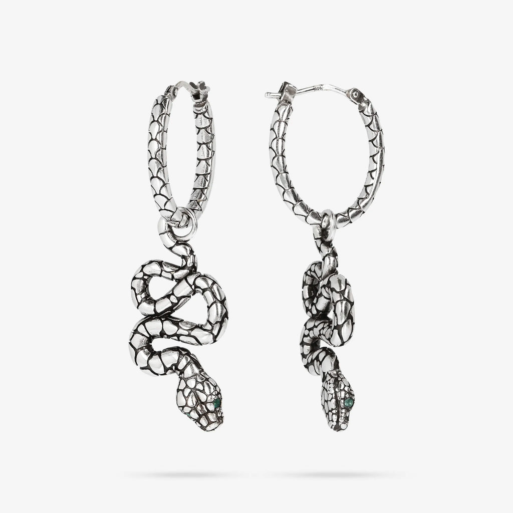 Boucles d'oreilles créoles Albert M. réalisées sur une base en argent 925 à texture sirène et pendentif en forme de serpent dont les yeux sont en pierre naturelle d'agate verte; fermeture à baïonnette; longueur de 4,5 cm. La texture particulière donne une note sensuelle et mystérieuse à cette création.