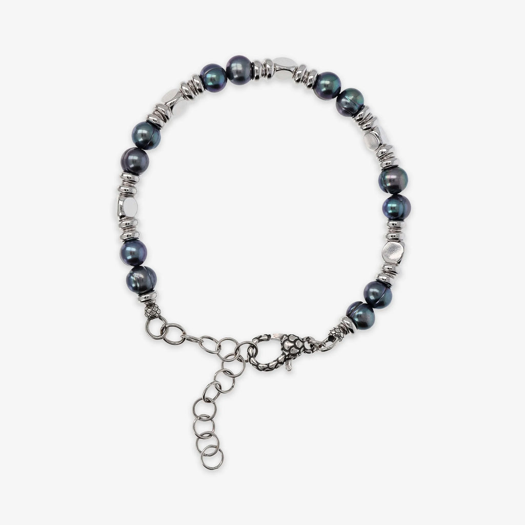 Bracelet pour homme Albert M. en argent 925 agrémenté de rondelles lisses, de perles facettées et de perles d'eau douce grises cerclées de forme arrondie d'un diamètre d'environ 6/7 mm. Fermoir mousqueton avec texture sirène.