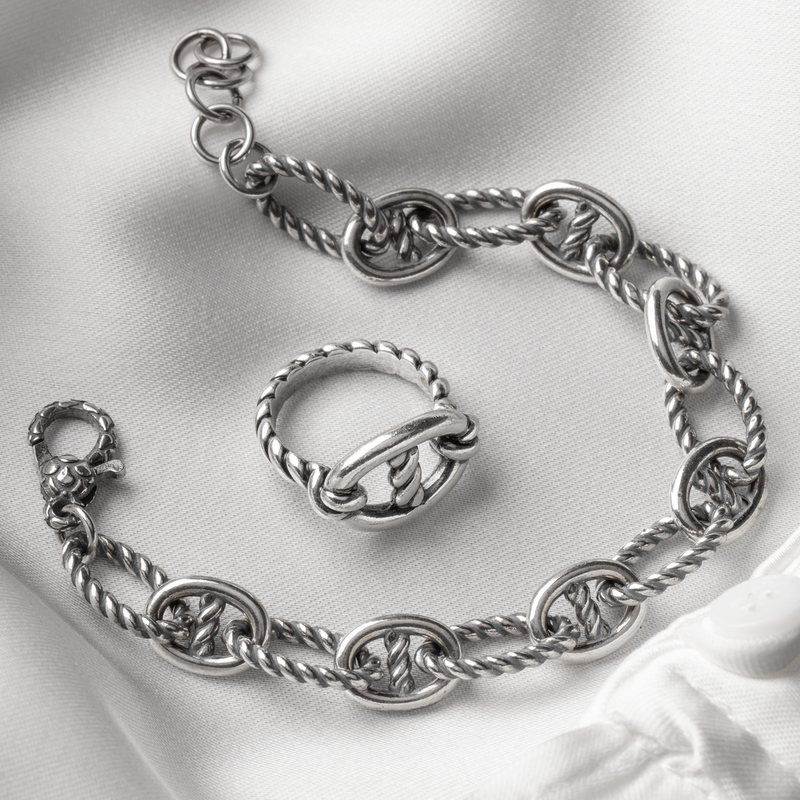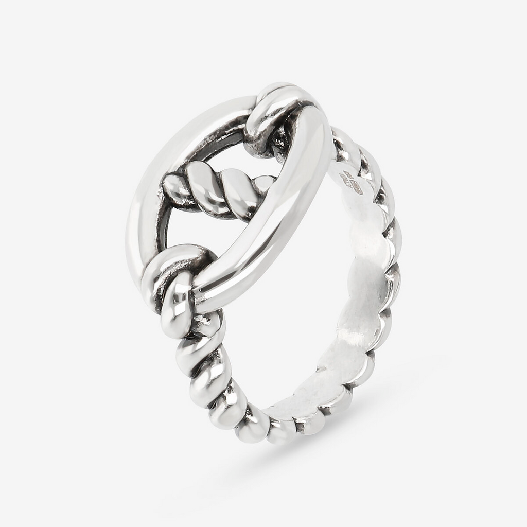 La bague maille corde marine et texture corde en argent 925 par Albert M. est un bijou d'une élégance raffinée. Il est assorti aux boucles d'oreilles et au bracelet de la parure.
