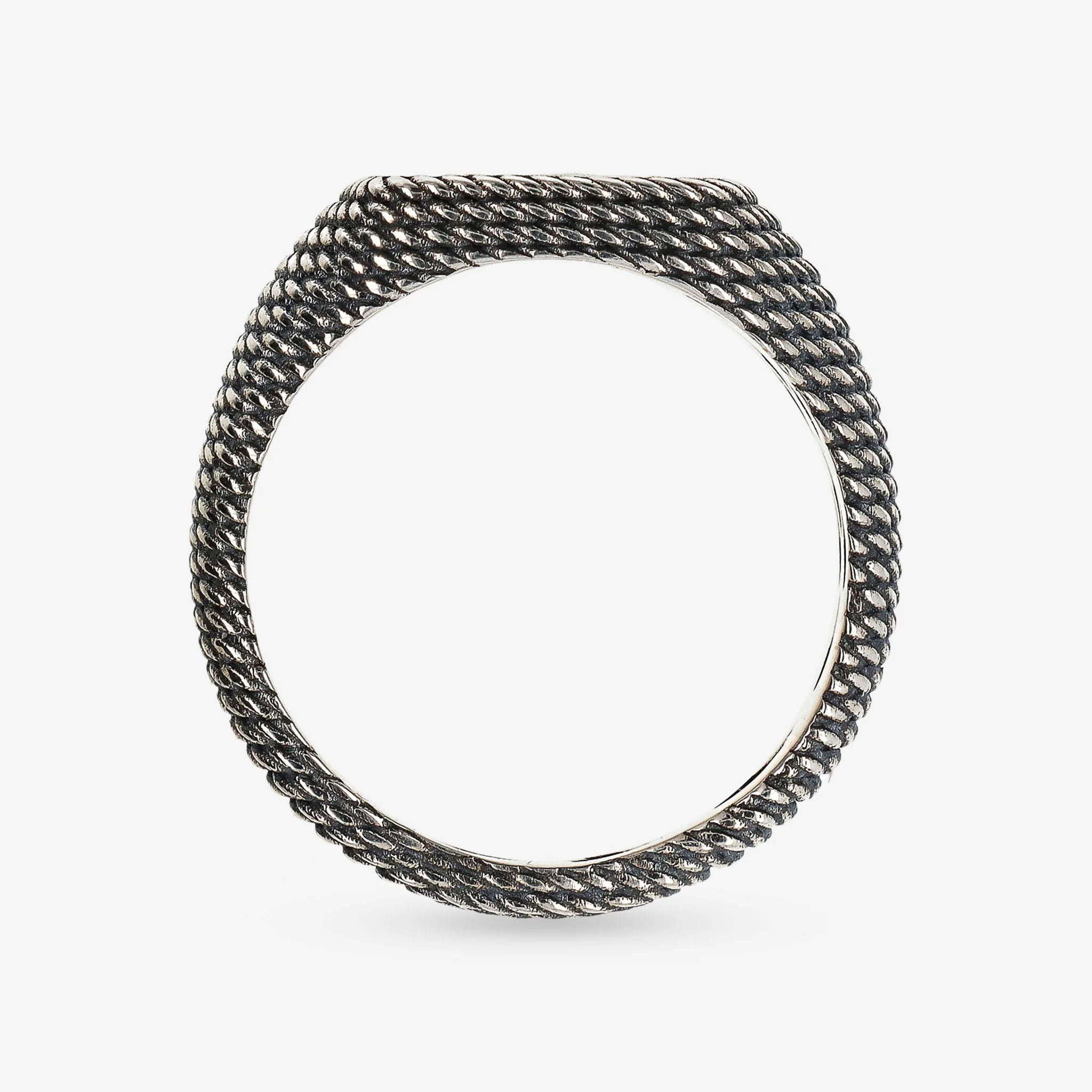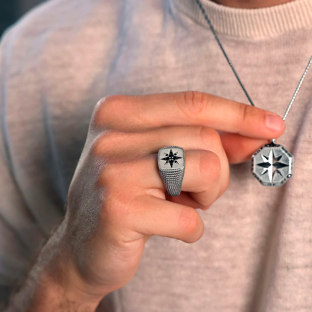 Anello chevalier uomo Albert M. realizzato in Argento 925 con superficie texture e Rosa dei Venti incisa con pavé di spinello nero.