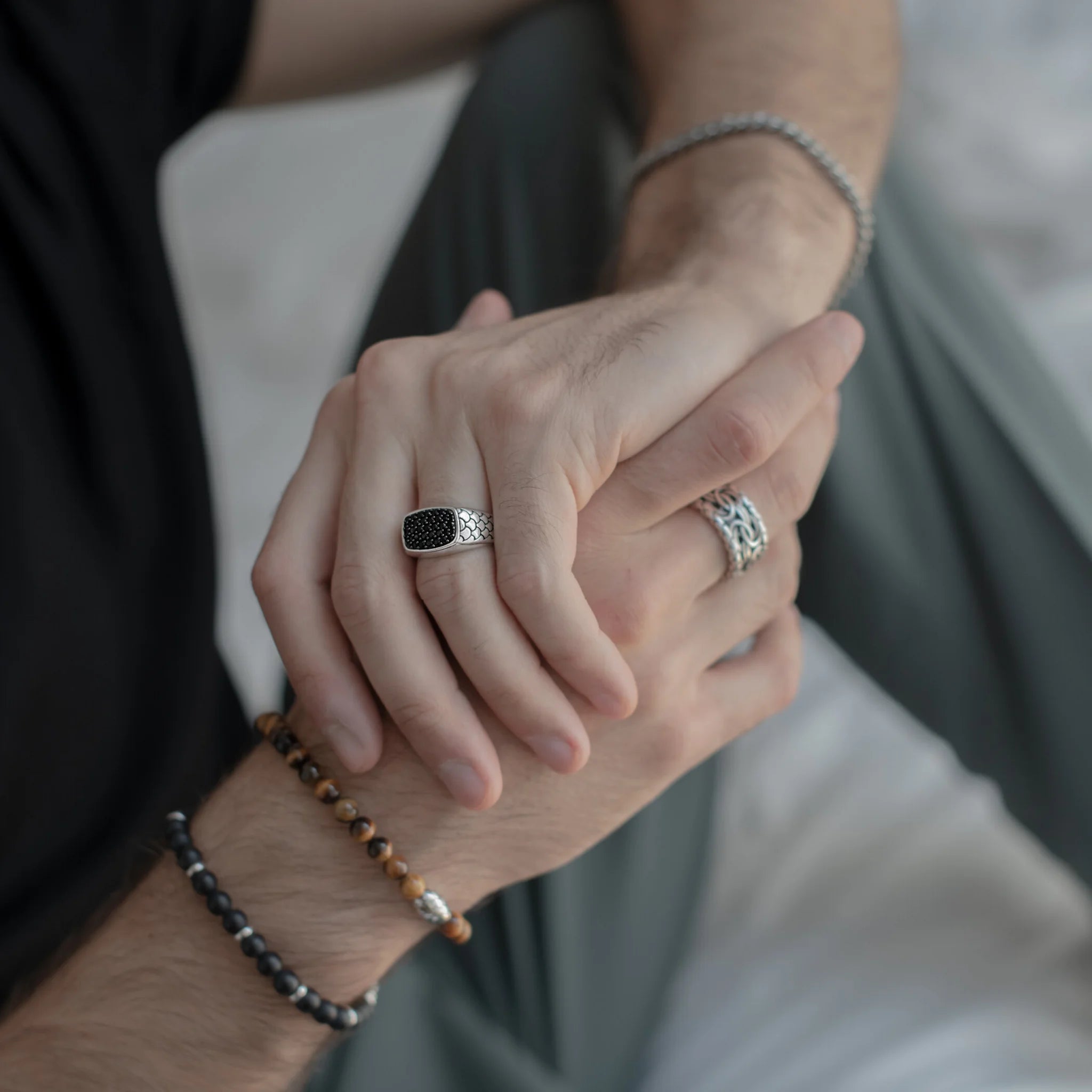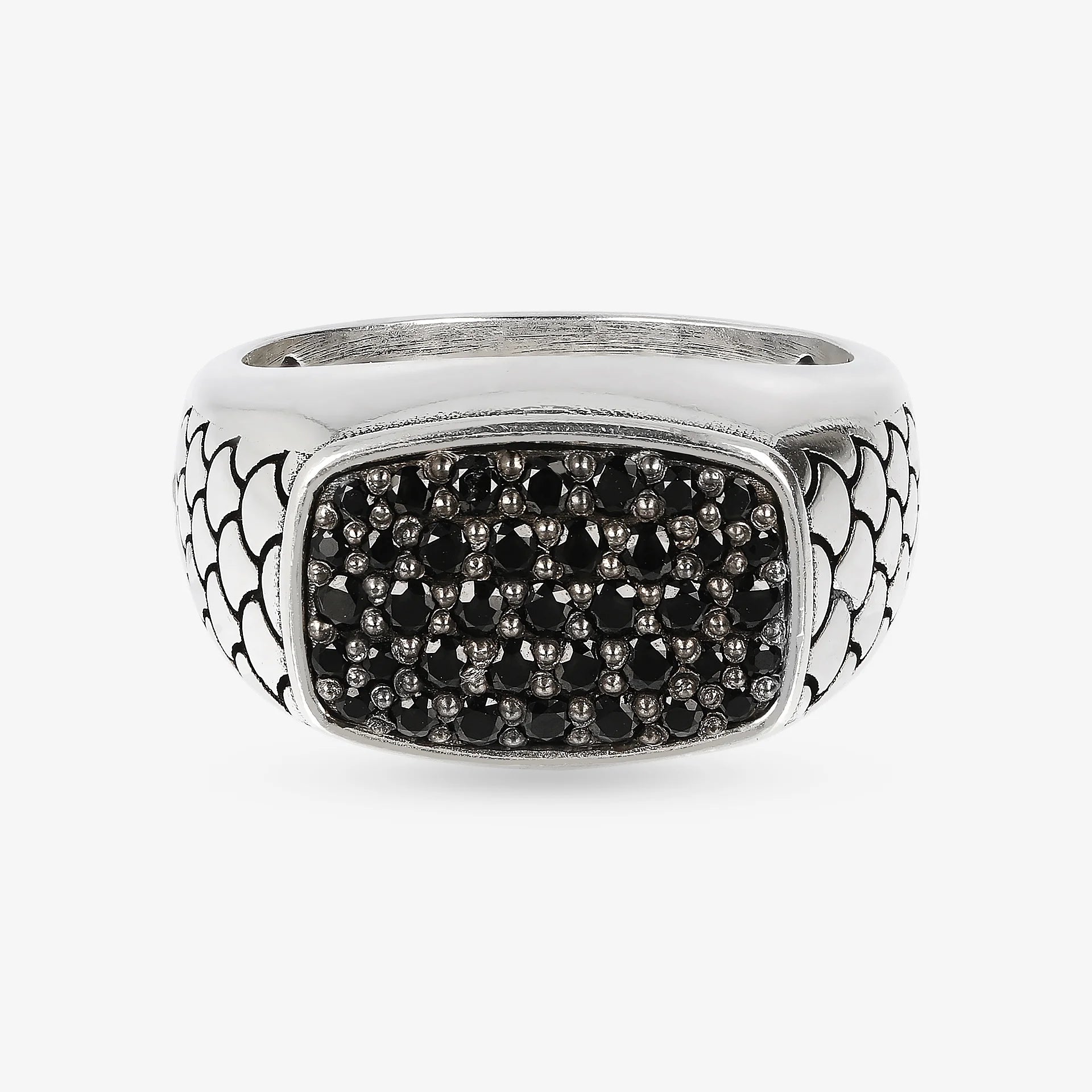 Anello chevalier uomo Albert M. realizzato su base di argento 925 dalla texture sirena con elemento rettangolare (22x25 mm) pavé in pietra naturale spinello nero. Creazione dal design definito che può essere facilmente indossata con qualsiasi abito.