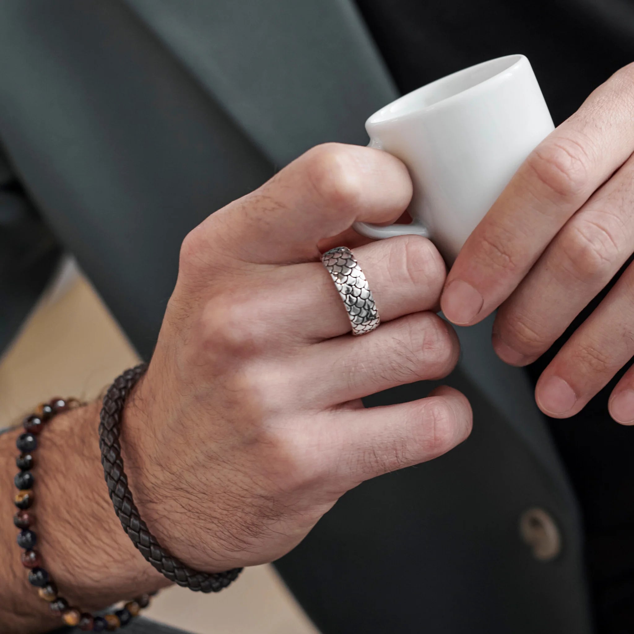 Anello a fascia uomo Albert M. realizzato su base di argento 925 dal design classico con texture sirena. Creazione dal design definito che può essere facilmente indossata con qualsiasi abito.