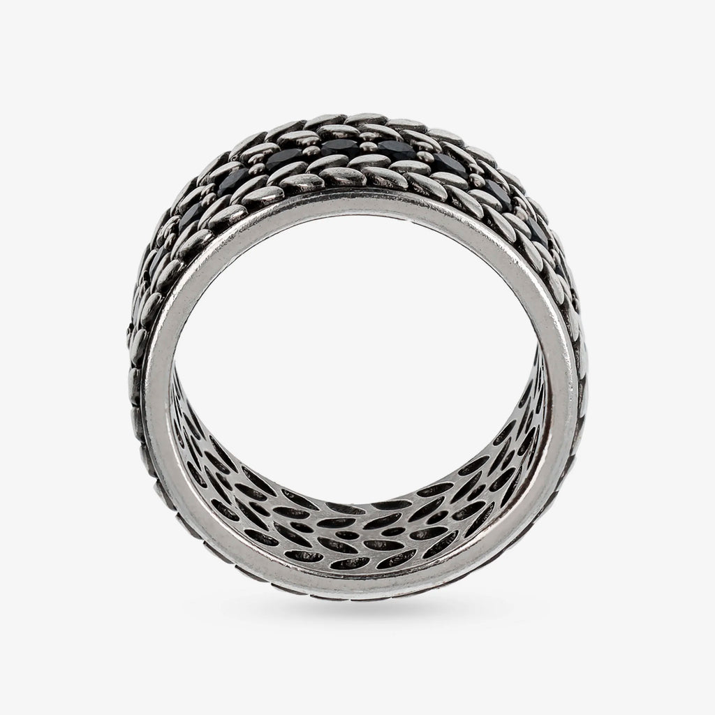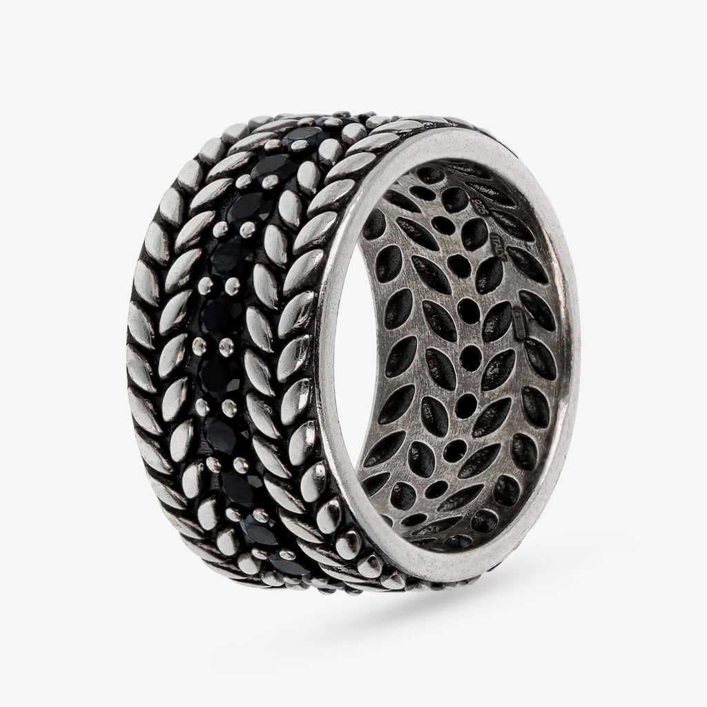 Anello a fascia uomo Albert M. realizzato in Argento 925 dalla texture corda impreziosito da punti luce in pietra naturale spinello nero.