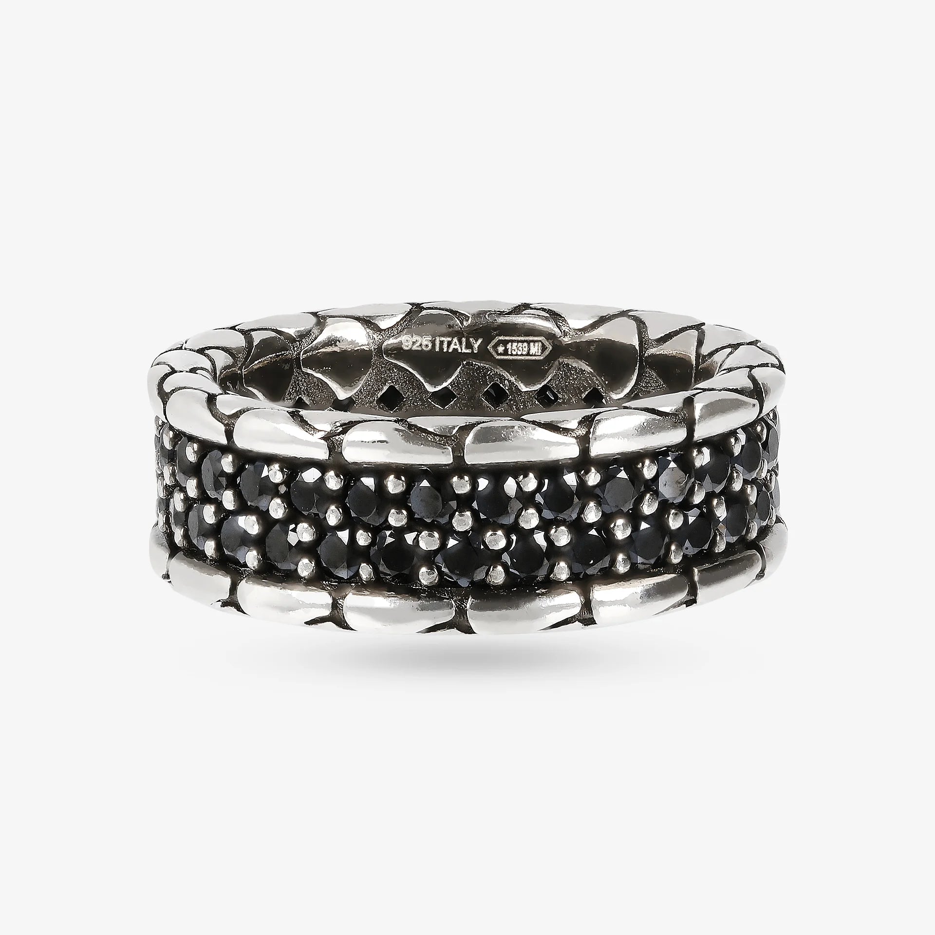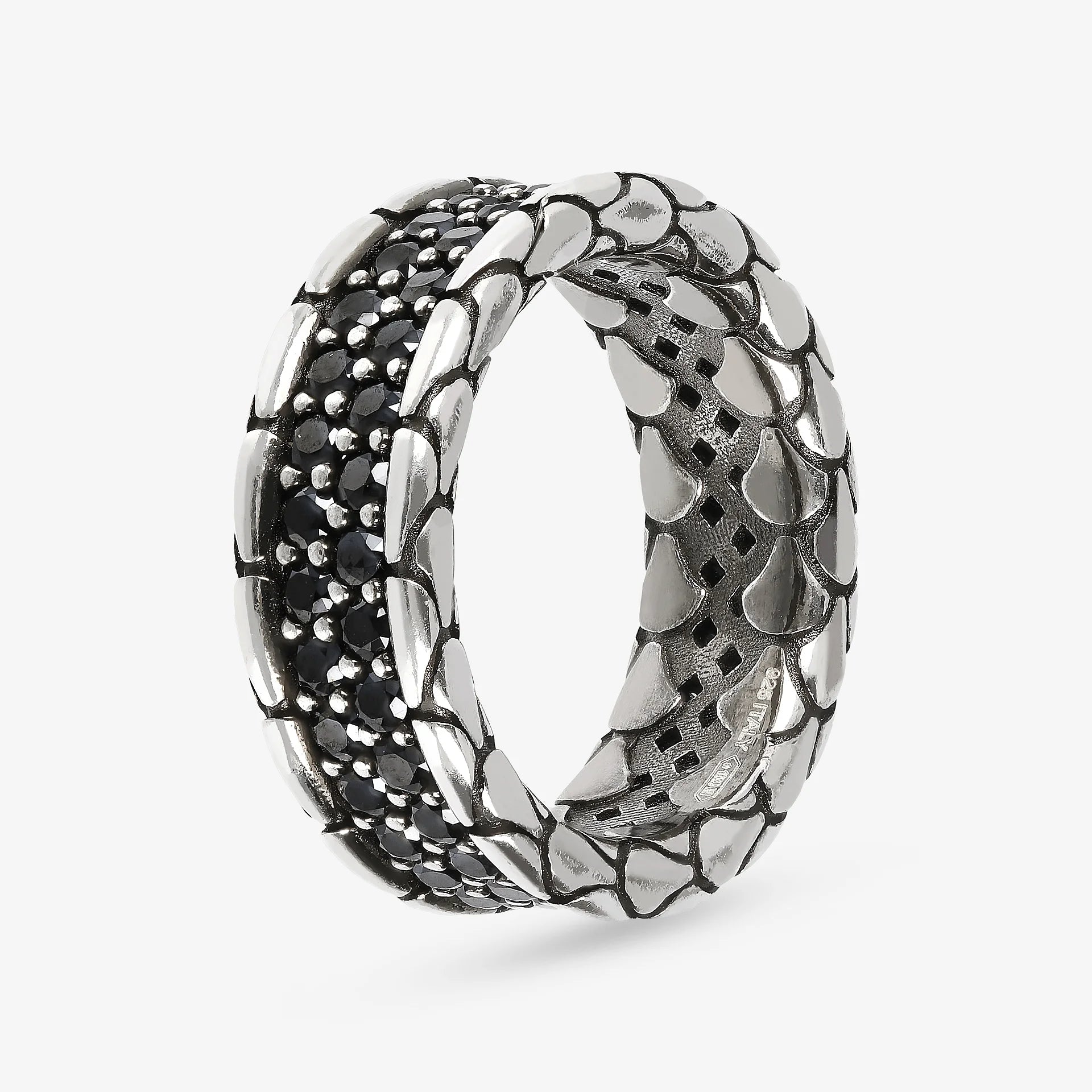 Anello a Fascia Texture Sirena con Doppia Fila di Spinelli Neri in Argento 925