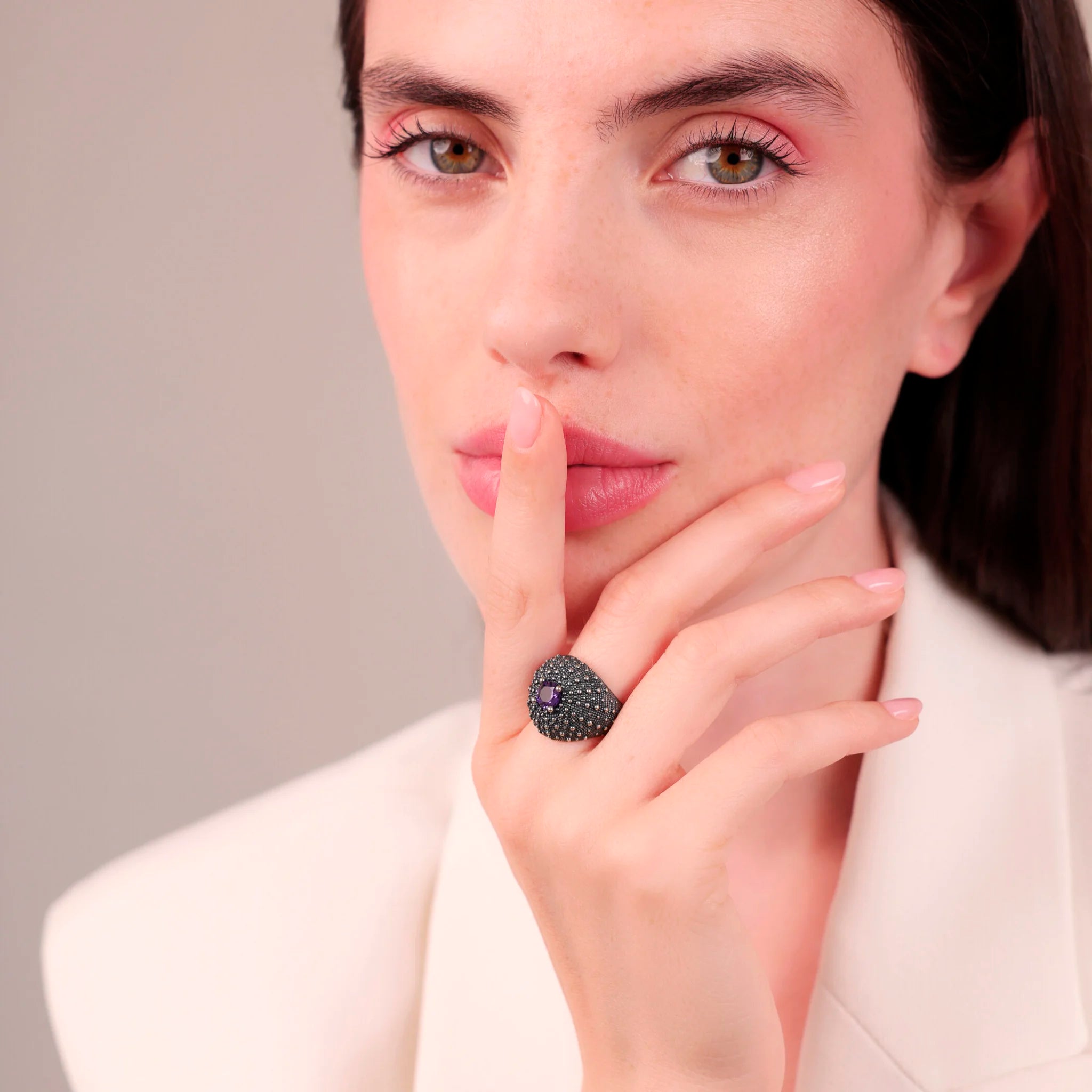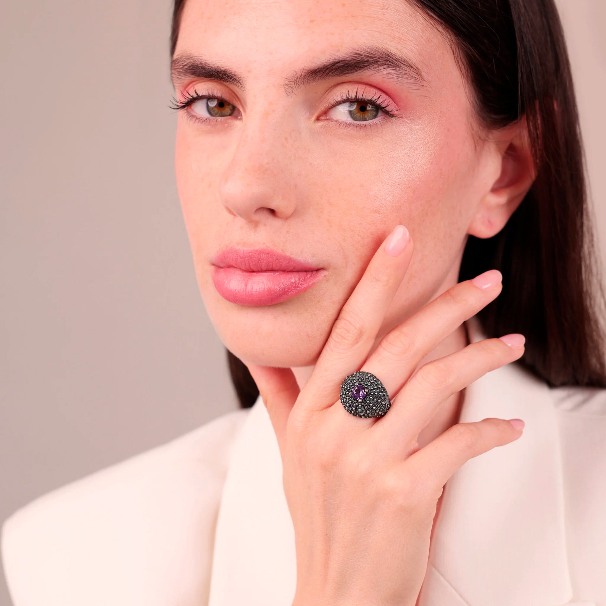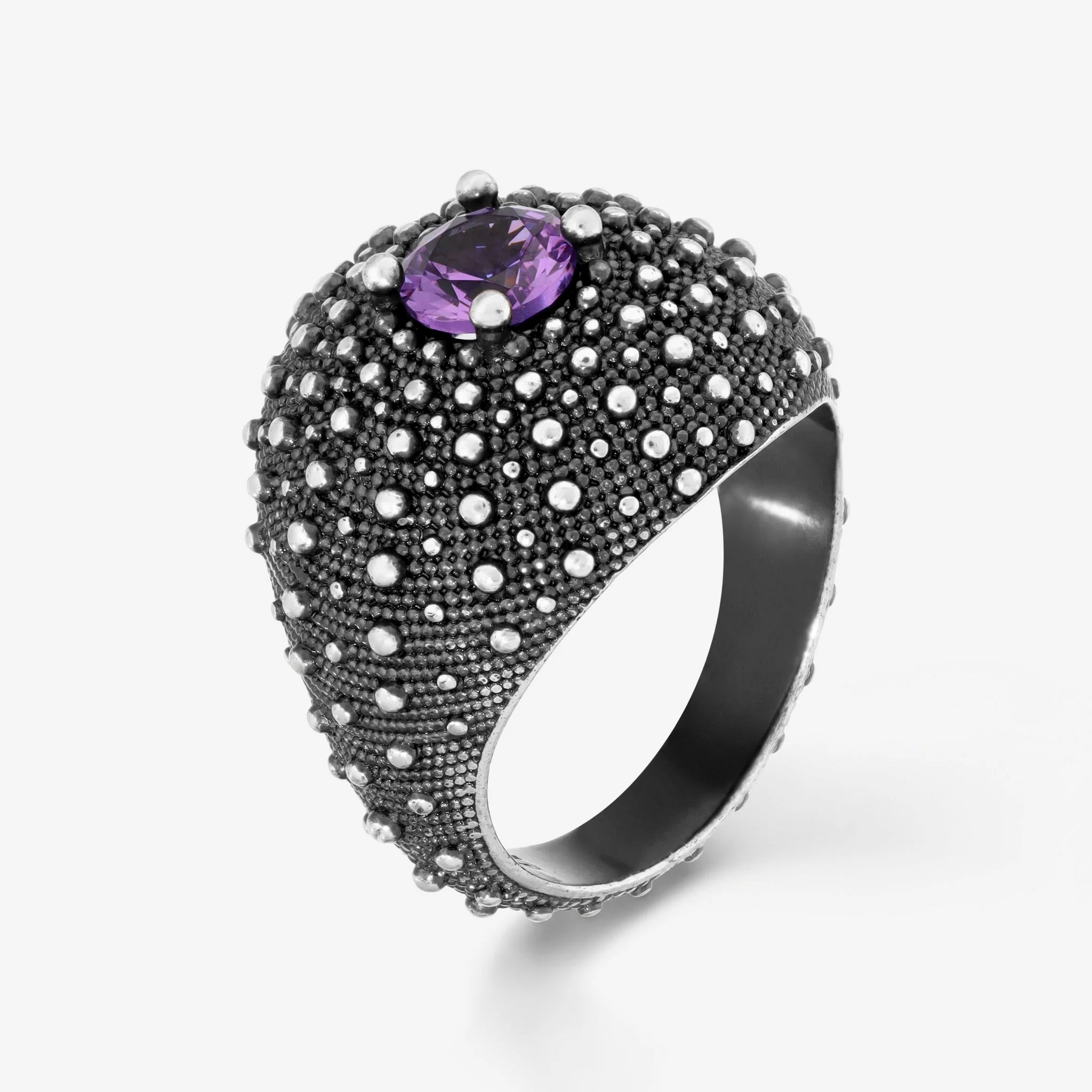 Anello a fascia graduato in Argento 925, placcato Rutenio, con superficie texture riccio di mare e pietra naturale sfaccettata (6 mm).