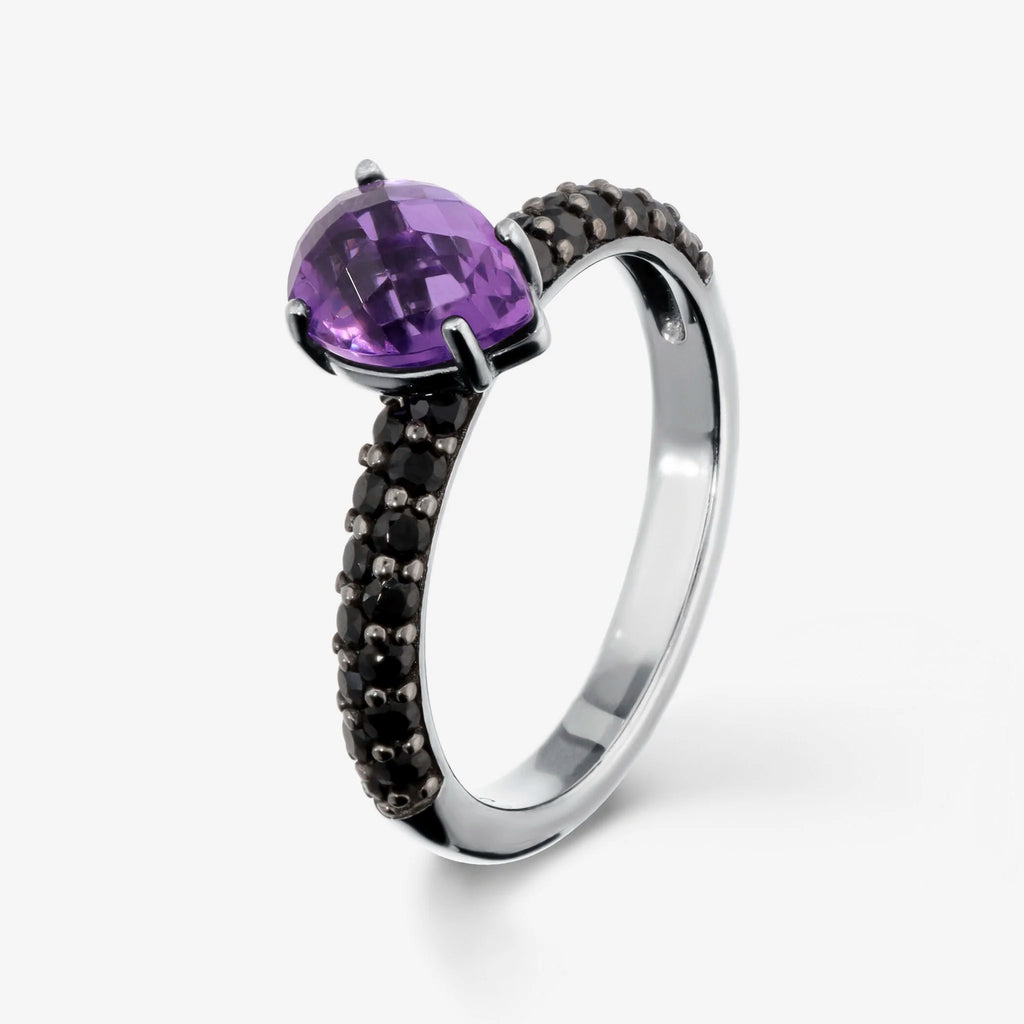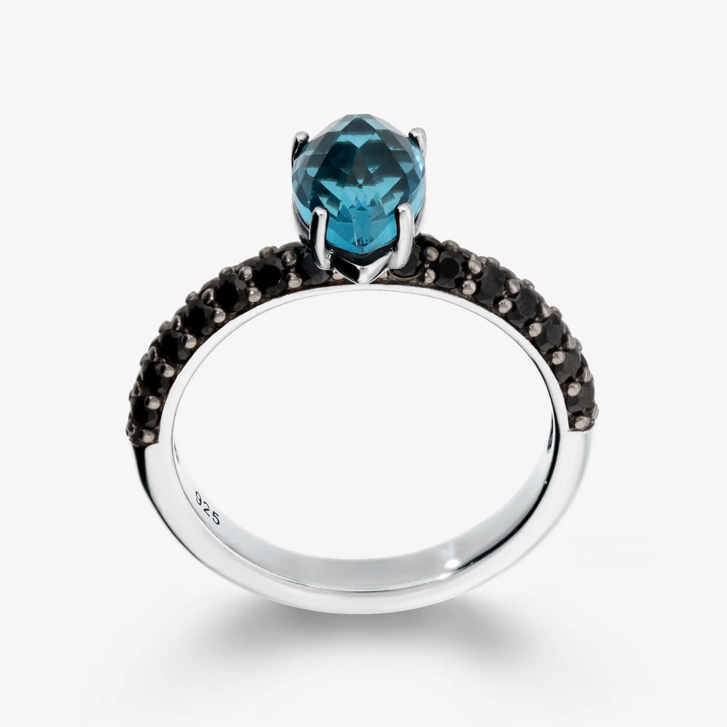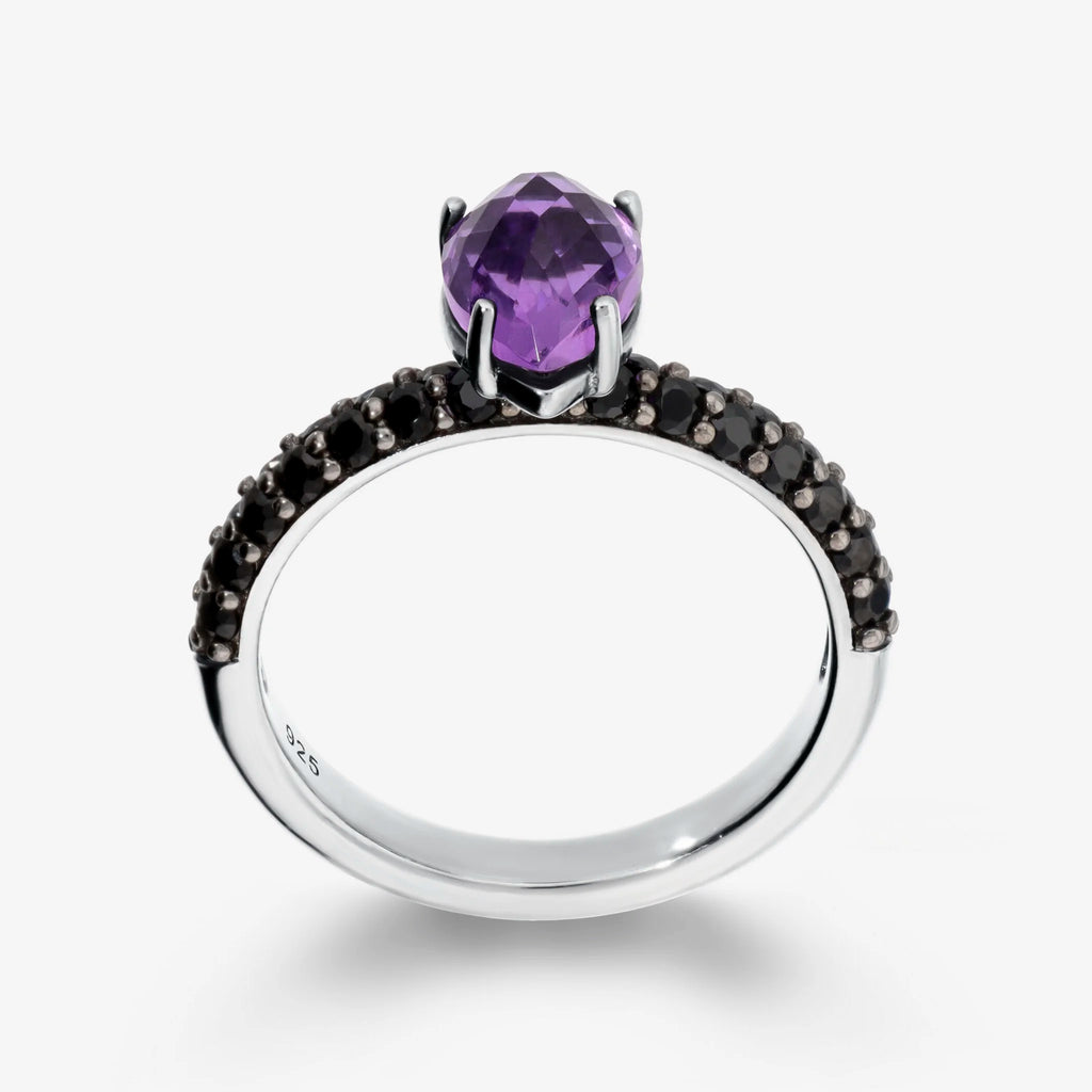 Anello solitario Albert M. realizzato in Argento 925 con pavé di spinelli neri e pietra centrale a forma di goccia.