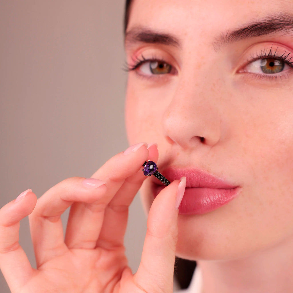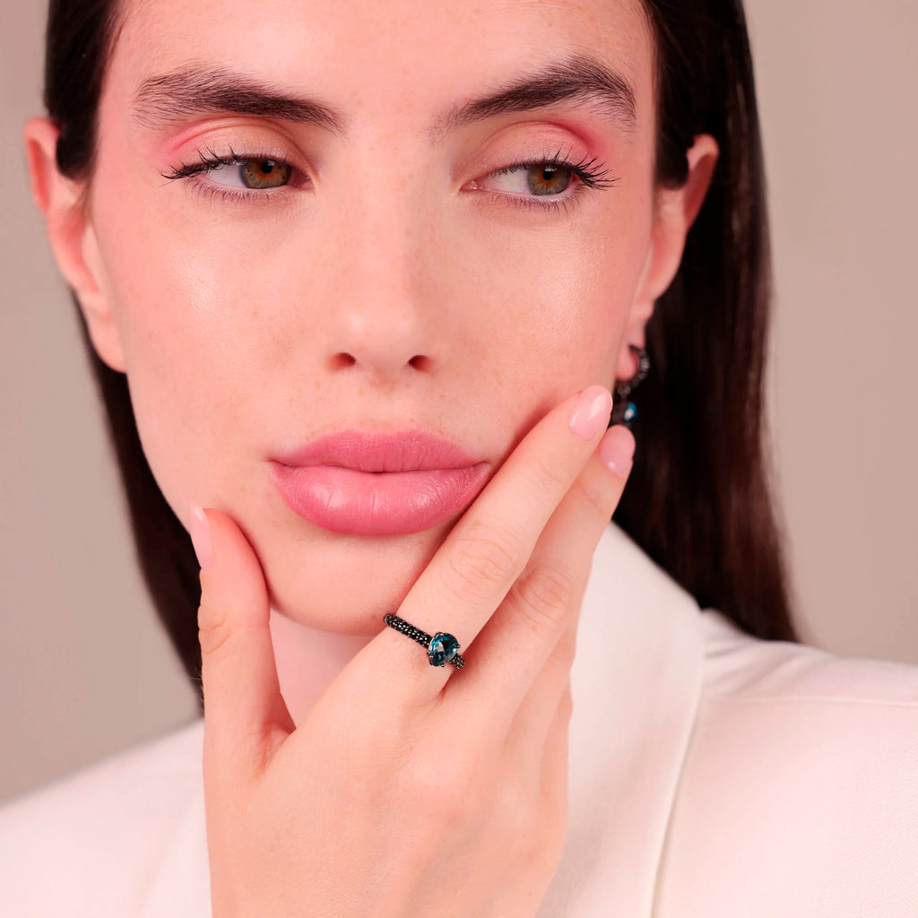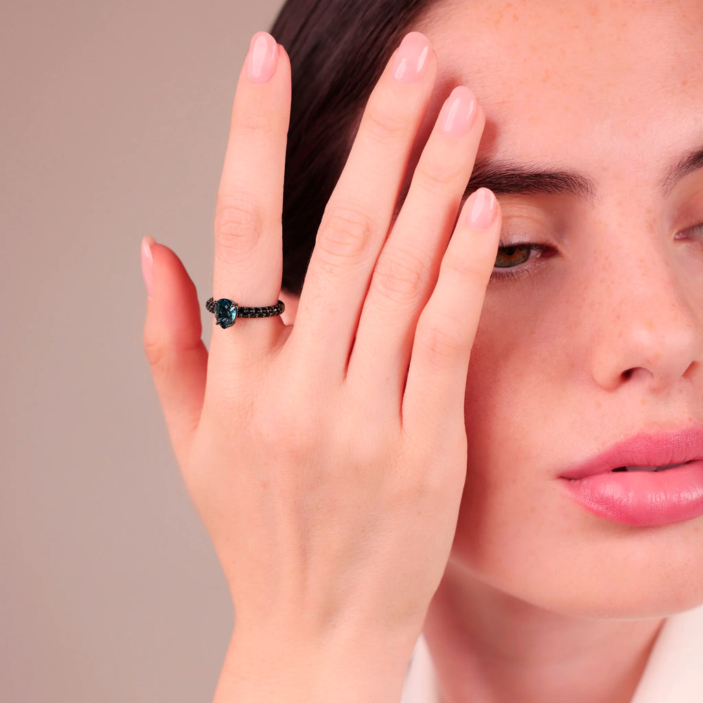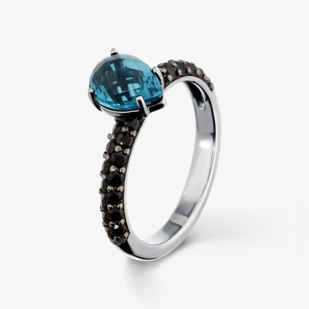 Anello solitario Albert M. realizzato in Argento 925 con pavé di spinelli neri e pietra centrale a forma di goccia.