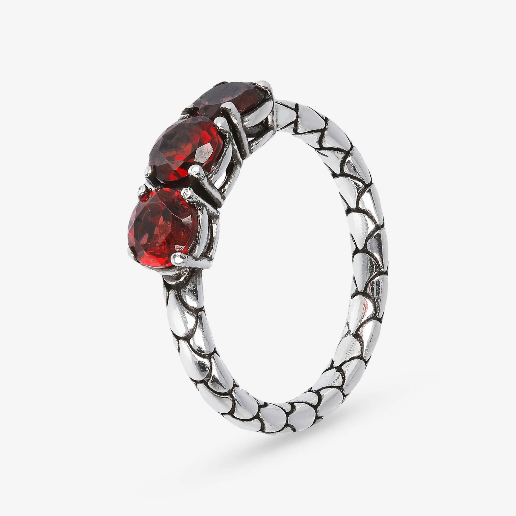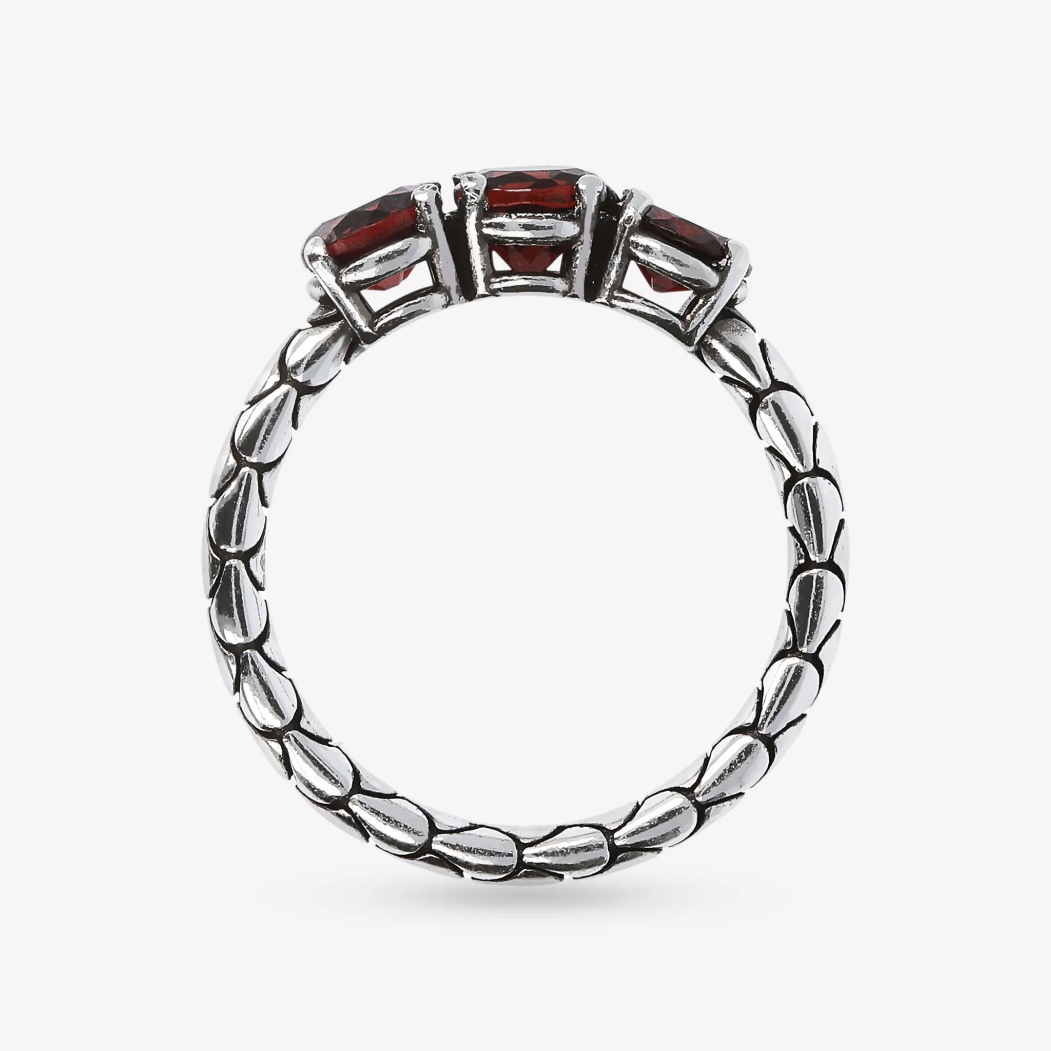 Anello fedina trilogy Albert M. in Argento 925 dalla texture sirena impreziosito da tre pietre naturali centrali di granato rosso.