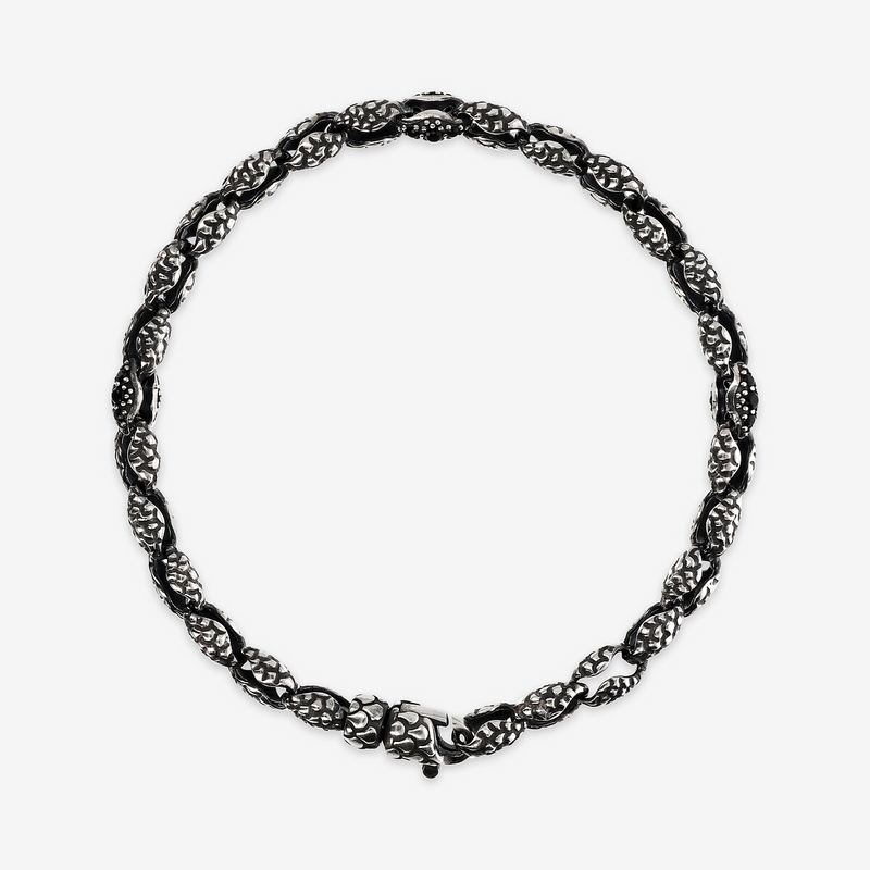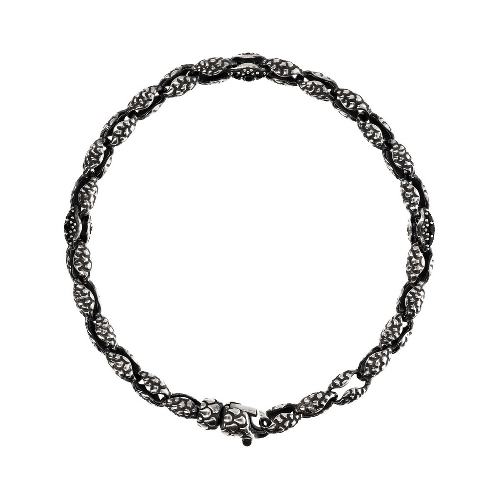 Bracciale uomo Albert M. realizzato su base di argento 925 impreziosito da maglie texture dalla forma originale che richiama le conchiglie del corallo e da quattro punti luce in pietra naturale spinello nero; chiusura a moschettone texture sirena. Disponibile in due misure: small (19 cm) e large (21 cm).