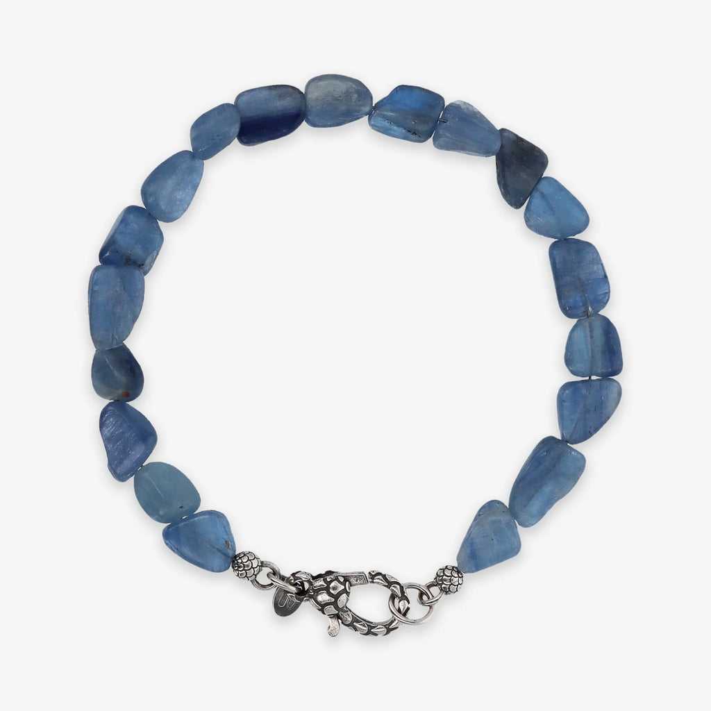 Bracciale uomo Albert M. realizzato su base di argento 925 impreziosito da particolari pepite dalla forma irregolare in pietra naturale crisocolla con sfumature che vanno dal blu scuro al turchese; chiusura a moschettone con texture serpente.