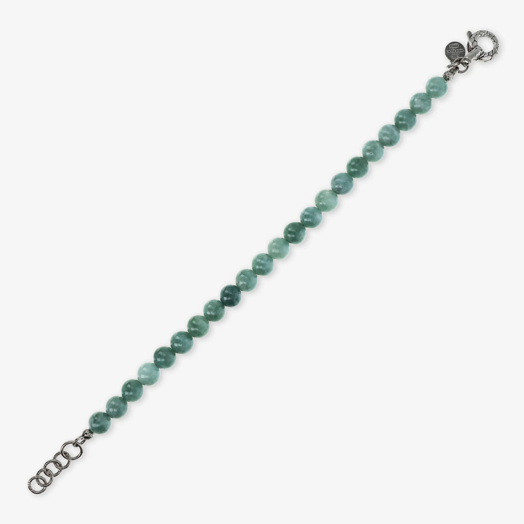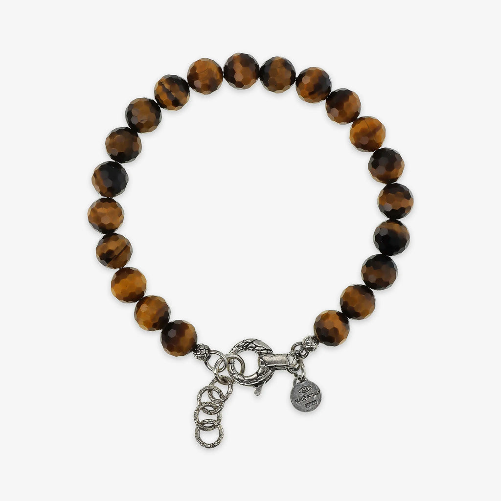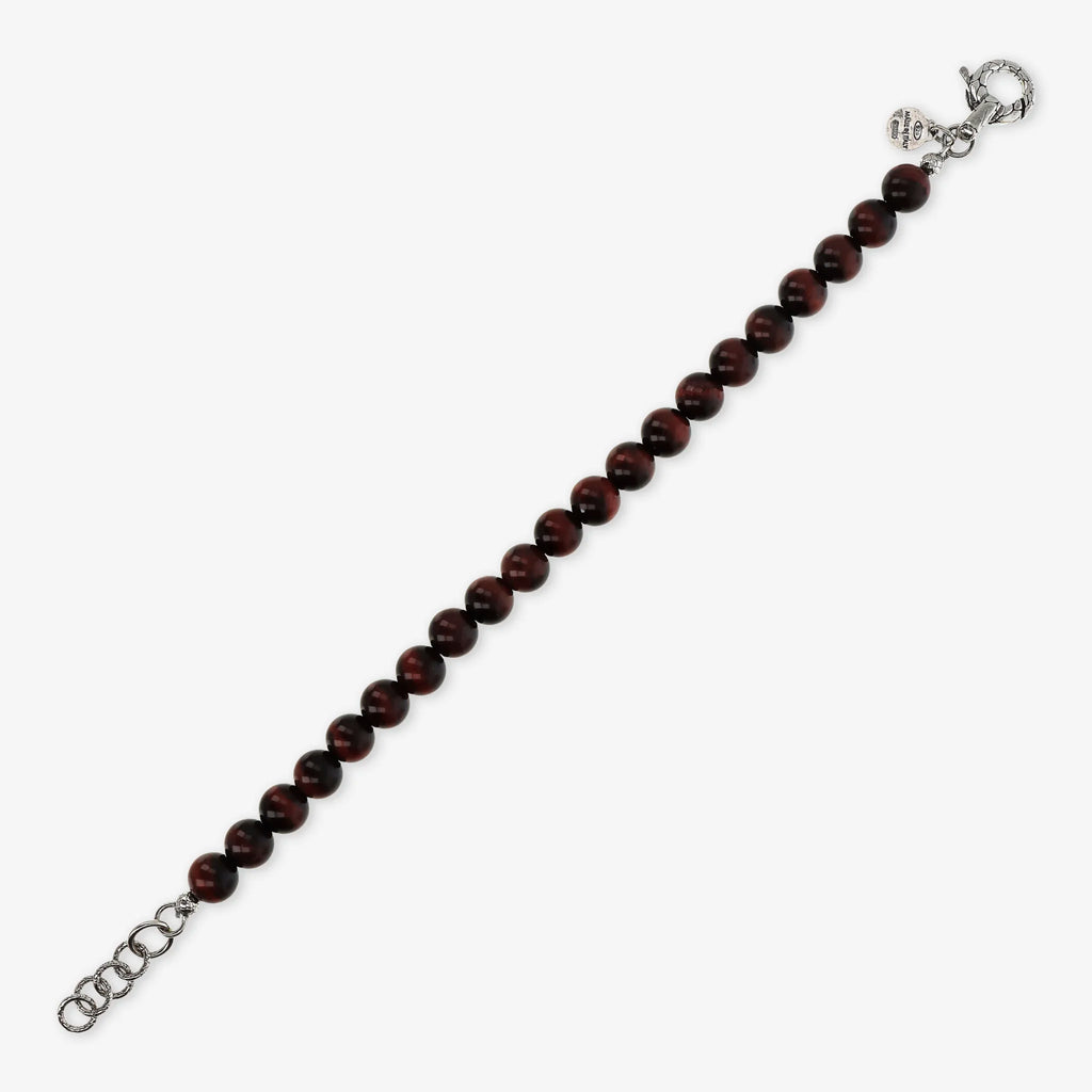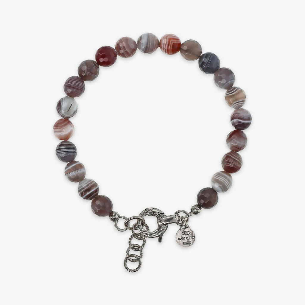 Bracciale realizzato in Argento 925 impreziosito da sfere (8 mm) in pietra naturale. Lunghezza 20+3 cm di estensione. Chiusura a moschettone con texture sirena.
