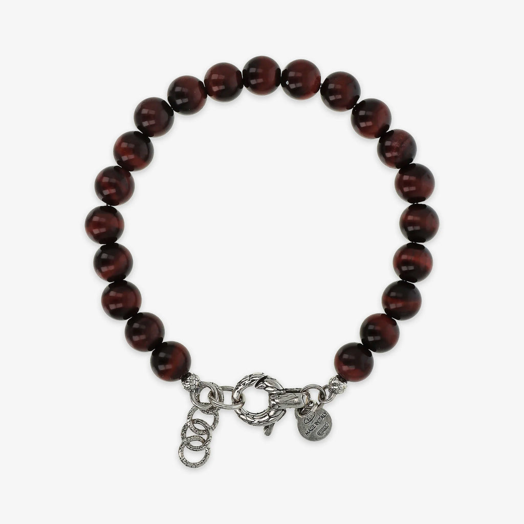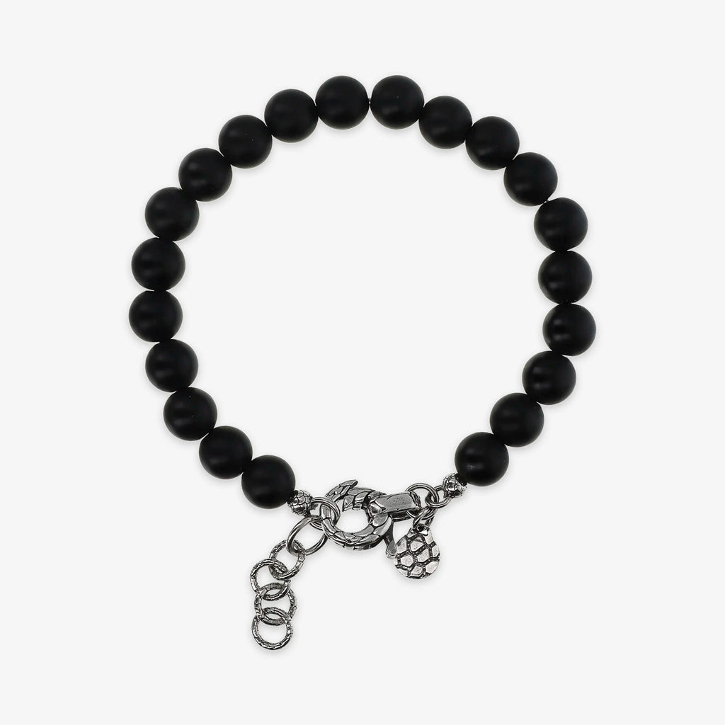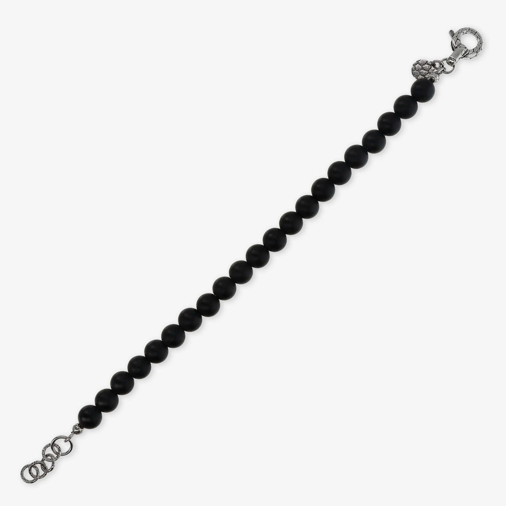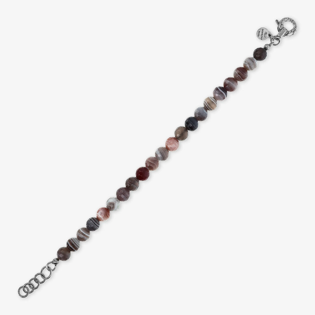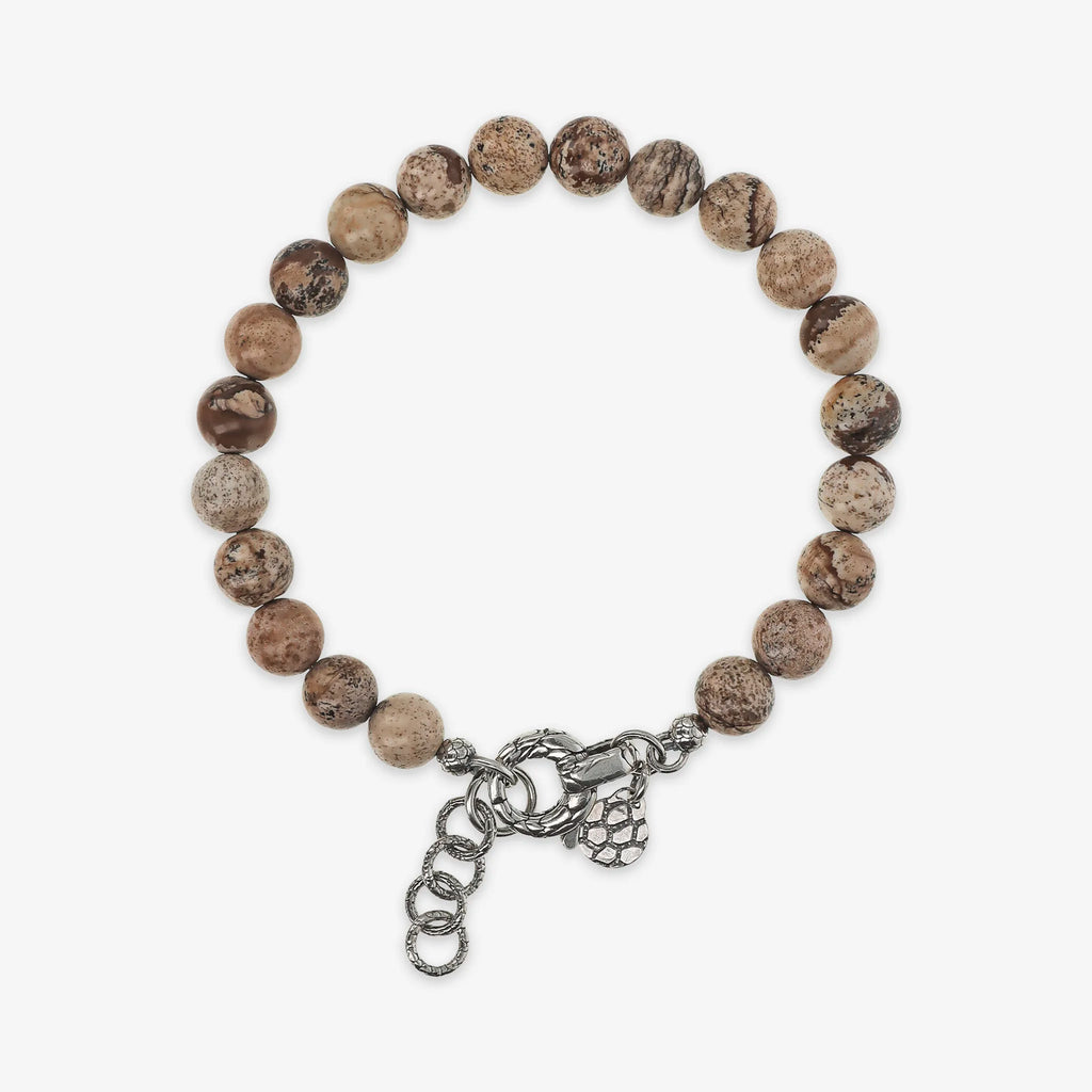 Bracciale realizzato in Argento 925 impreziosito da sfere (8 mm) in pietra naturale. Lunghezza 20+3 cm di estensione. Chiusura a moschettone con texture sirena.