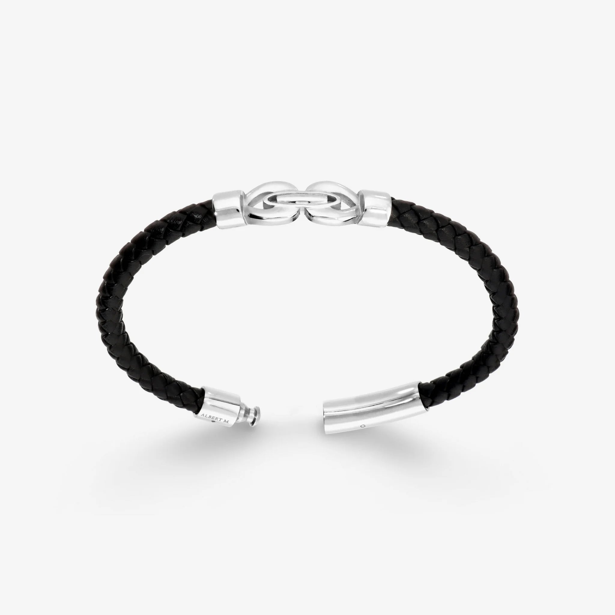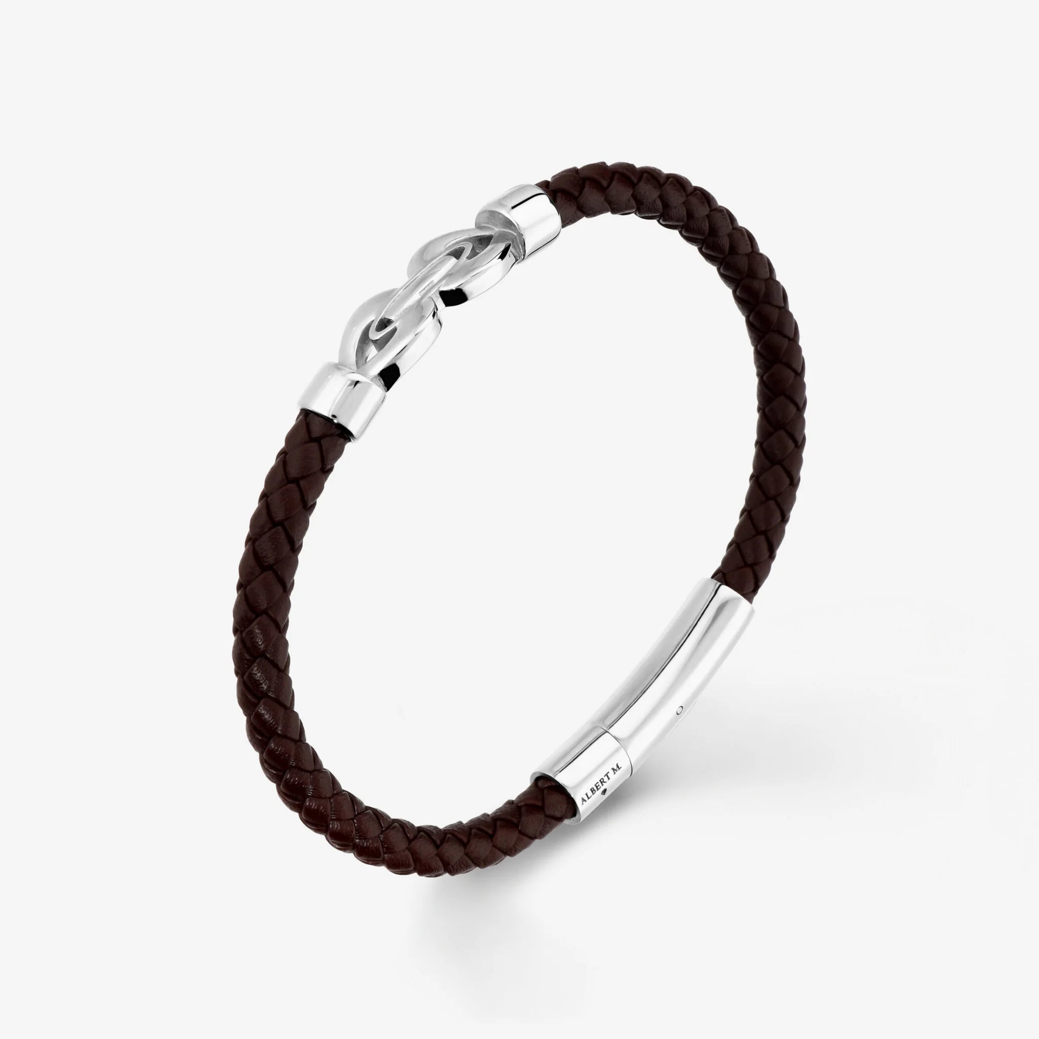 Bracciale Albert M. realizzato con cordino in pelle intrecciato ed elemento a forma di infinito. Chiusura a incastro in acciaio.
