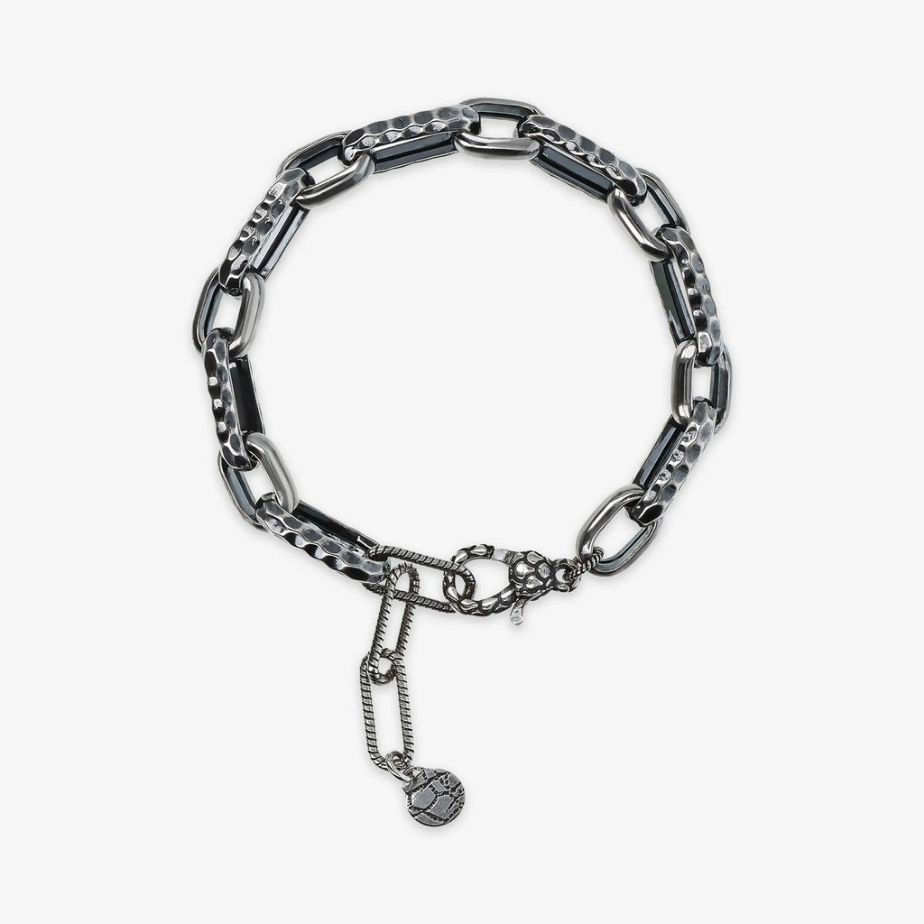 Bracciale donna Albert M. realizzato in Argento 925 con maglie rettangolari lisce alternate a maglie ovali dalla superficie lavorata. Lunghezza 17+4 cm di estensione. Chiusura a moschettone texture sirena.