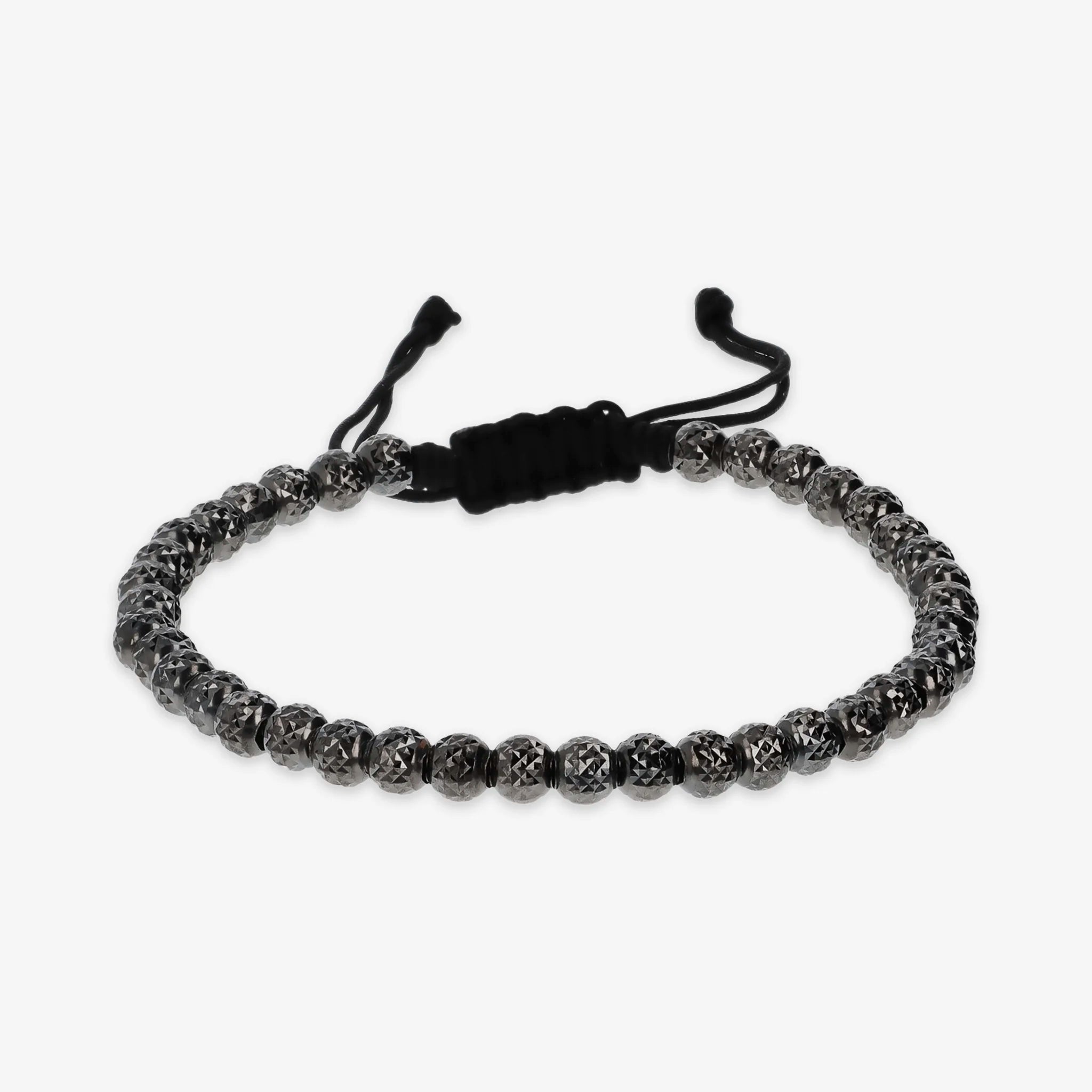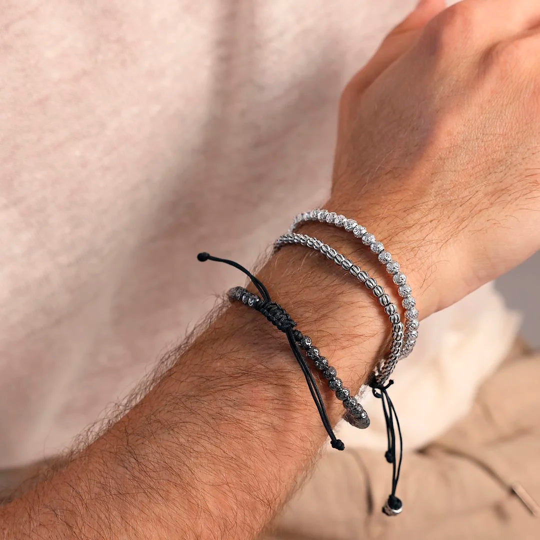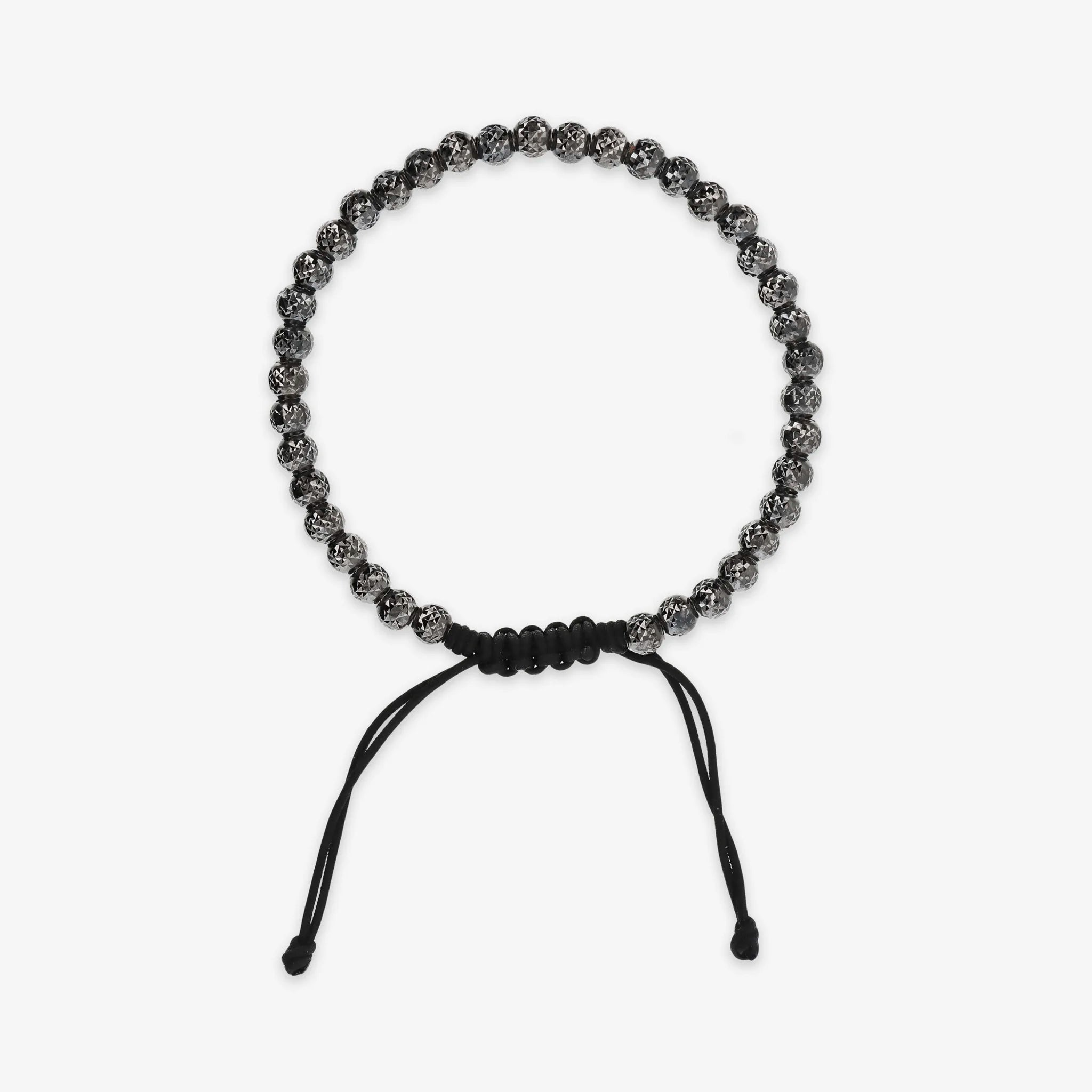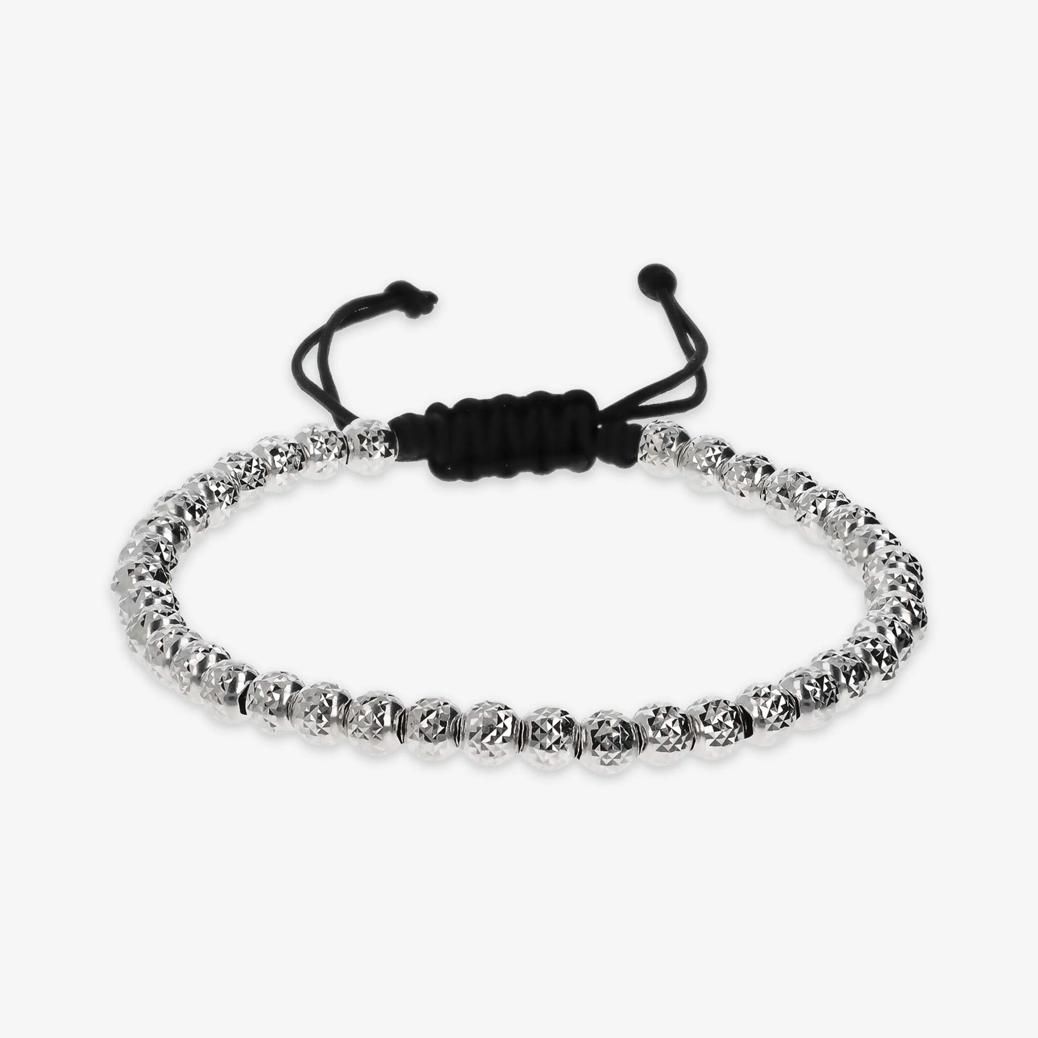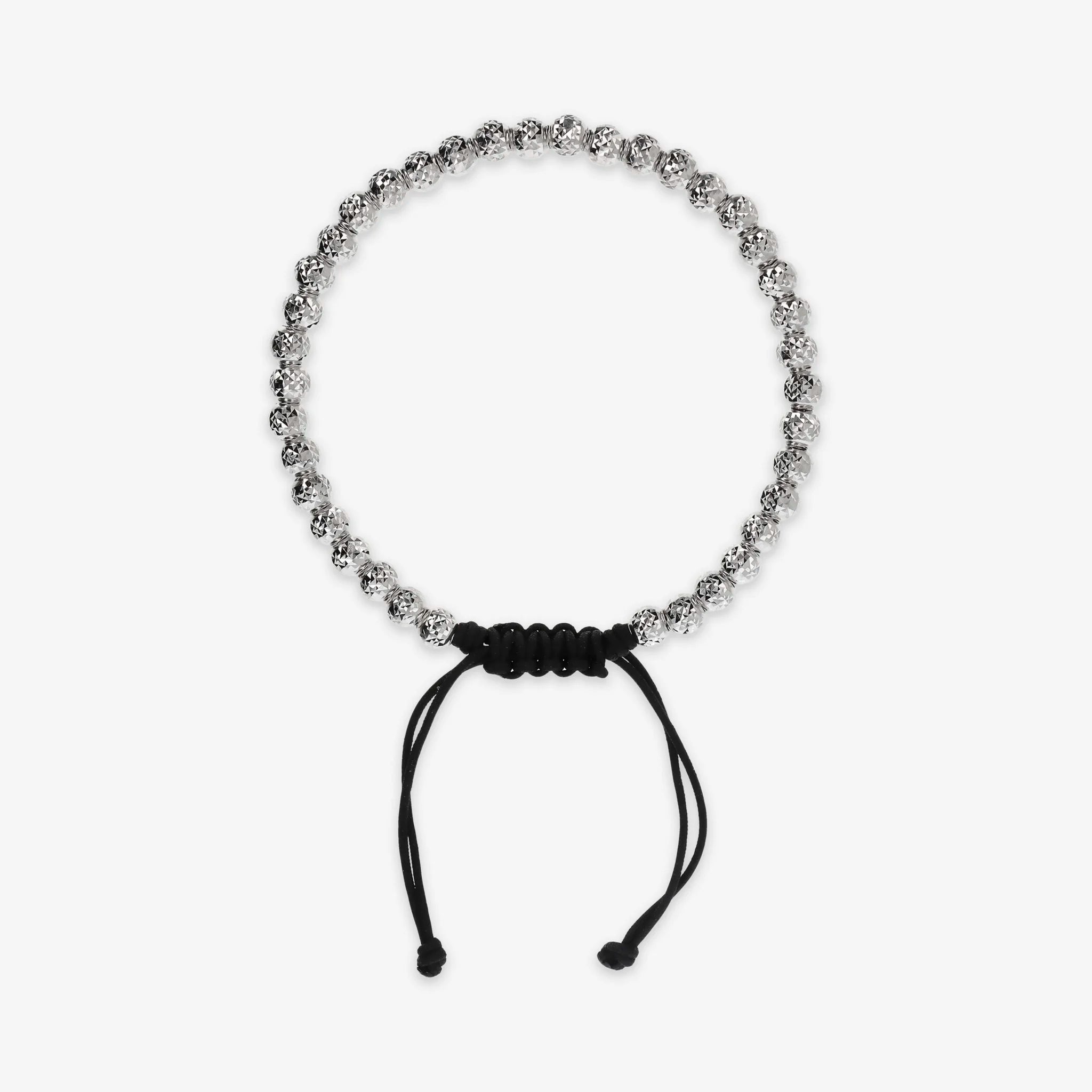 Bracciale uomo Albert M. con bead martellate (4.5 mm) in Argento 925. Chiusura a scorrimento regolabile con cordino in cotone. Disponibile con placcatura in Rodio e in Rutenio.
