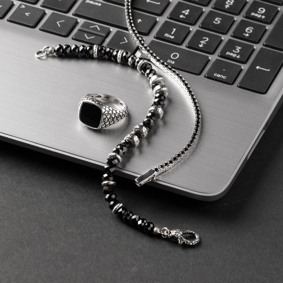 Bracciale tennis Albert M. in Argento 925, placcato Rodio, impreziosito da spinelli neri sfaccettati o da cubic zirconia (4 mm). Chiusura a cassetta.